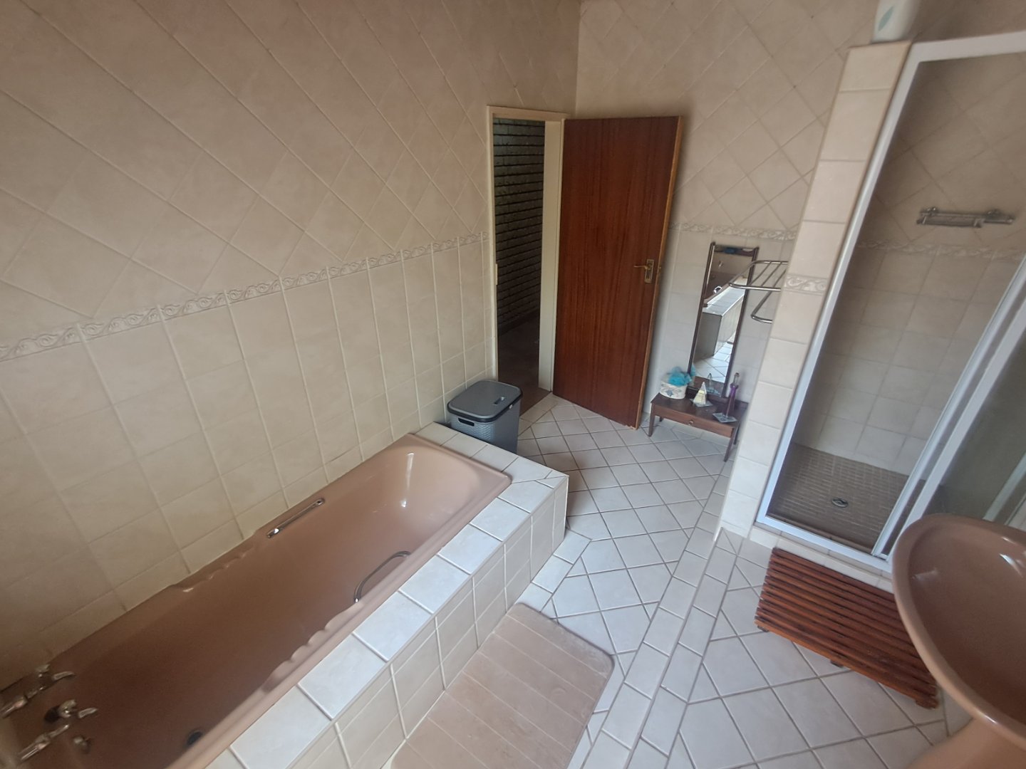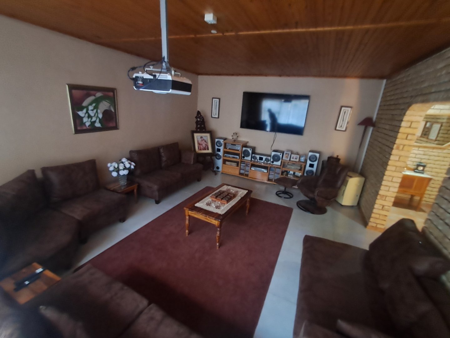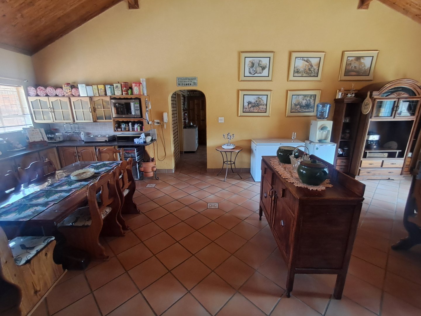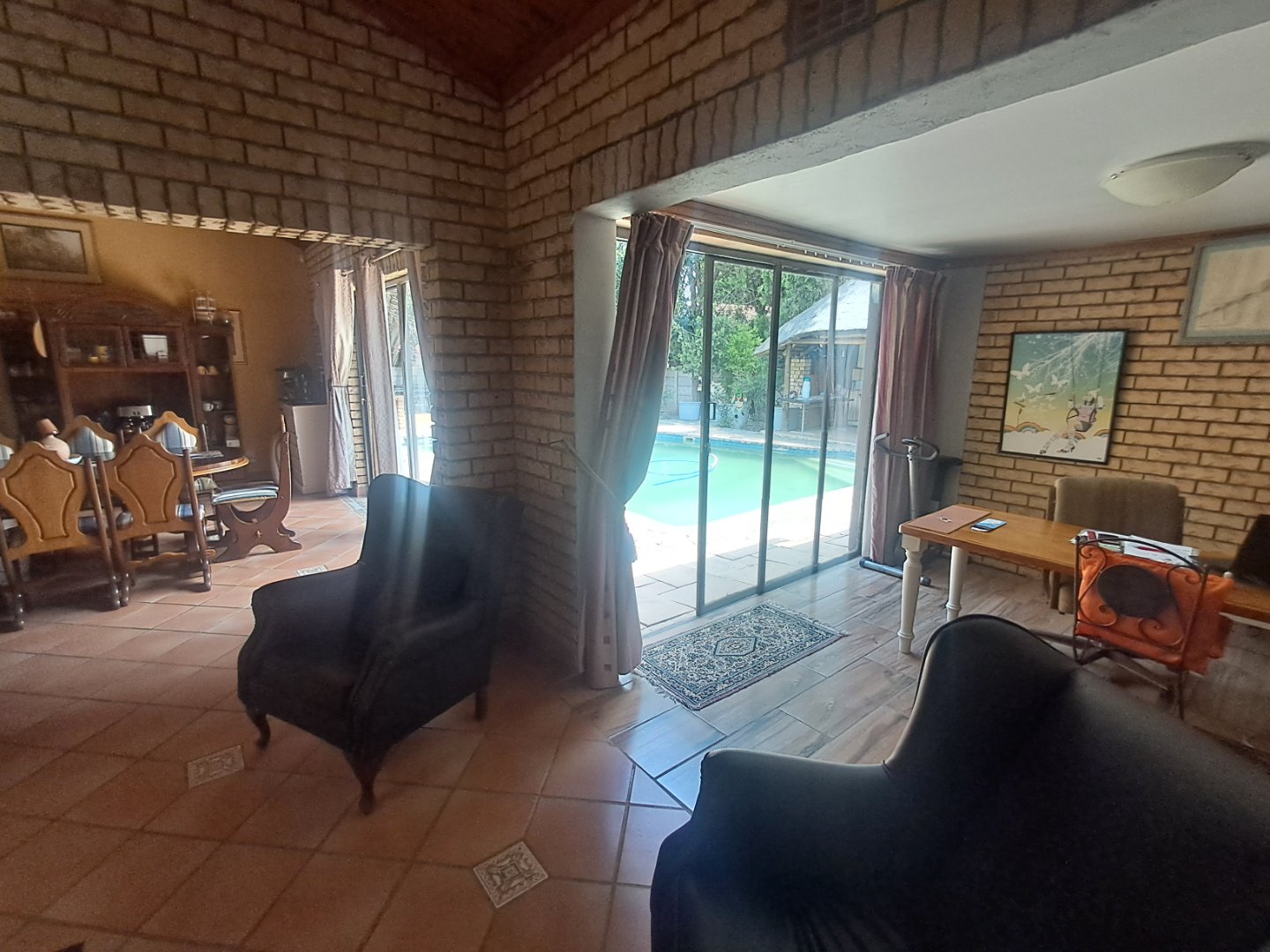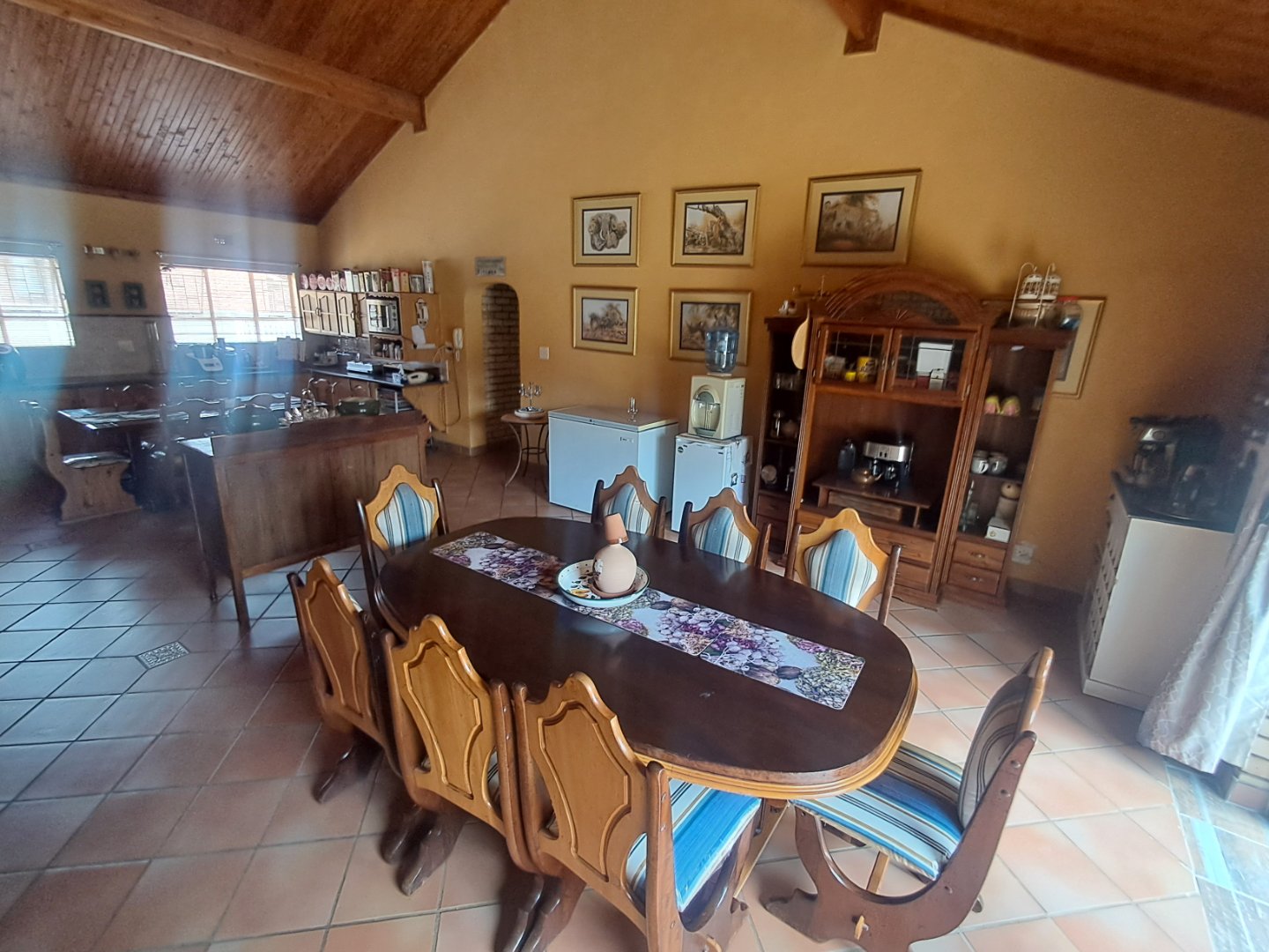* Open kitchen and dining area with wooden cupboards, pine ceilings, and sliding doors to the pool area