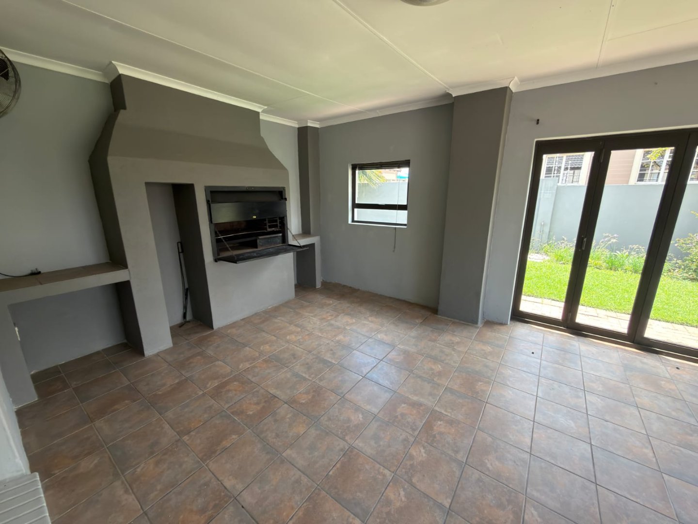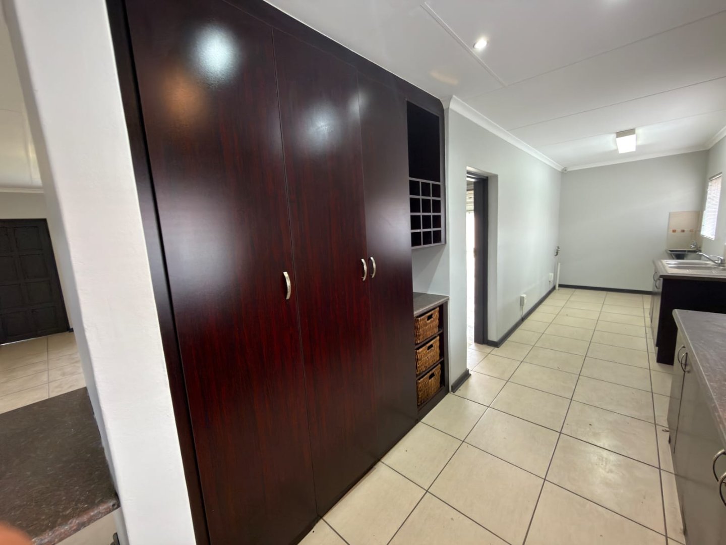 The spacious open-plan kitchen is beautifully designed with ample cupboard space and a stylish built-in wine rack—perfect for the wine enthusiast, a stove and hob, an extractor fan, and an air-conditioner for added comfort. A scullery and a convenient hallway closet further enhance functionality. The kitchen flows seamlessly into the generous living area, which opens directly into the enclosed entertainment area—complete with a built-in braai—making it perfect for effortless hosting and relaxed indoor-outdoor living.
