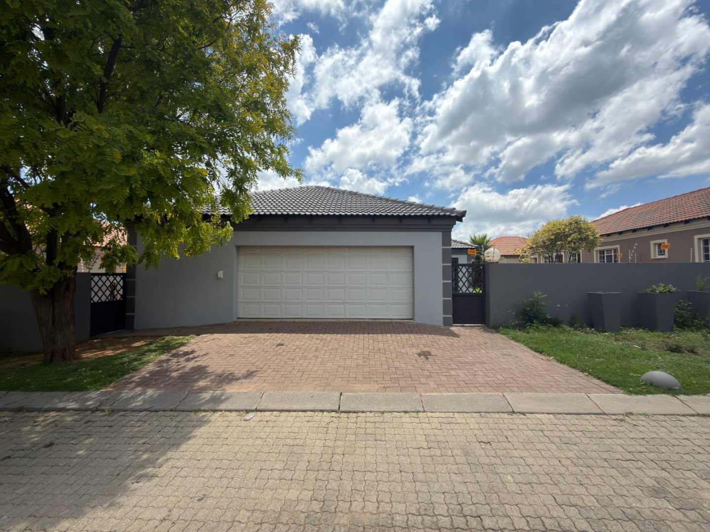 The property includes a double garage with an electric door and built-in cupboards, as well as a prepaid electricity meter. Outside, the home features a sprinkler system, two alarm systems, security beams, burglar bars, safety gates, and an electric fence for complete peace of mind.