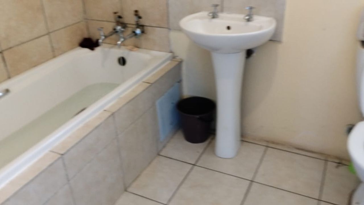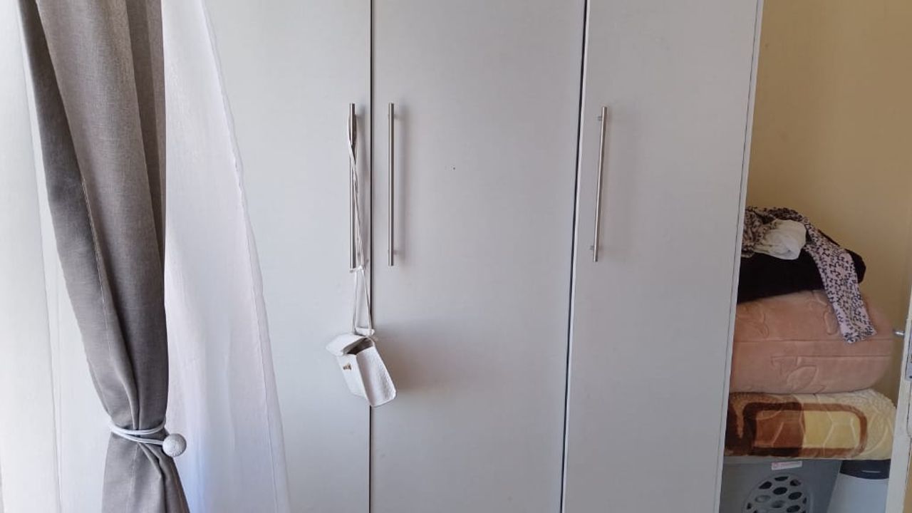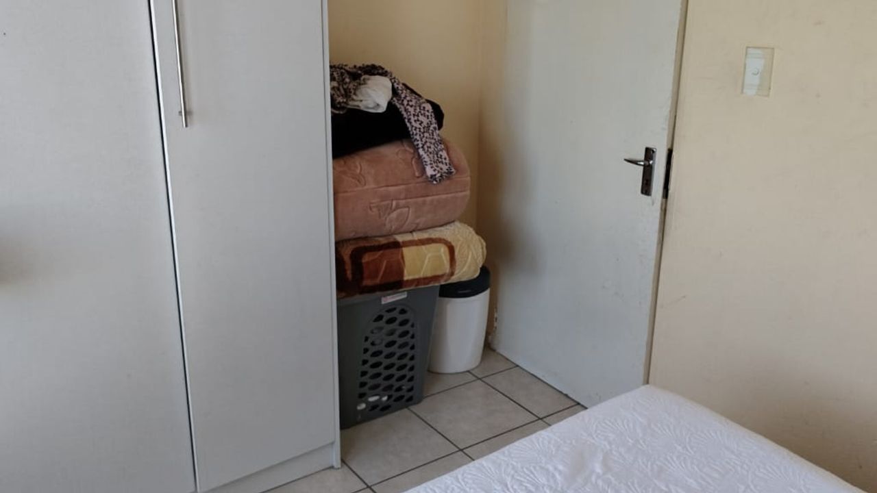 There are two bedrooms, each with built-in cupboards and tiled floors, providing ample storage and a sleek look. The bathroom is equipped with a bath, toilet, and basin.