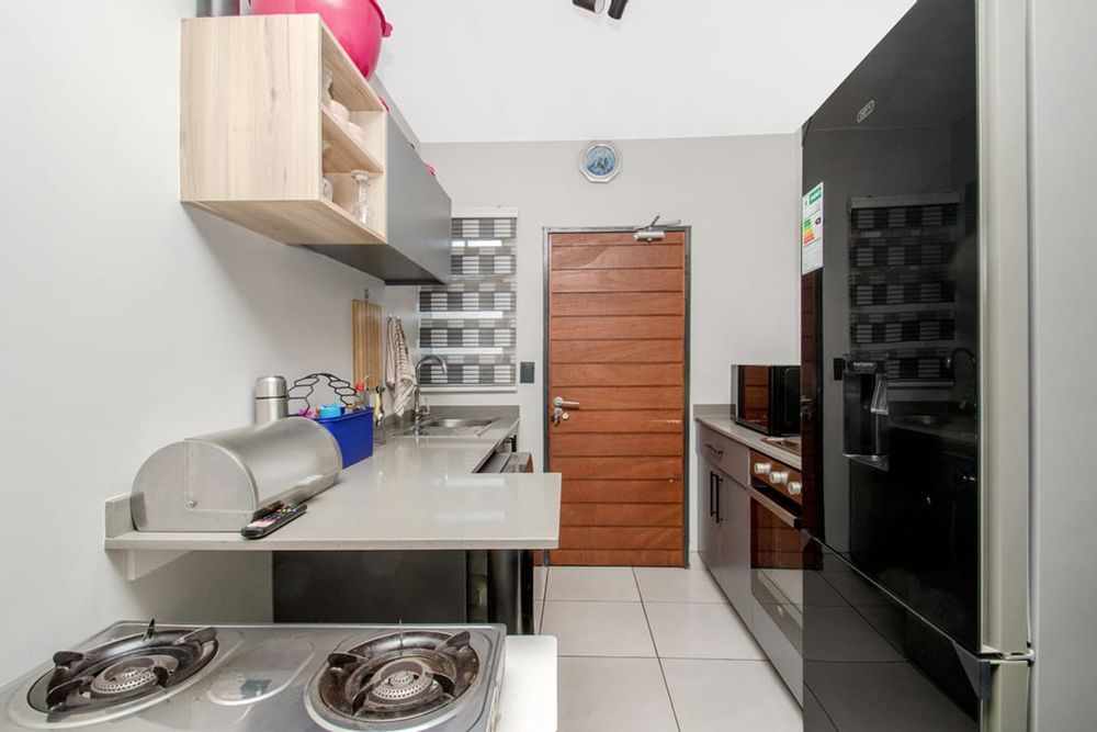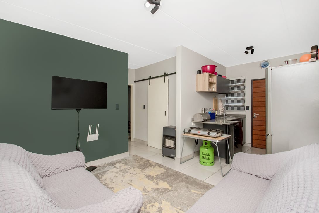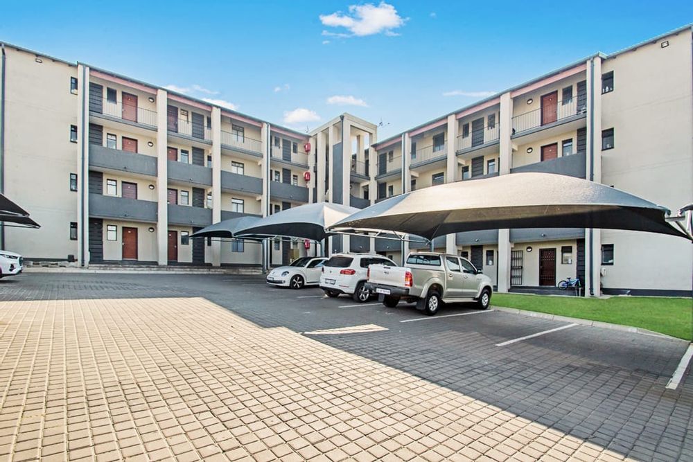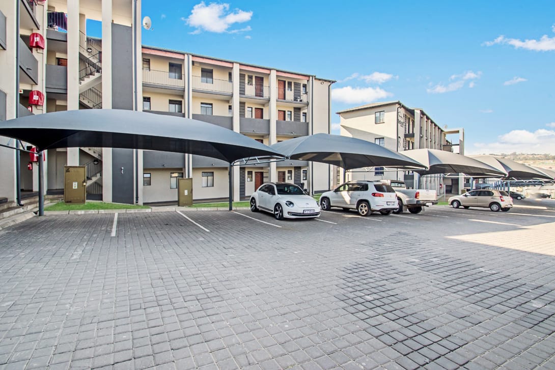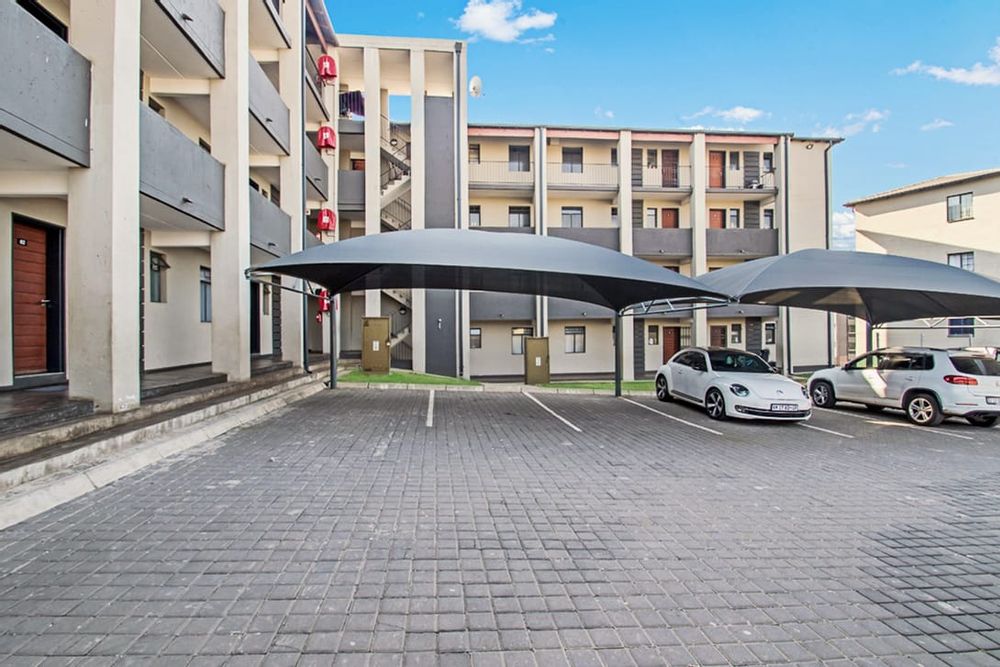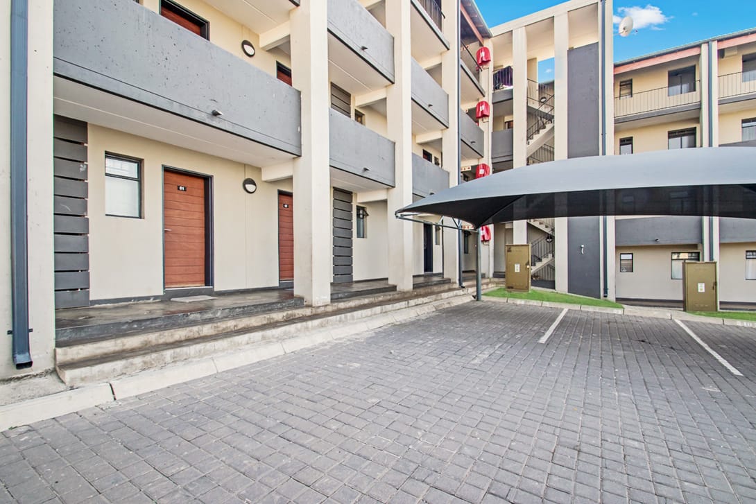 The home features an open-plan lounge and a sleek, modern kitchen with stylish porcelain tiles throughout the living area. There are two well-sized bedrooms with tiled floors, and the main bedroom includes built-in cupboards. The bathroom has been tastefully renovated with quality finishes. The unit includes one covered parking bay and one open parking space. Ideal for first-time buyers, small families, or investors seeking a secure, lock-up-and-go property.