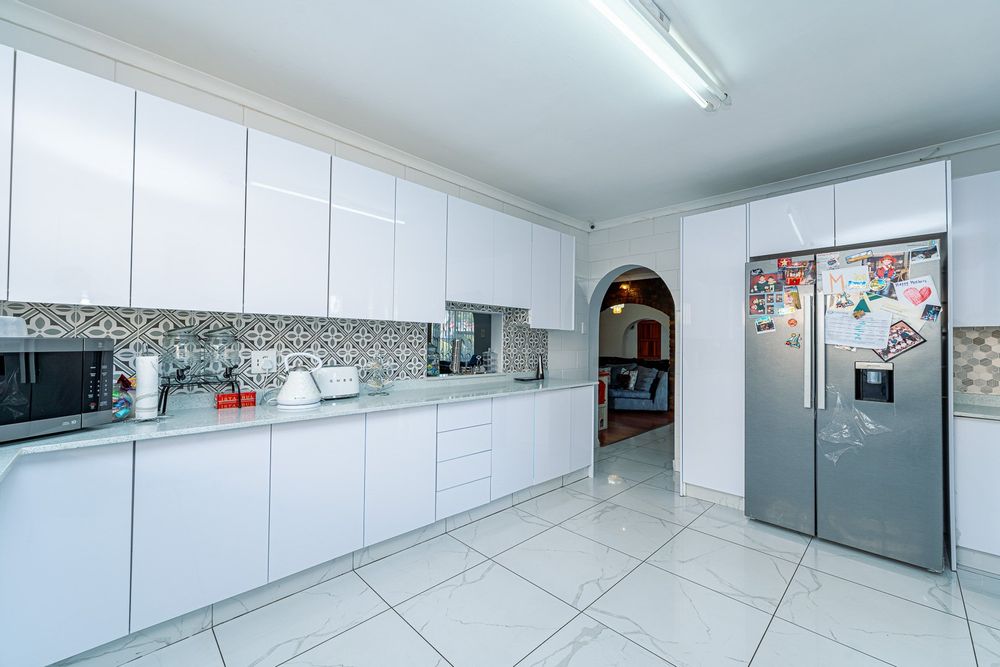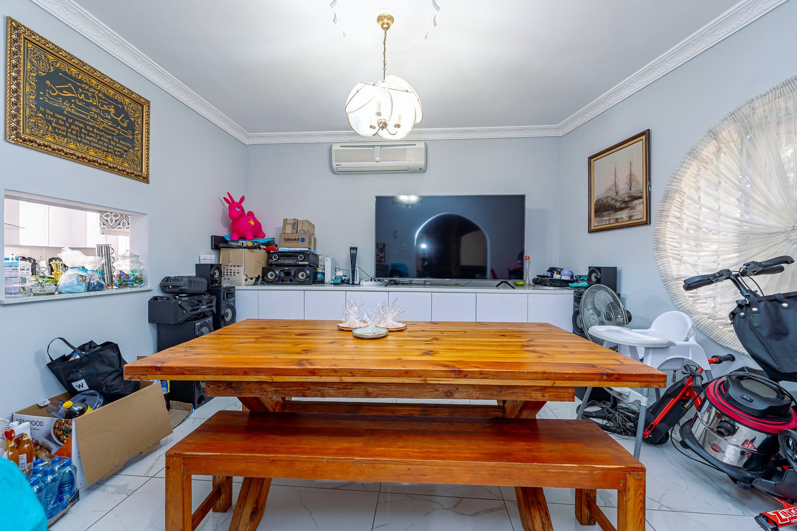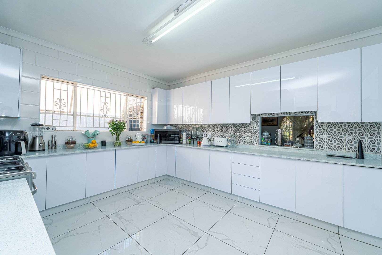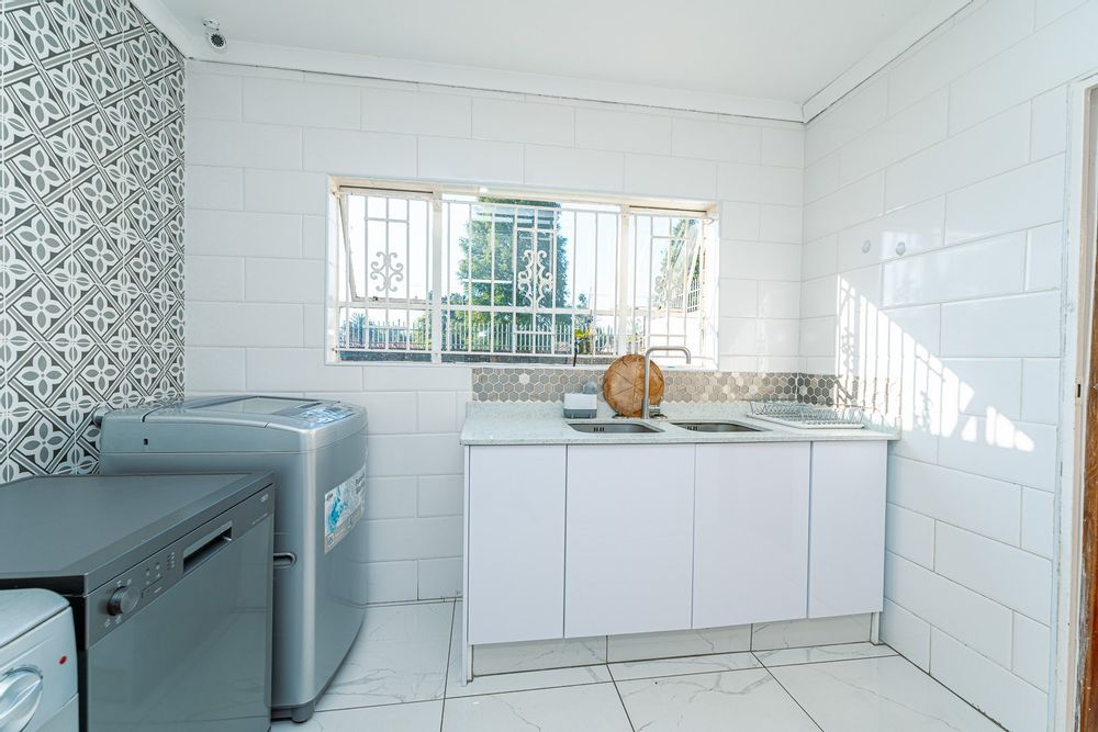 The kitchen is a true centerpiece — bright and beautifully finished with quartz countertops, a five-plate gas burner, a large oven, and a generous scullery with space for three appliances. A spacious dining room with fitted cupboards and melamine finishes completes the heart of the home — perfect for hosting and entertaining.