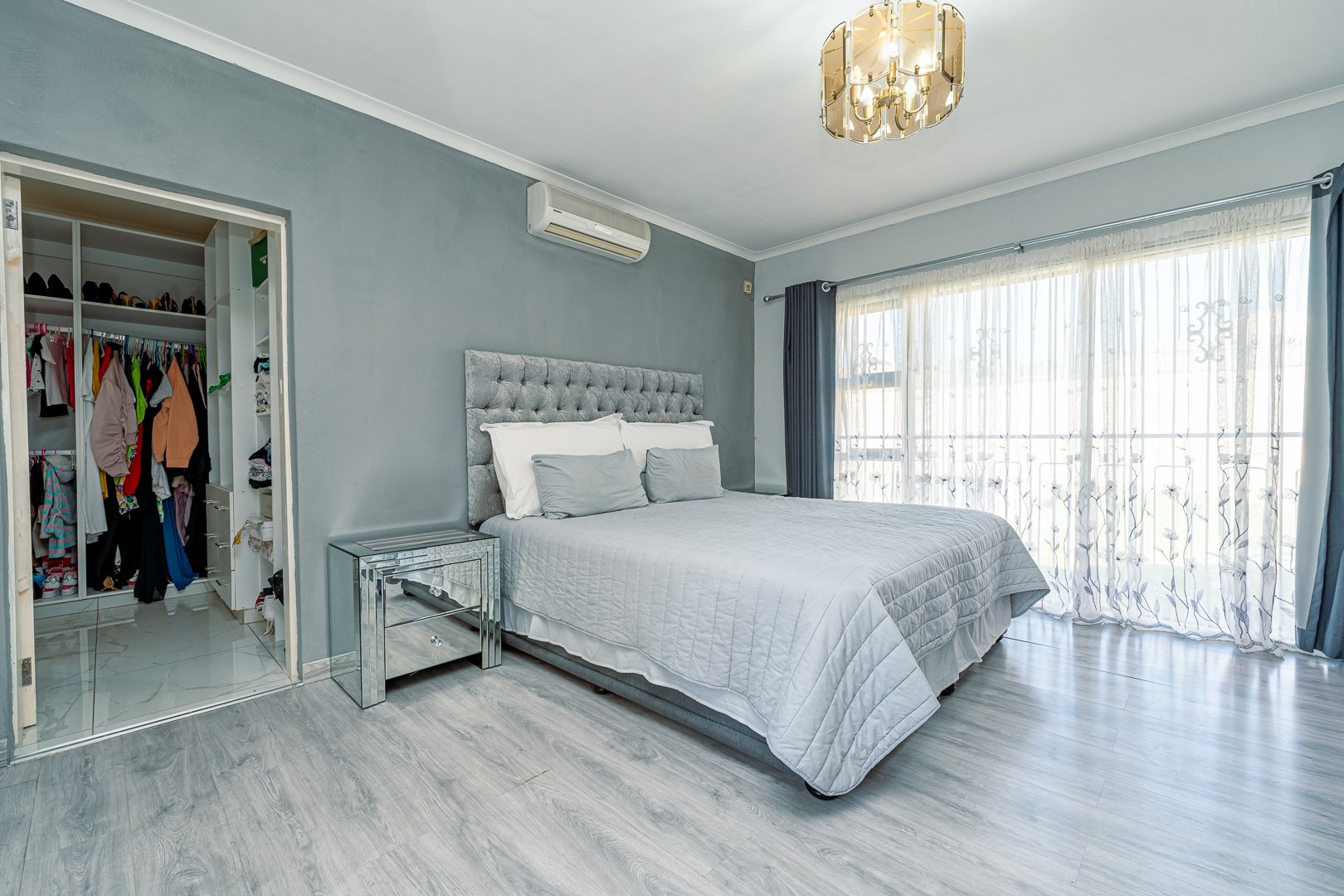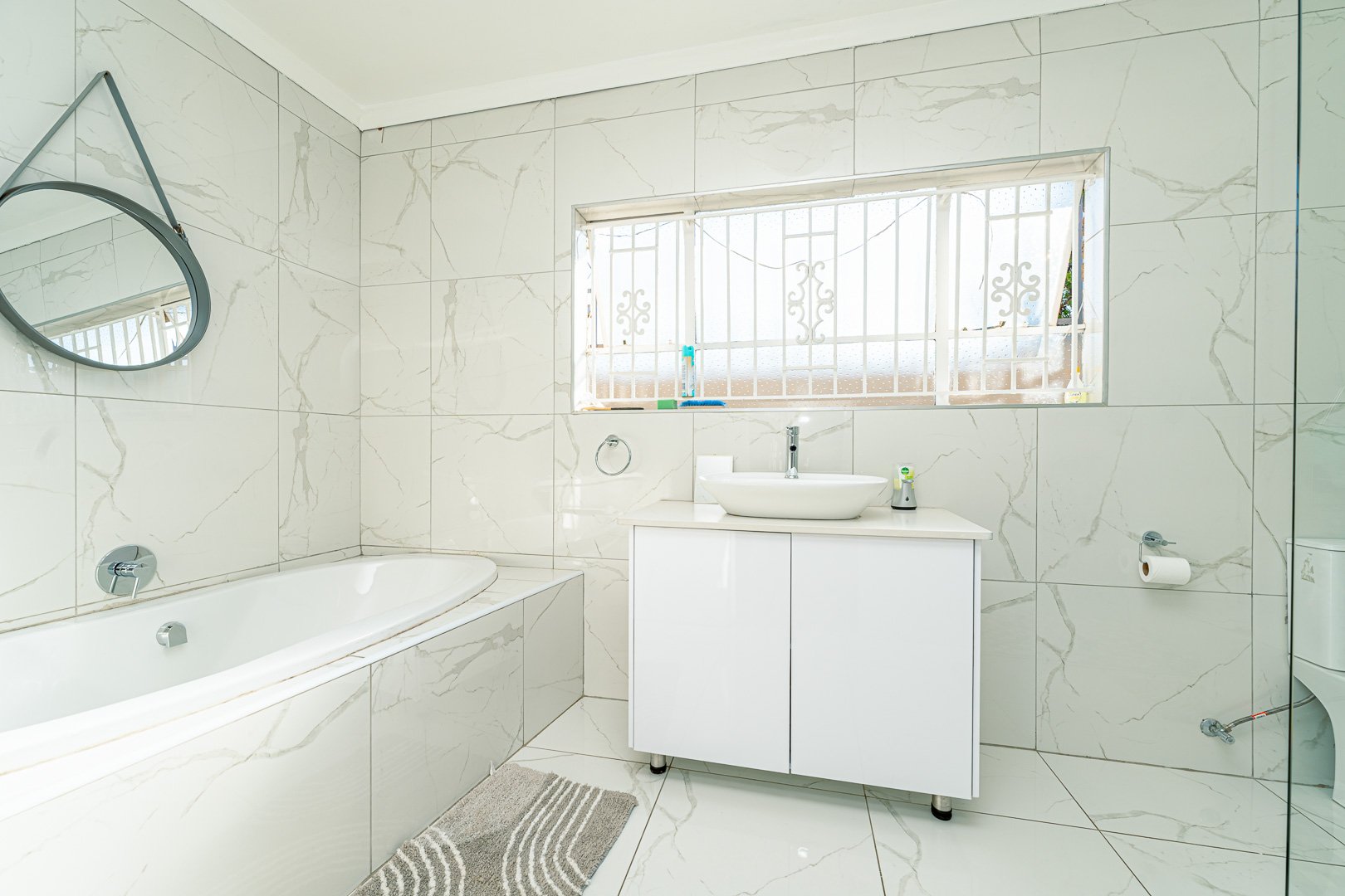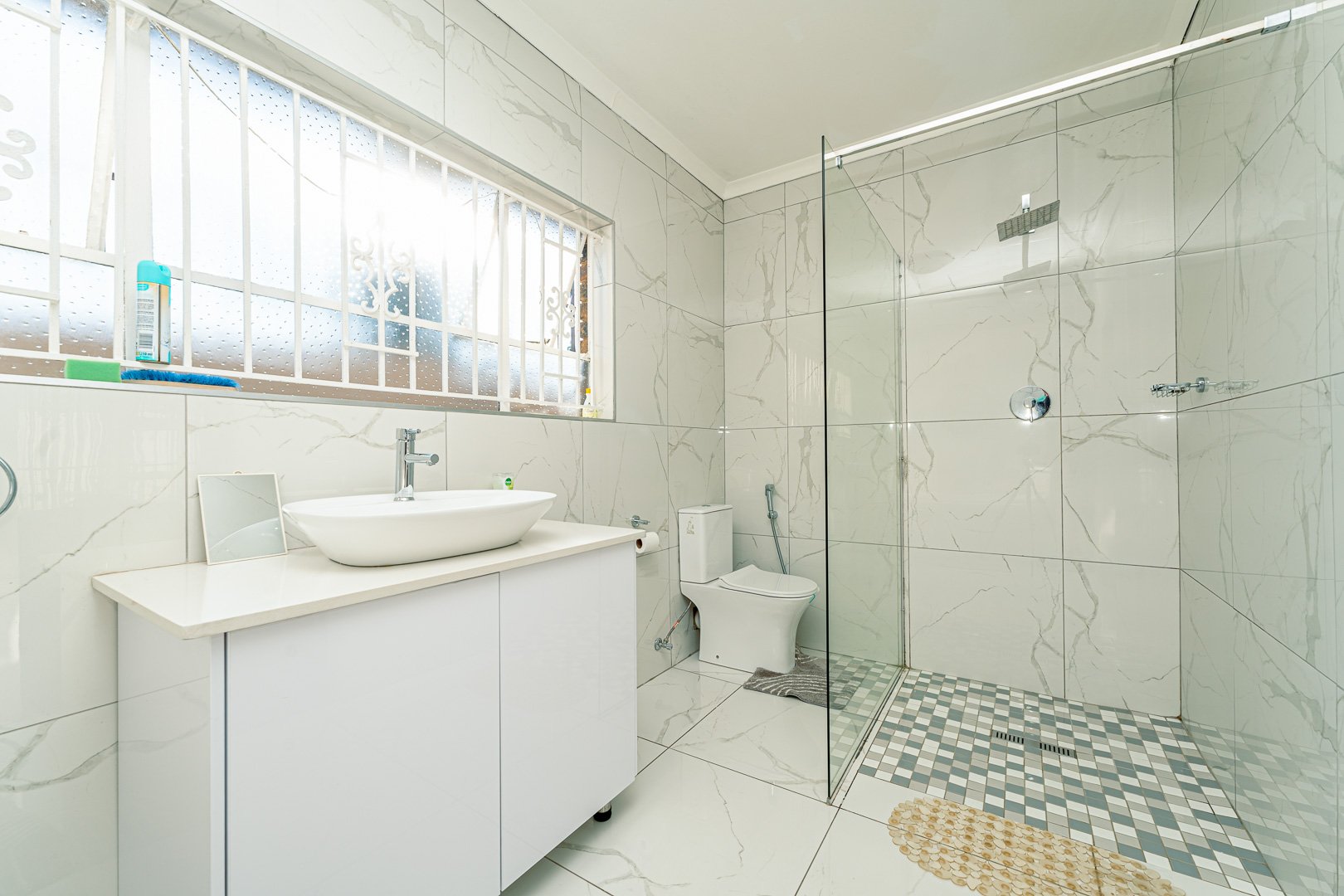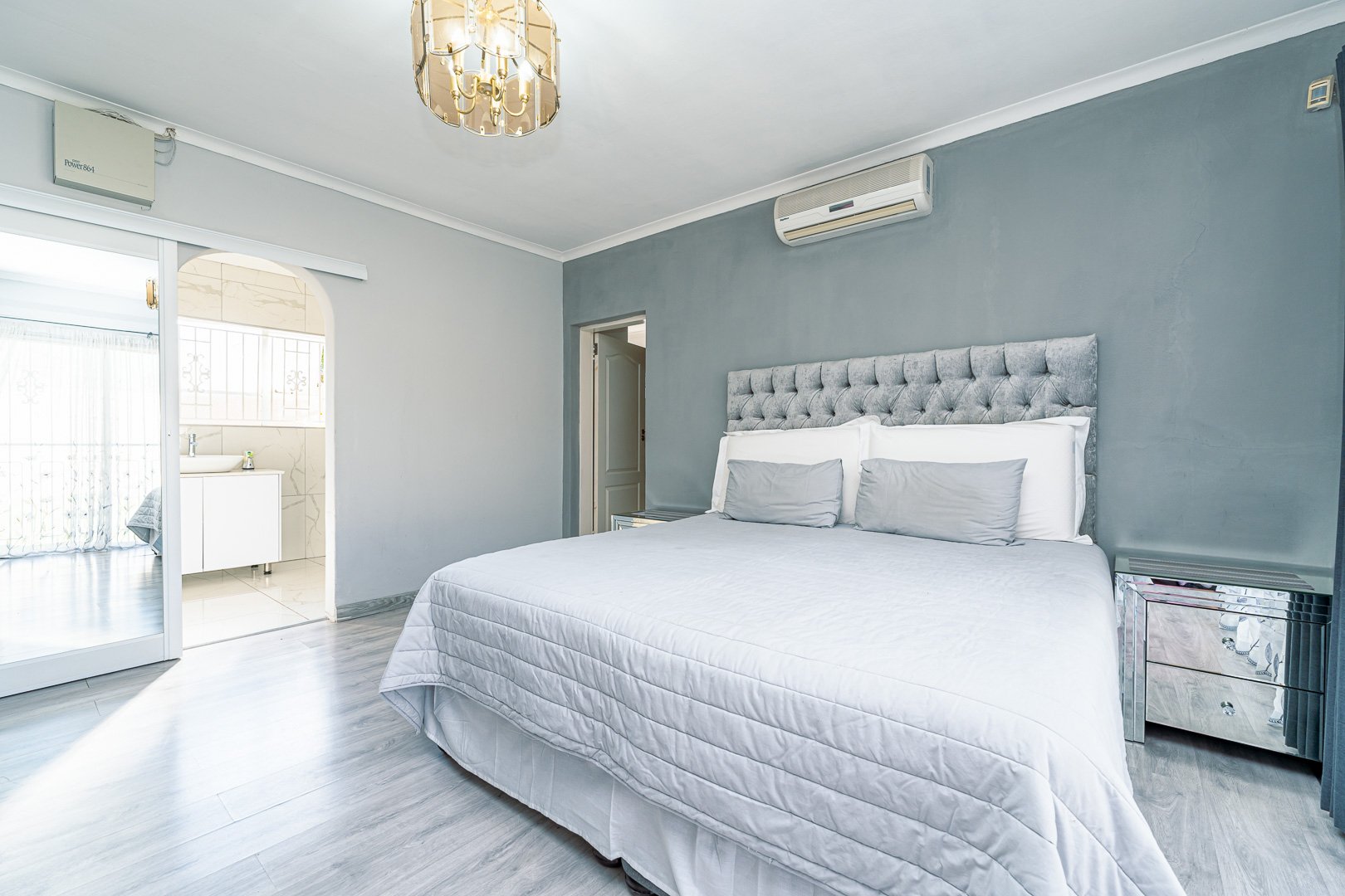 Accommodation includes three generous bedrooms, each with ample cupboard space and updated fittings. Two full bathrooms service the home, with the master suite offering a luxurious ensuite bathroom and a walk-in wardrobe.