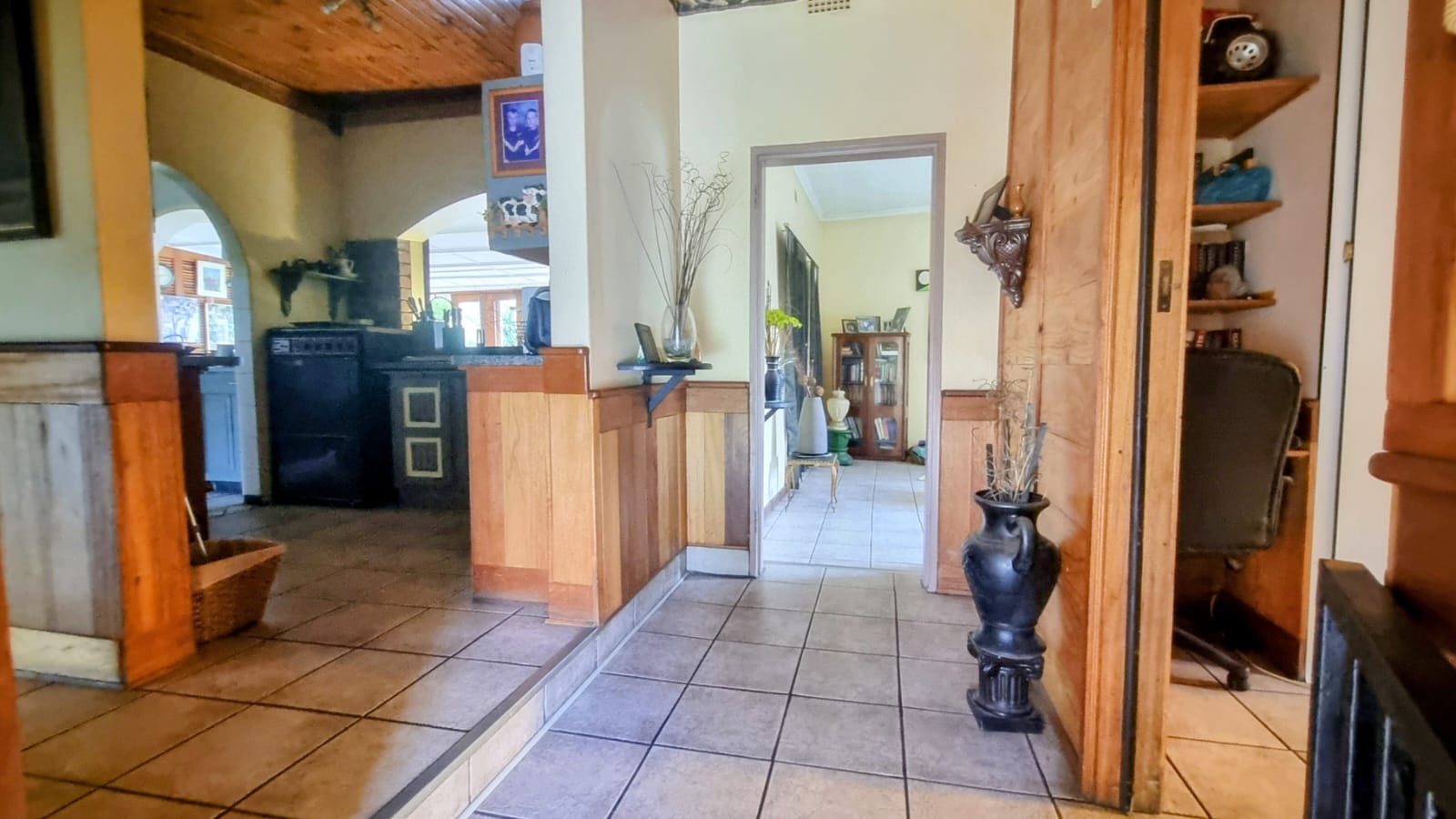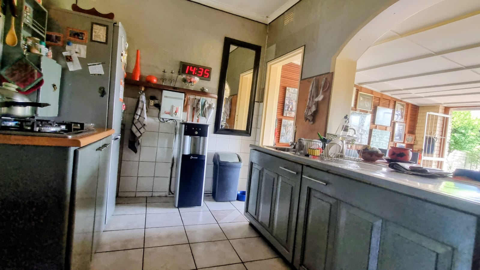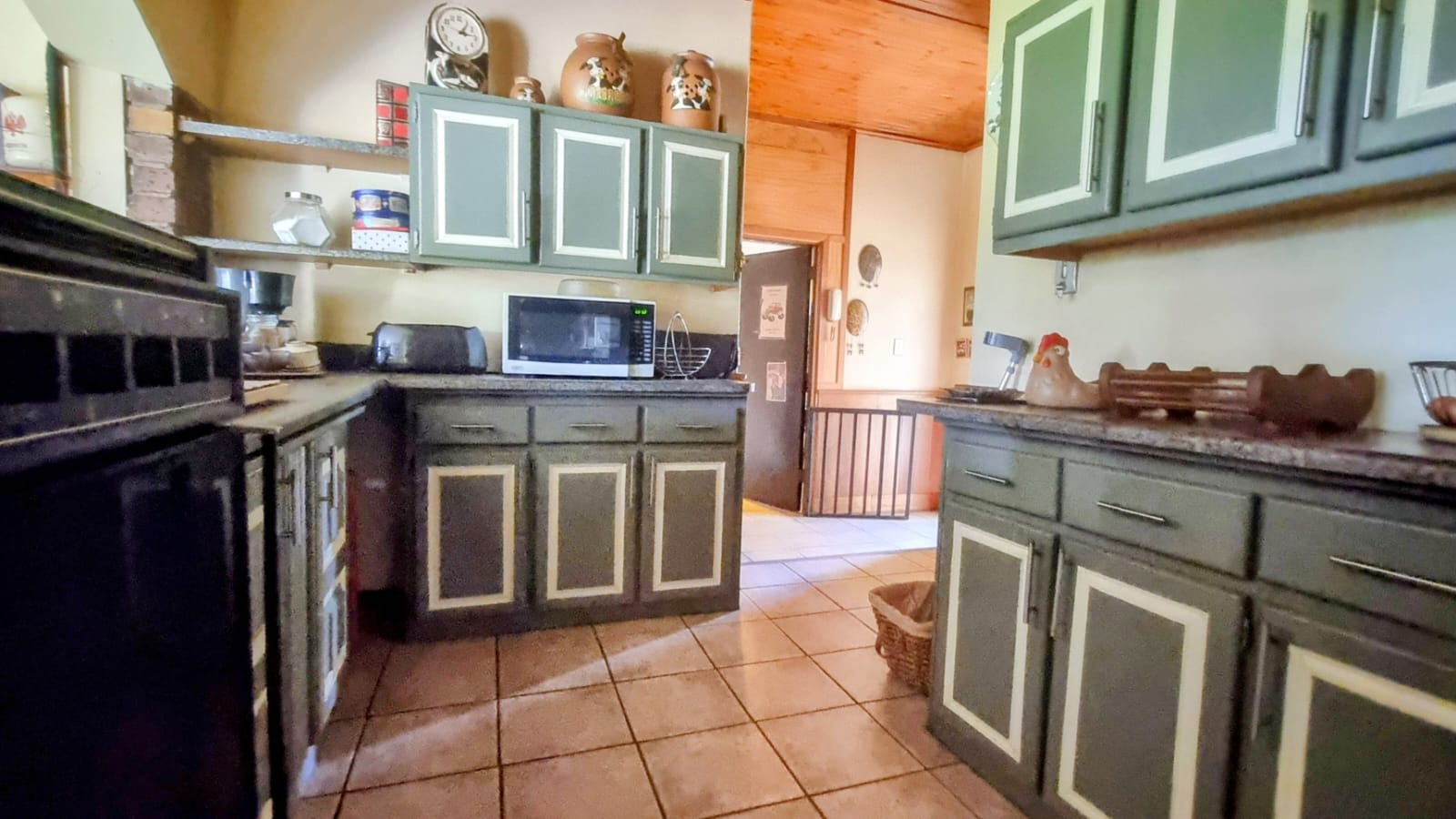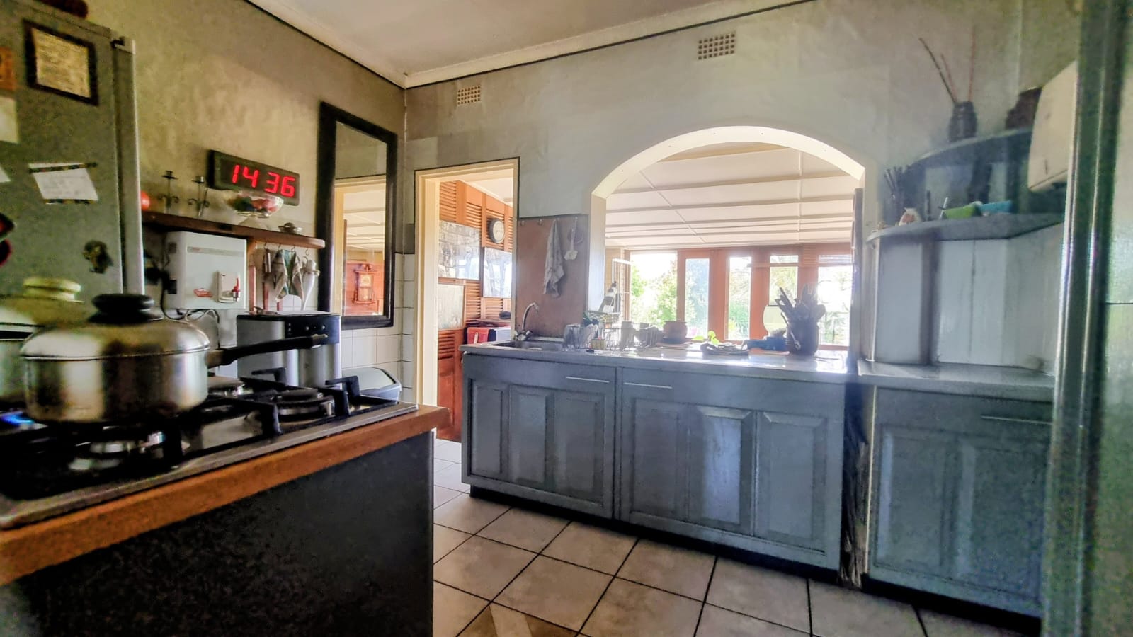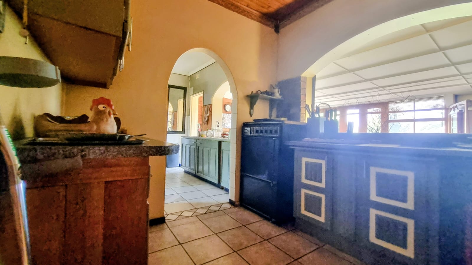 The kitchen has wooden, built-in cupboards providing ample storage, while a gas stove and separate oven cater to all culinary needs. A separate scullery, also equipped with built-in cupboards, adds convenience. Tiled floors ensure easy cleaning and durability.