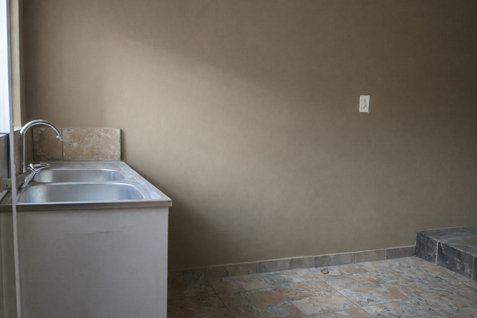 The kitchen is a masterclass in functionality and style, featuring wooden, built-in cupboards with granite counter tops, an undercounter oven, and a countertop stove with an extractor fan. A separate laundry area adds convenience, while a gas geyser ensures a steady hot water supply.