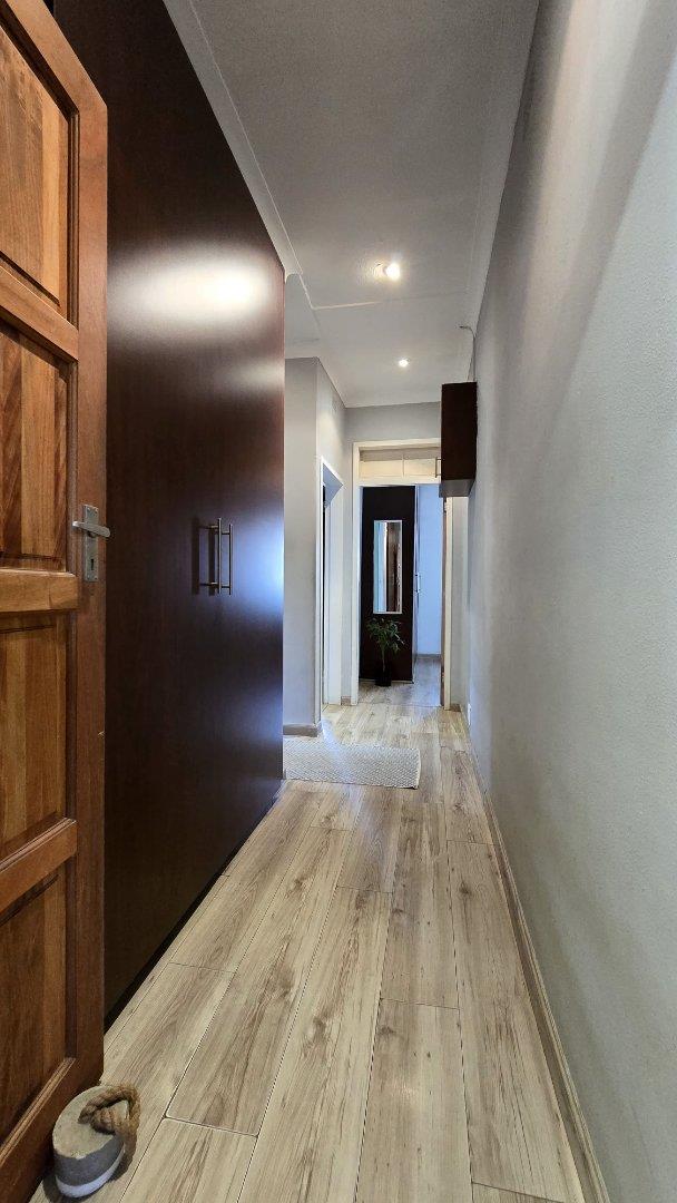 As you step inside, you'll be greeted by a spacious lounge that flows effortlessly into a dedicated dining room. This inviting space is perfect for hosting delightful dinner parties or enjoying cozy family meals. The generously-sized kitchen is a chef's dream, complete with ample storage and space for two under-counter appliances. Elegant laminated flooring runs throughout the home, complemented by stylishly tiled bathroom and kitchen areas.
