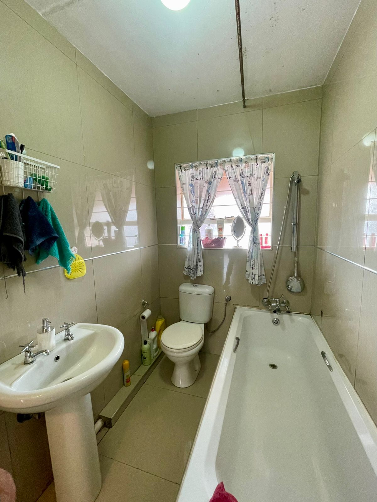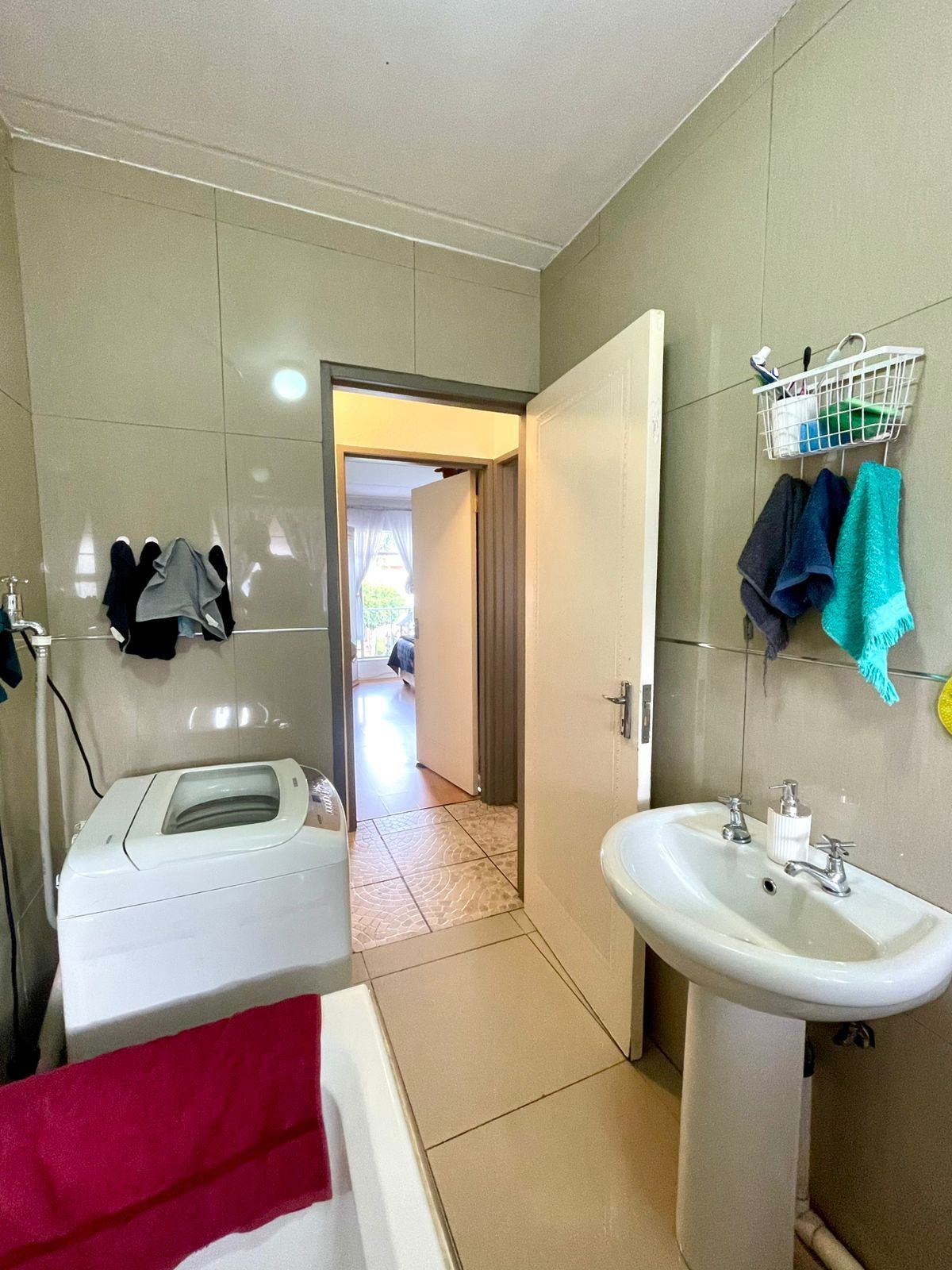 1 neat bathroom with shower-over-bath and a washing machine connection