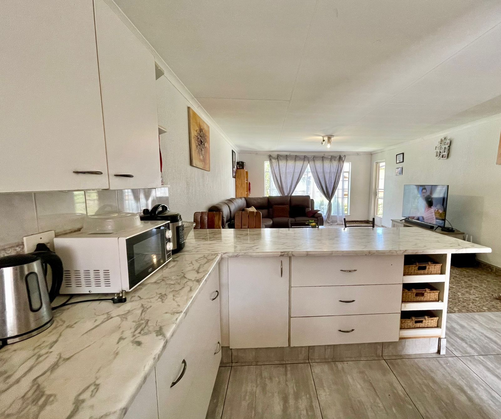 Open-plan kitchen fitted with white granite countertops, sleek cupboards, and glossy tiles that sparkle
