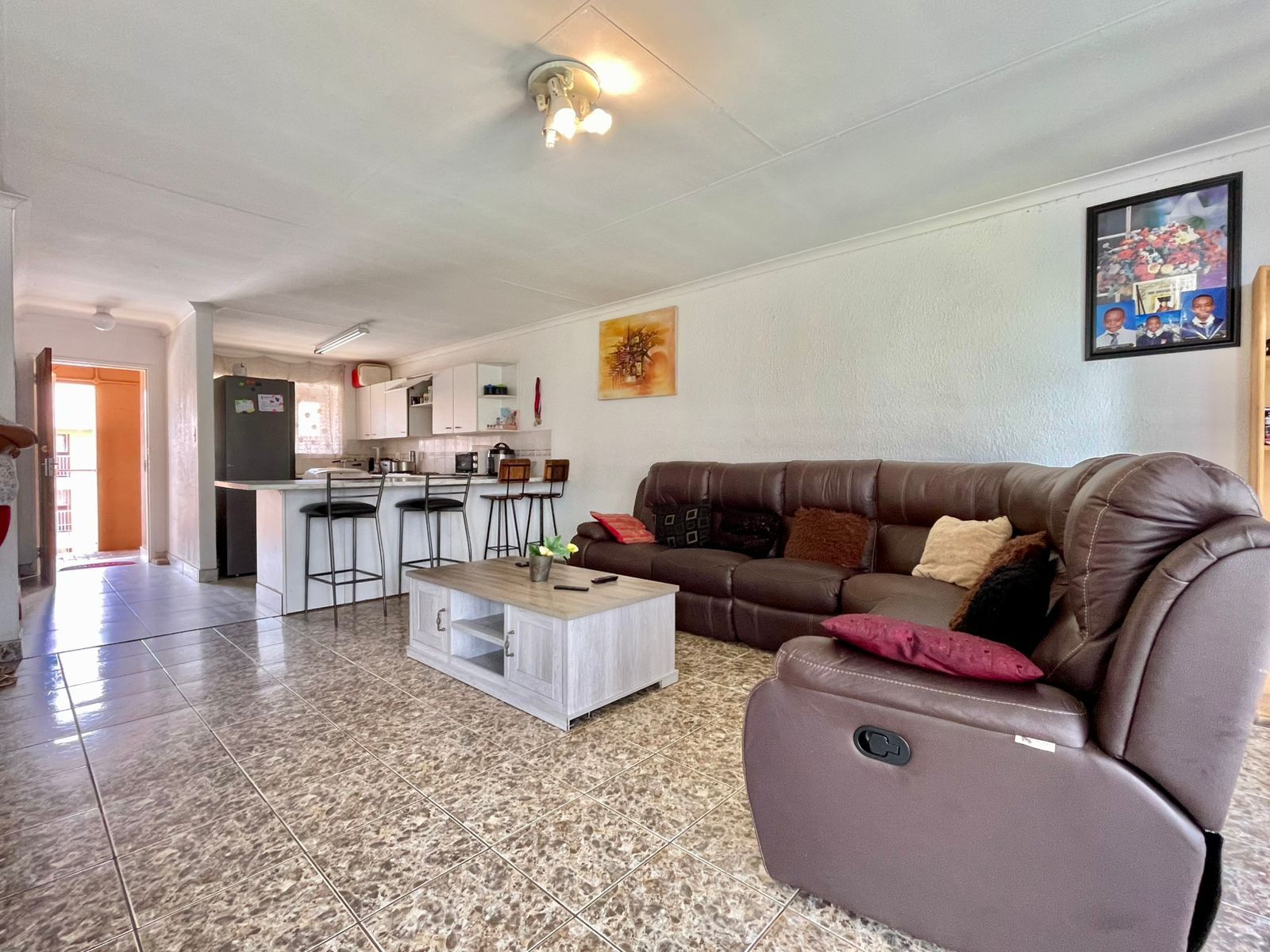 The space flows into a beautifully tiled lounge terrace, bathed in natural light