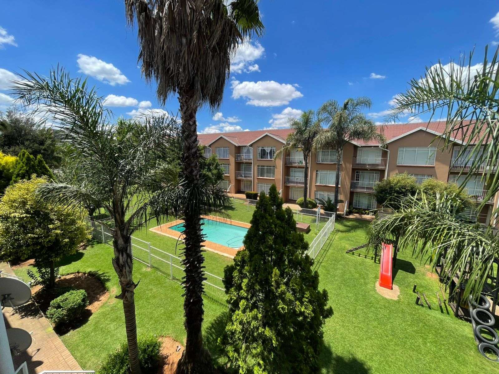 The communal garden feels like a private resort — surrounded by tall, tropical trees