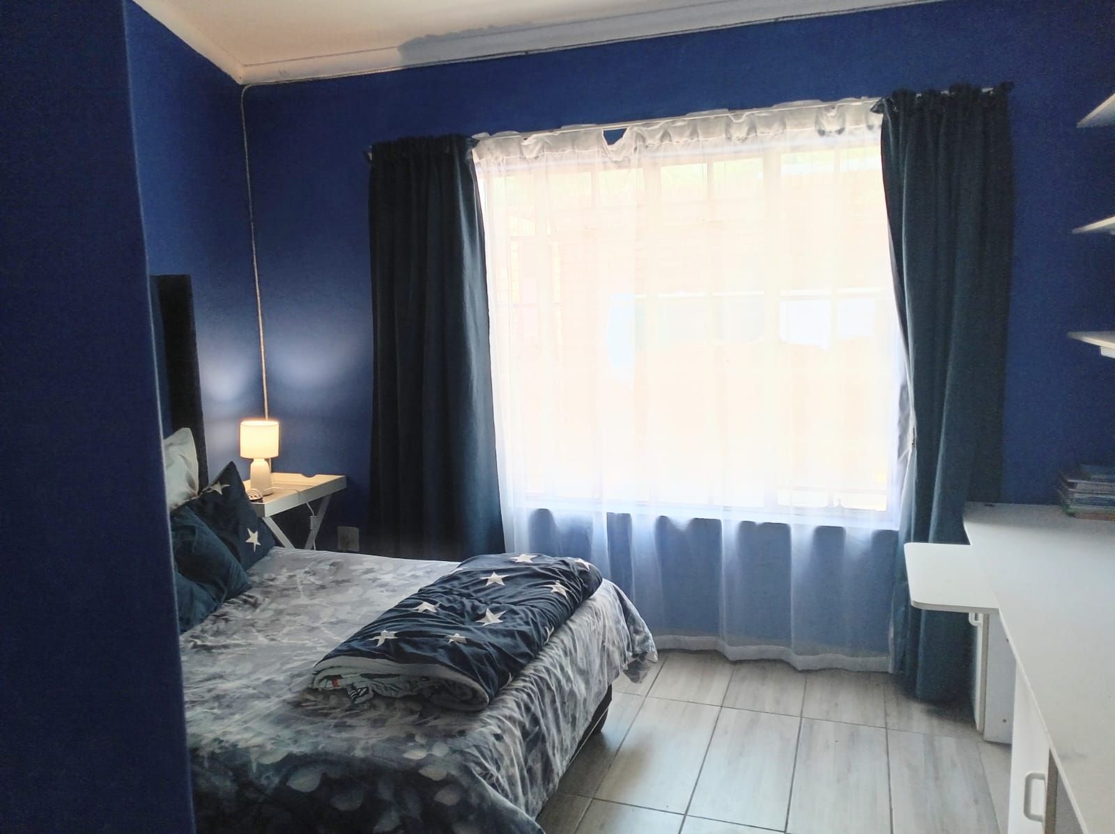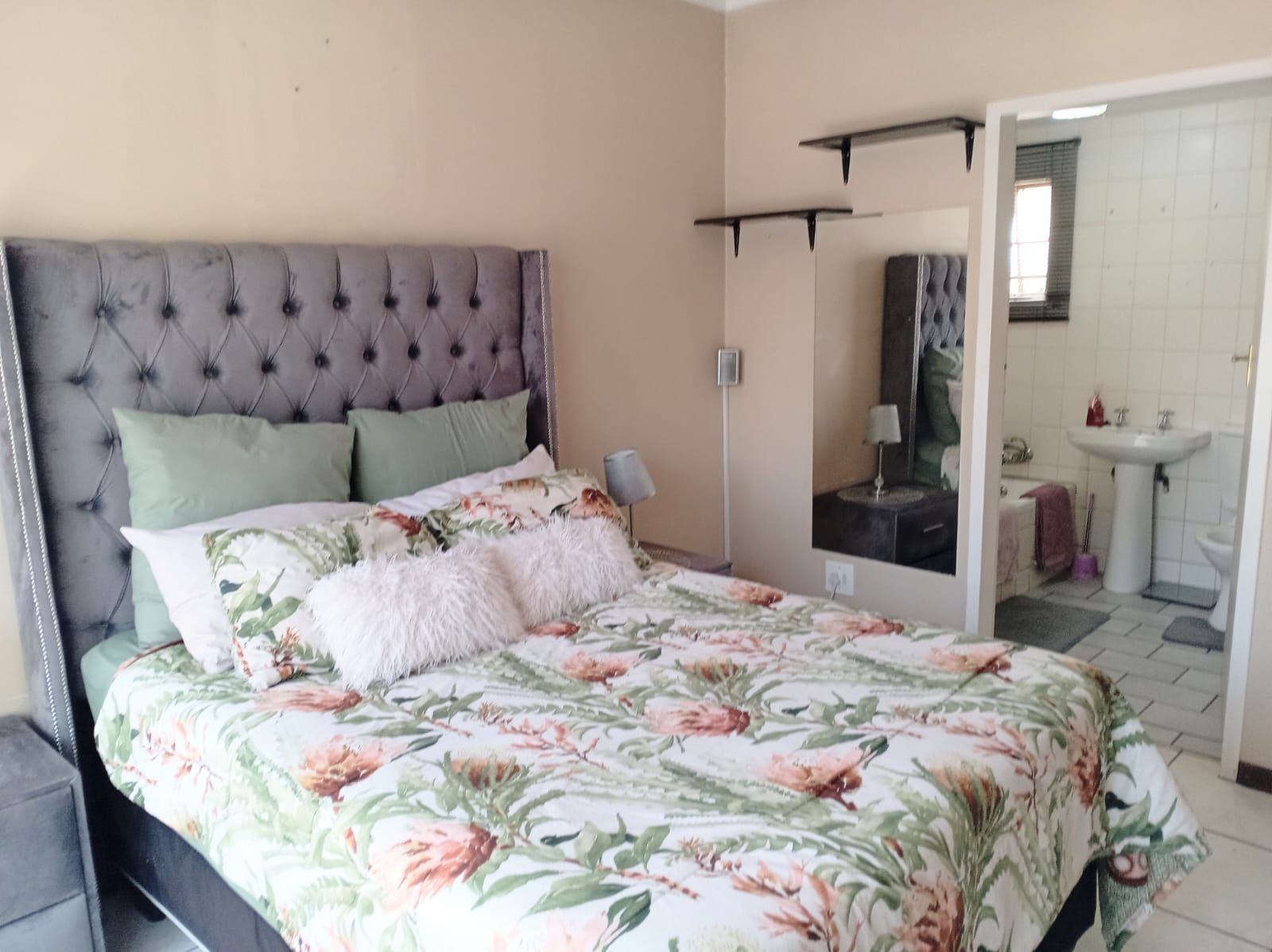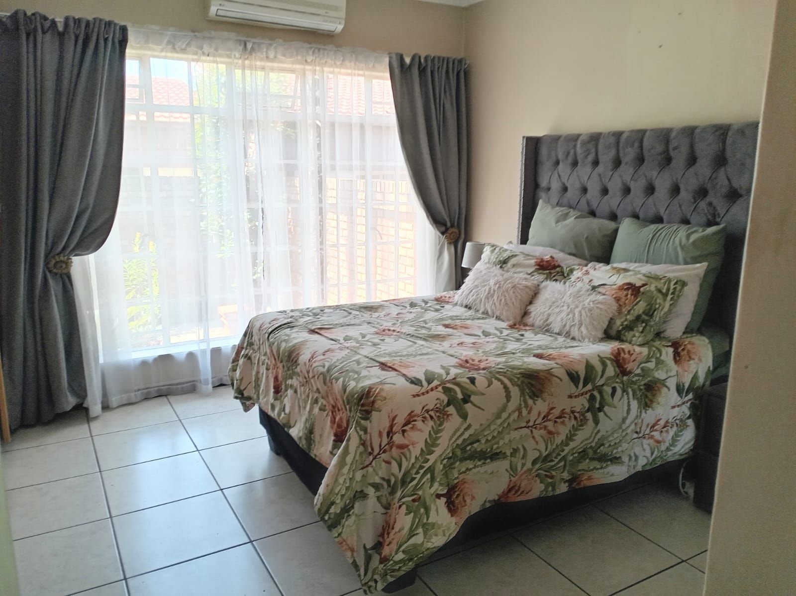 Two majestic bedrooms, both tiled and fitted with ample cabinetry. The main bedroom offers an elegant en-suite bathroom, while the second bathroom serves as a guest cloakroom.