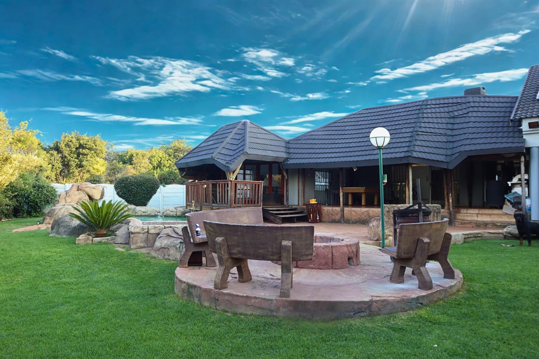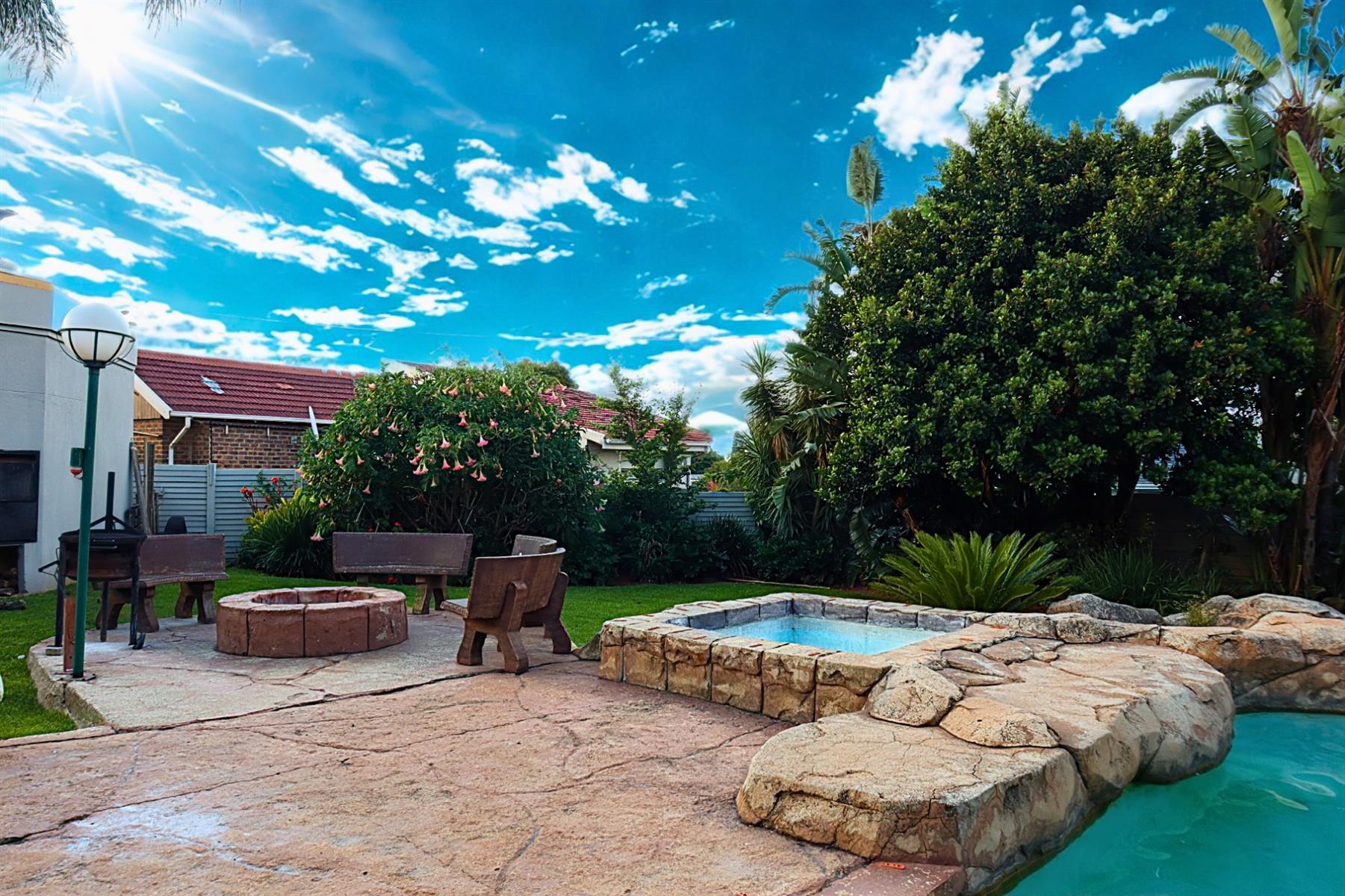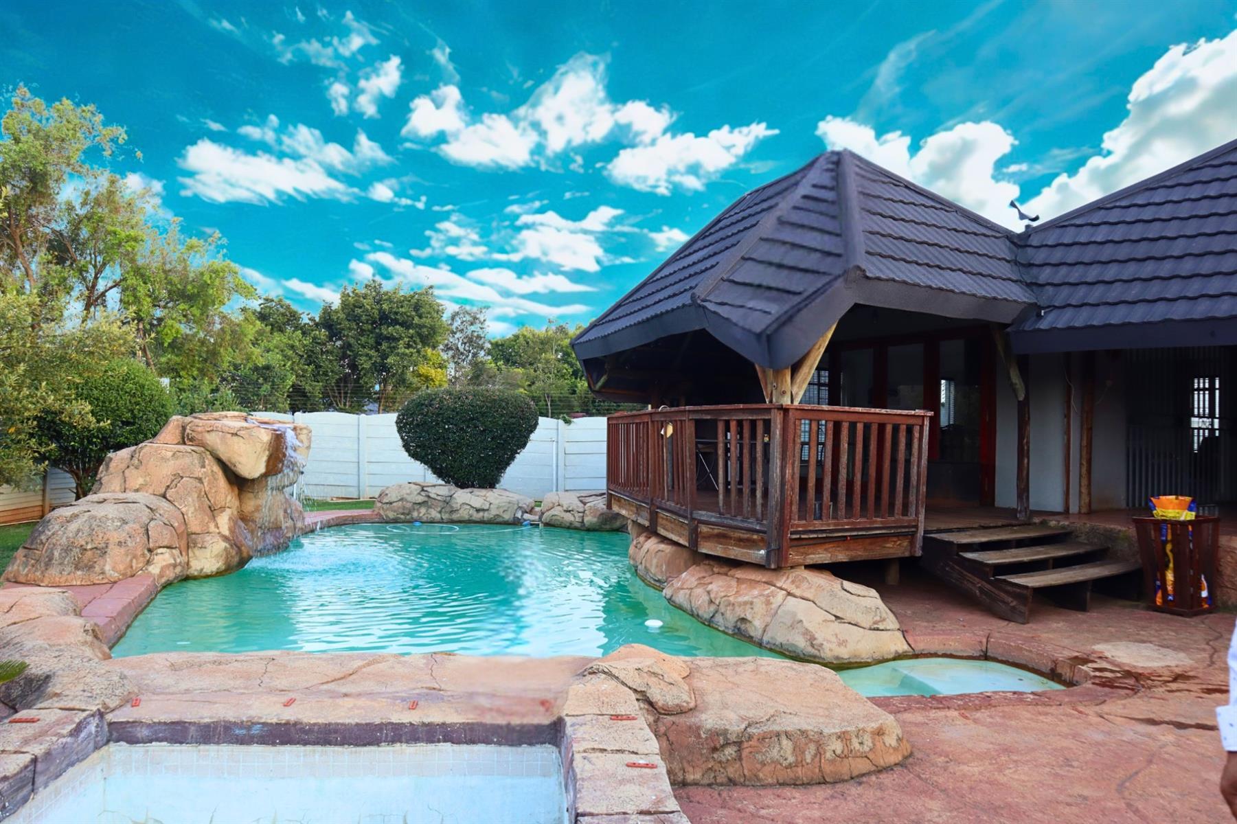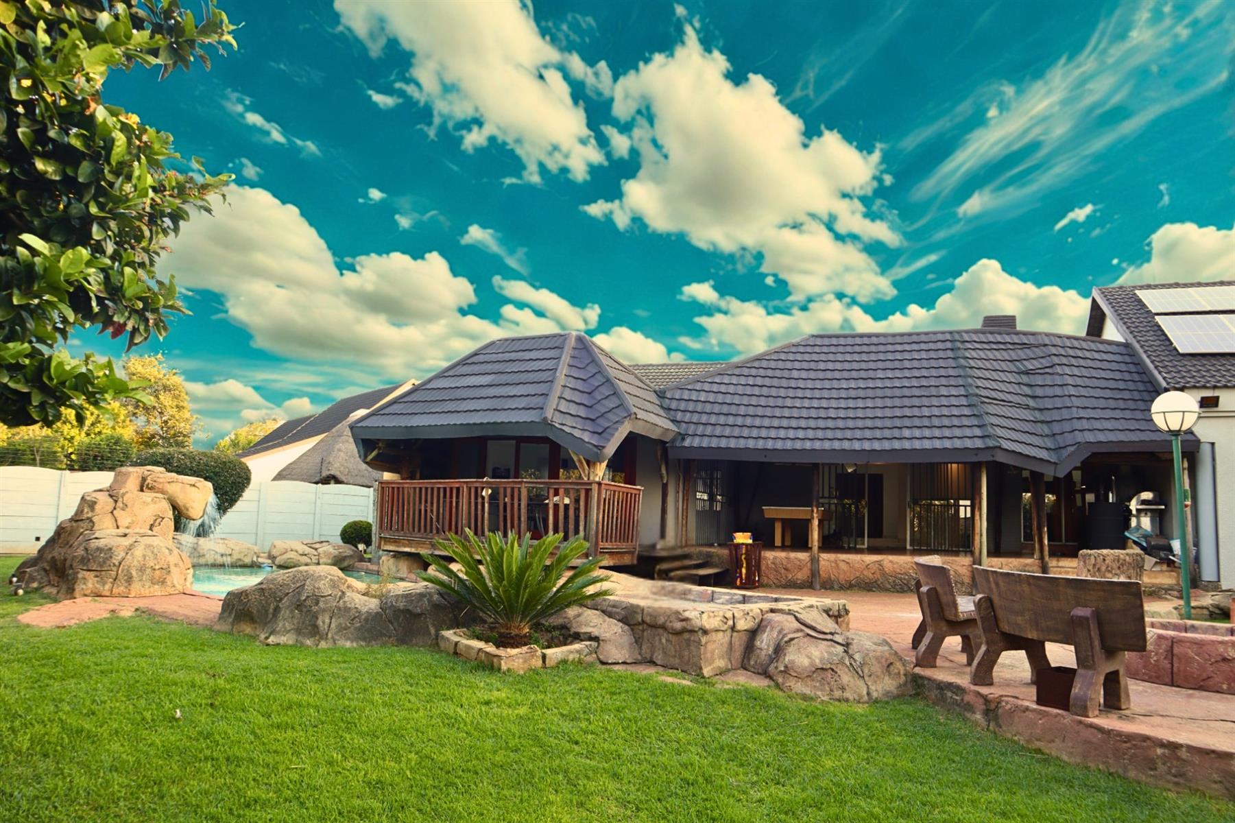 Outdoors, the beautifully landscaped garden showcases a tranquil rock pool and water feature, supported by a borehole to ensure sustainable water supply throughout the year. The covered patio is designed for memorable gatherings and features a built-in braai and pizza oven. Fitness enthusiasts will appreciate the dedicated gym area, allowing you to maintain an active lifestyle without leaving home.