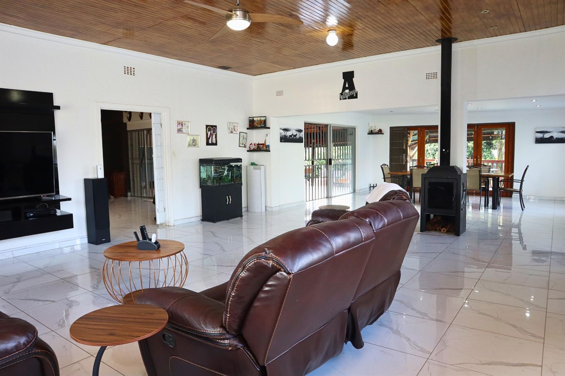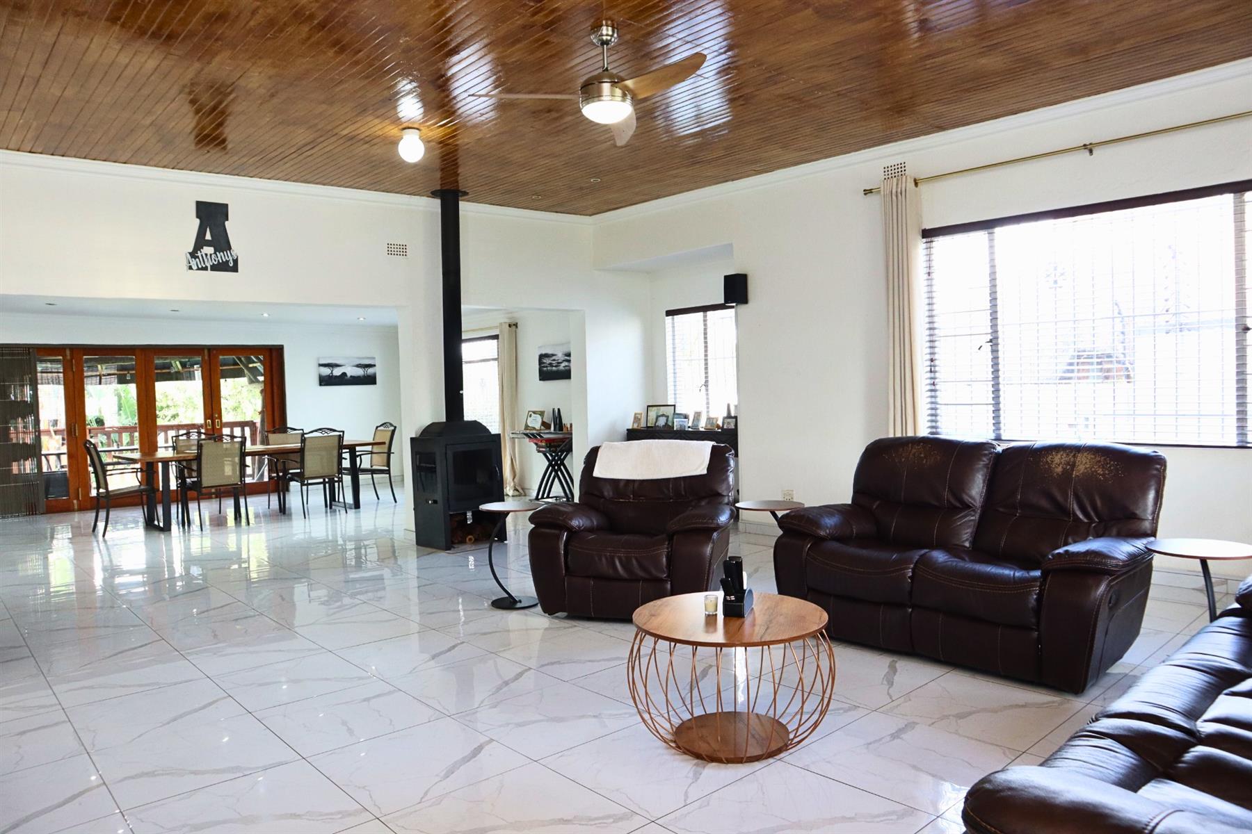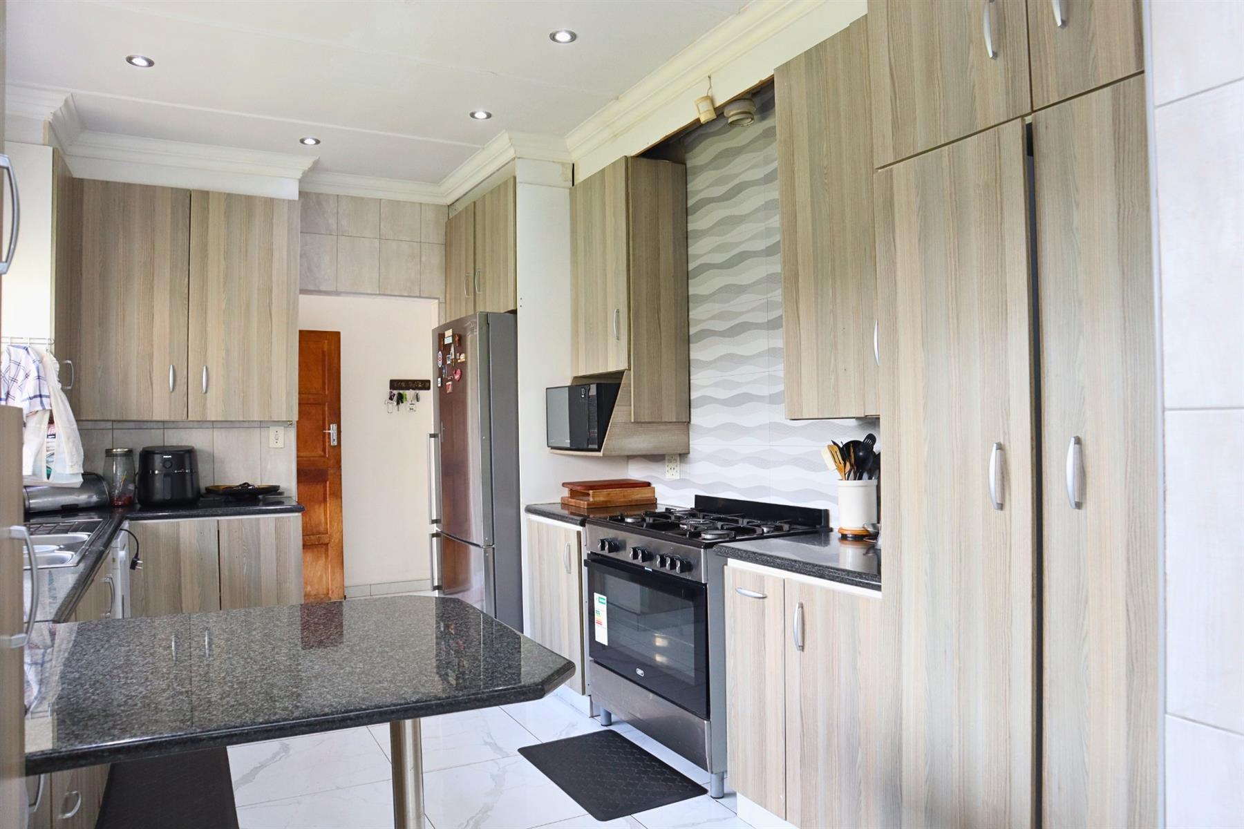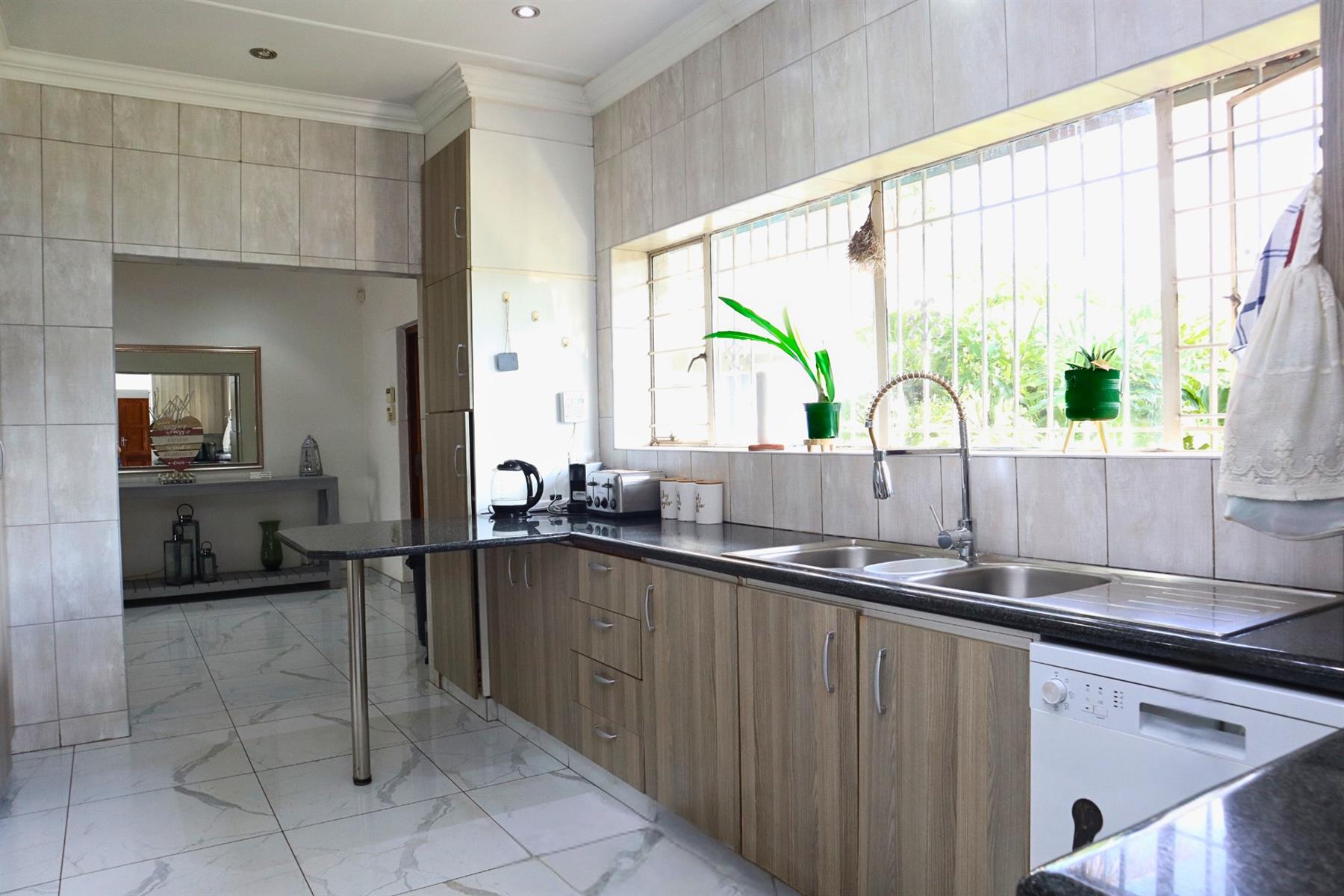 The main residence features five spacious bedrooms and three well-appointed bathrooms, including a main en-suite. The open-plan kitchen, fitted with granite countertops and a gas hob, flows seamlessly into the dining room and lounge, creating a warm, functional environment for both everyday living and entertaining.