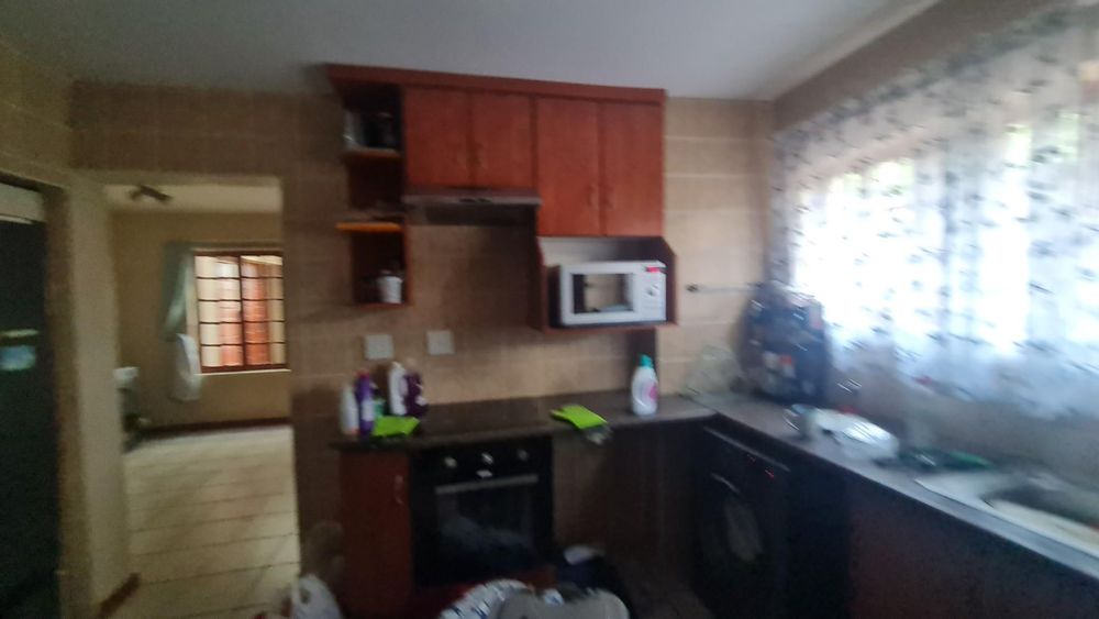 The downstairs area offers an open plan dining, TV Room/study area with fireplace, the perfect office space for a work from home professional and a spacious lounge. This area flows seamlessly onto an enclosed patio, with louvered roof that can open and close to allow for adjustable shading and protection from rain, perfect for entertaining family and friends. The spacious and well-kept garden provides a safe space for kids and pets to run and play. The modern kitchen offers ample work and storage space, hob and undercounter oven, double basin, connections for a dishwasher and washing machine, space for a fridge and a pantry. From the kitchen there is access to a small courtyard with washing lines.