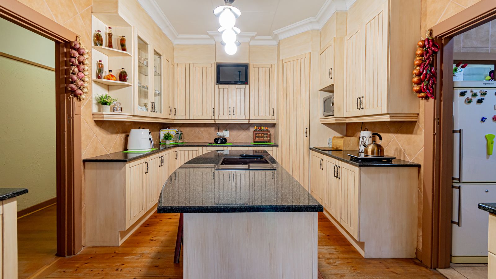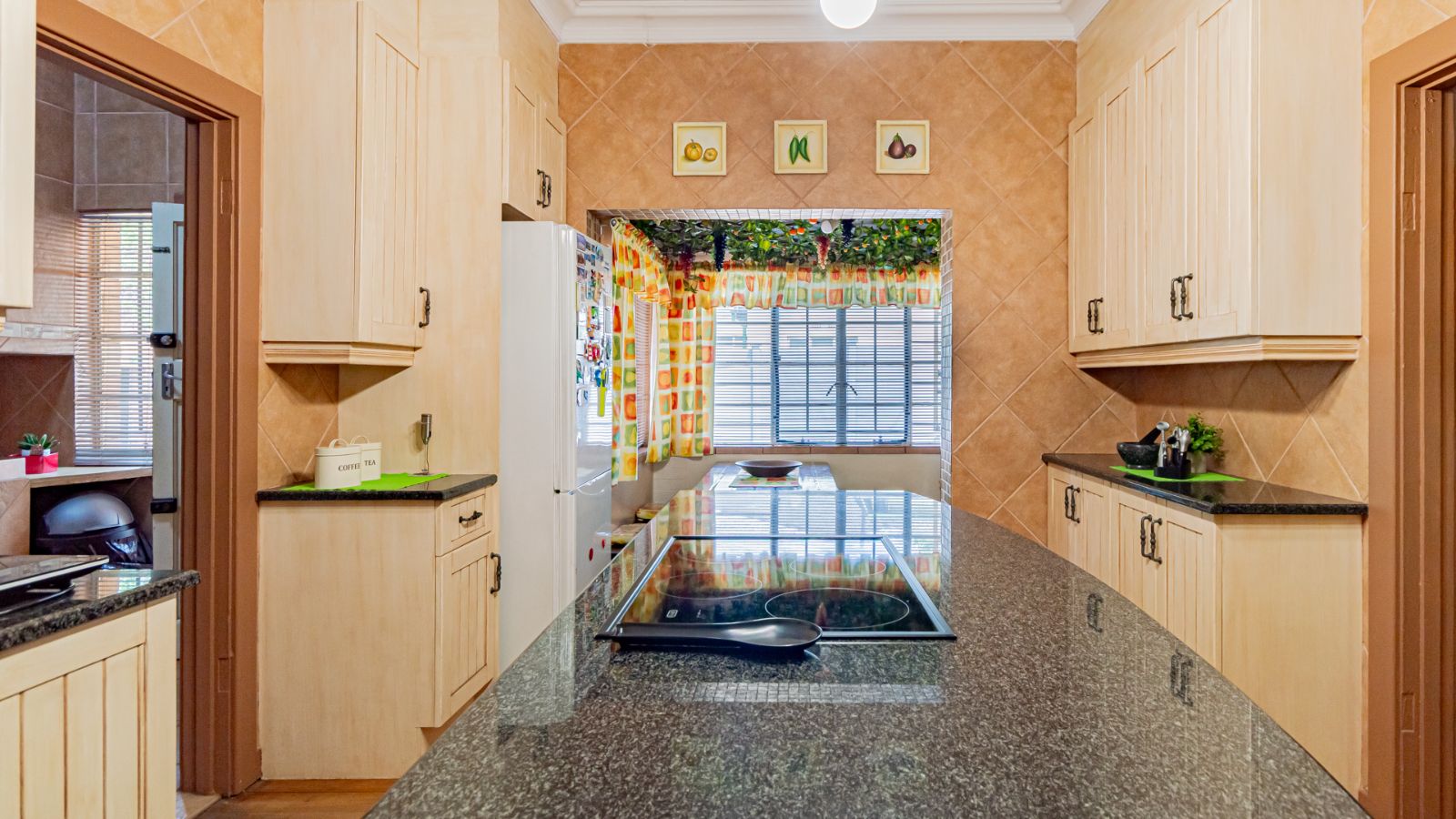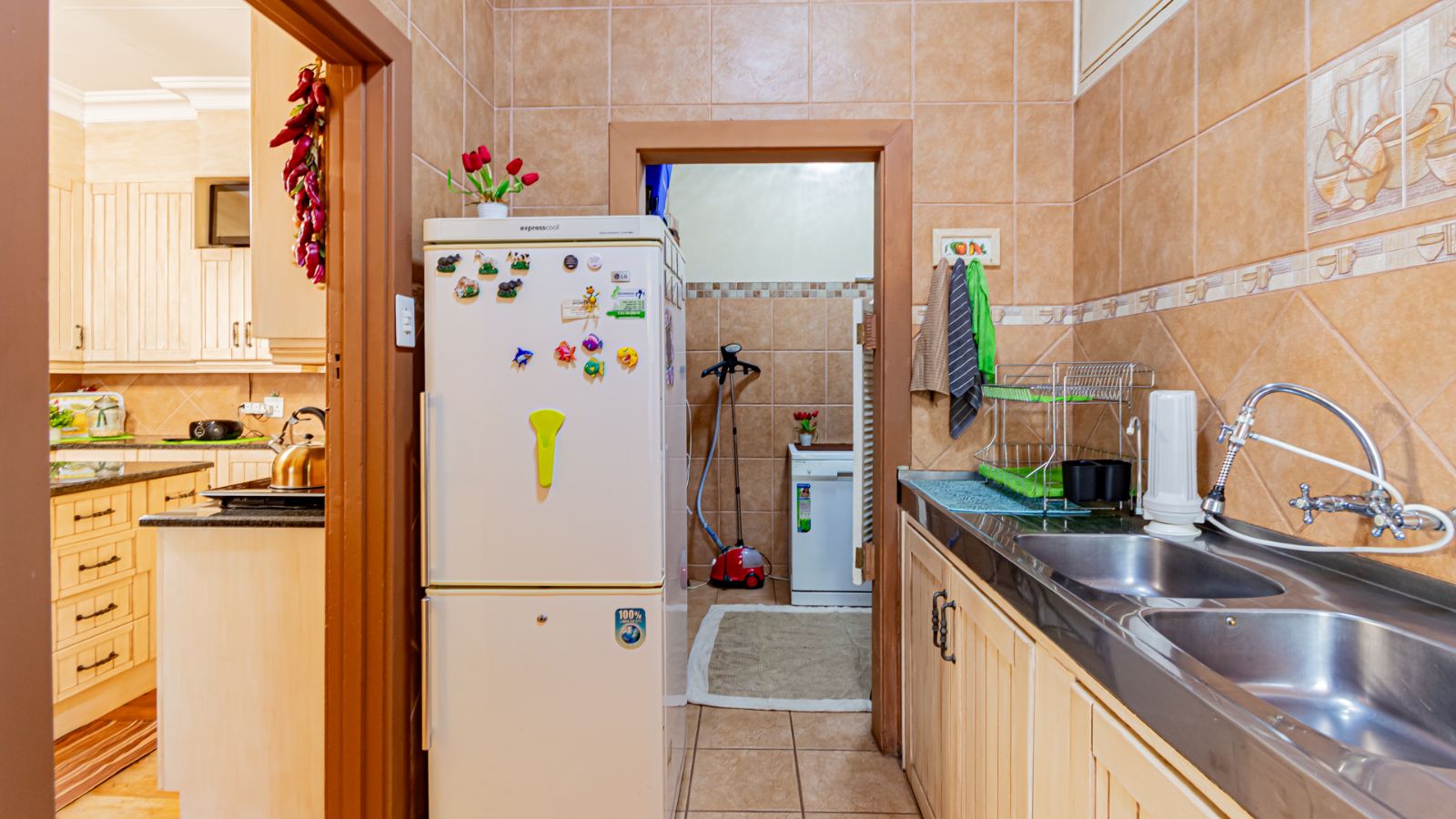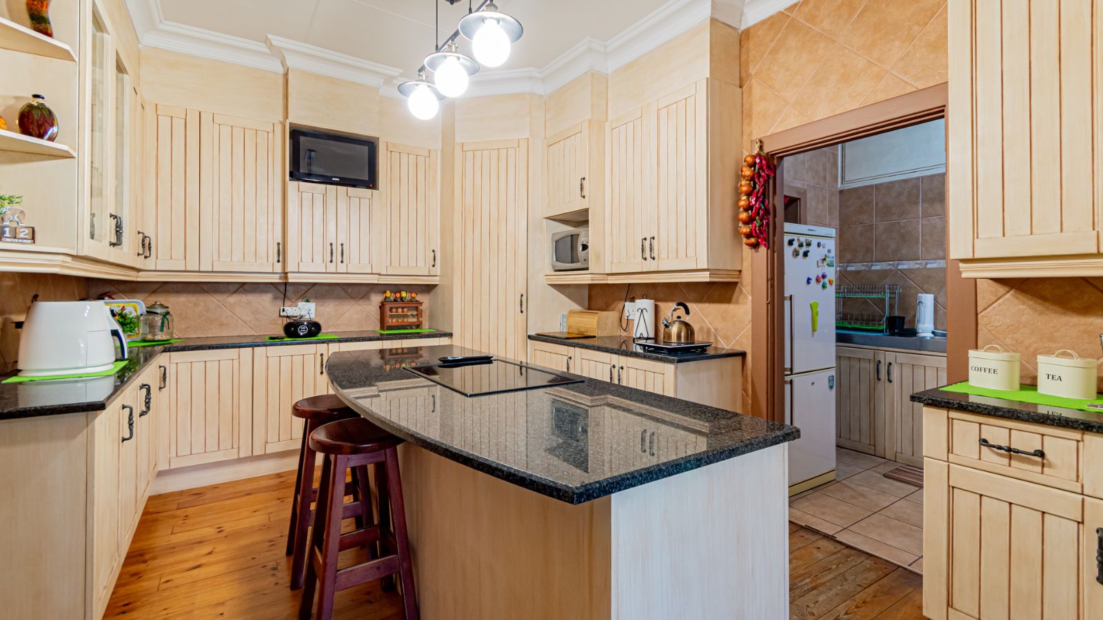 Two spacious living areas provide flexible spaces for entertaining guests or enjoying relaxed family time. The modern kitchen is a standout, boasting quality finishes, ample cupboard space, and a practical scullery that keeps the main kitchen neat and uncluttered.