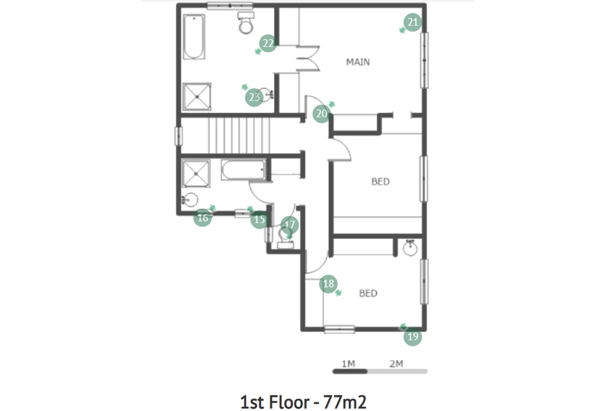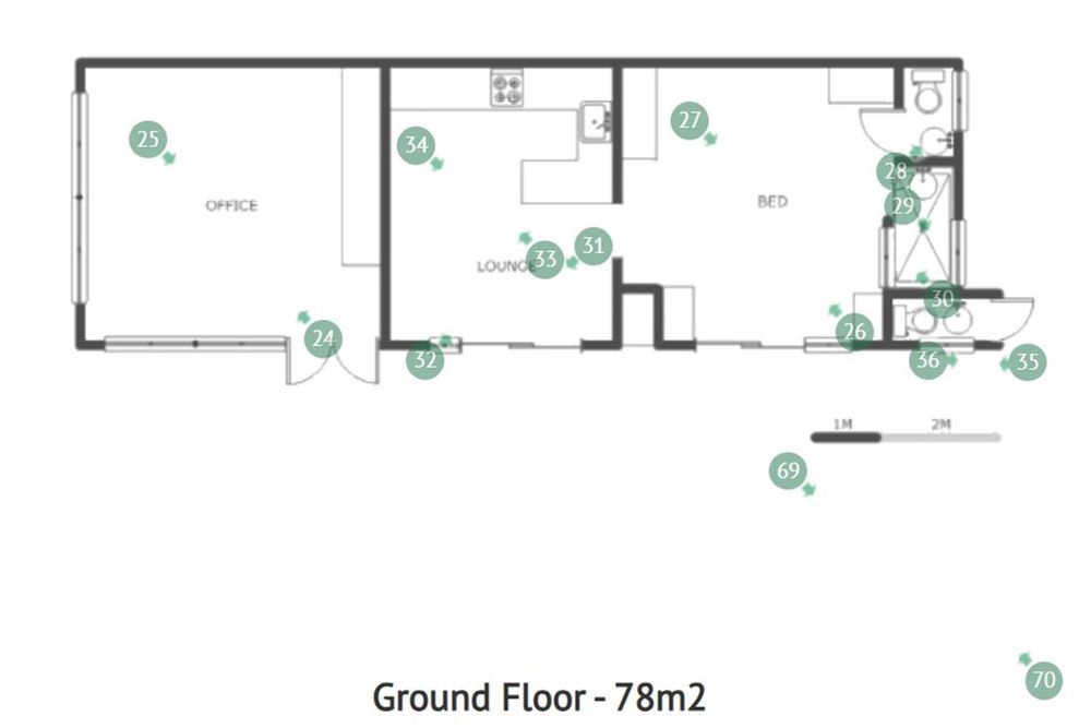The main house is modern and comfortable, with3 bedrooms and 2 full bathrooms(one of them connected to the main bedroom). The kitchen hasgranite countertopsand leads into a spacious open-plan dining and living area. The house hashigh ceilingswith exposed wooden beams, which makes the space feel big and bright.