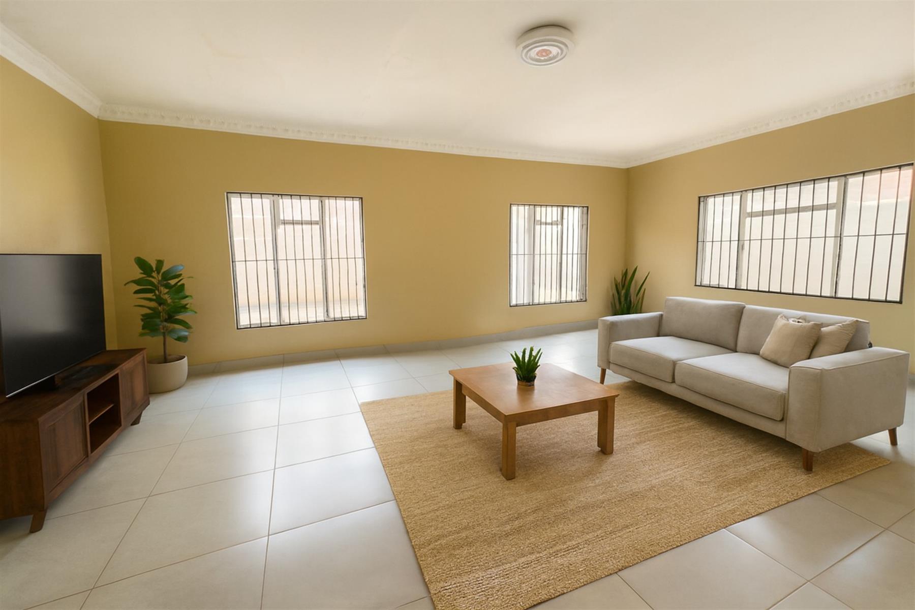 The spacious family home boasts three large, sunny bedrooms with built-in cupboards, including a main bedroom with an en-suite bathroom. Living areas include a huge lounge, an additional living room, and a versatile multi-purpose space ideal as a TV room, office, or entertainment area.
