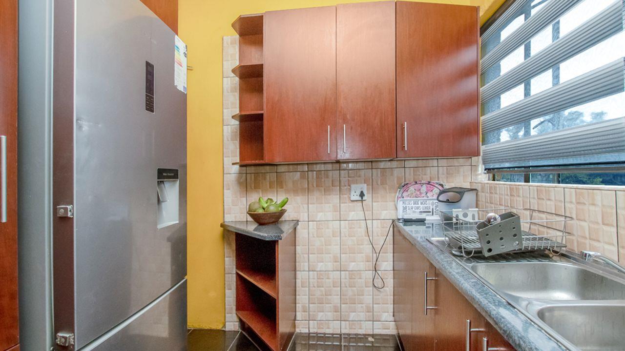 The kitchen, adorned with ample cupboard space, provides a practical and organized environment for culinary endeavors. The tiled floors not only add a touch of elegance but also ensure easy cleaning and maintenance, making this space both stylish and functional.