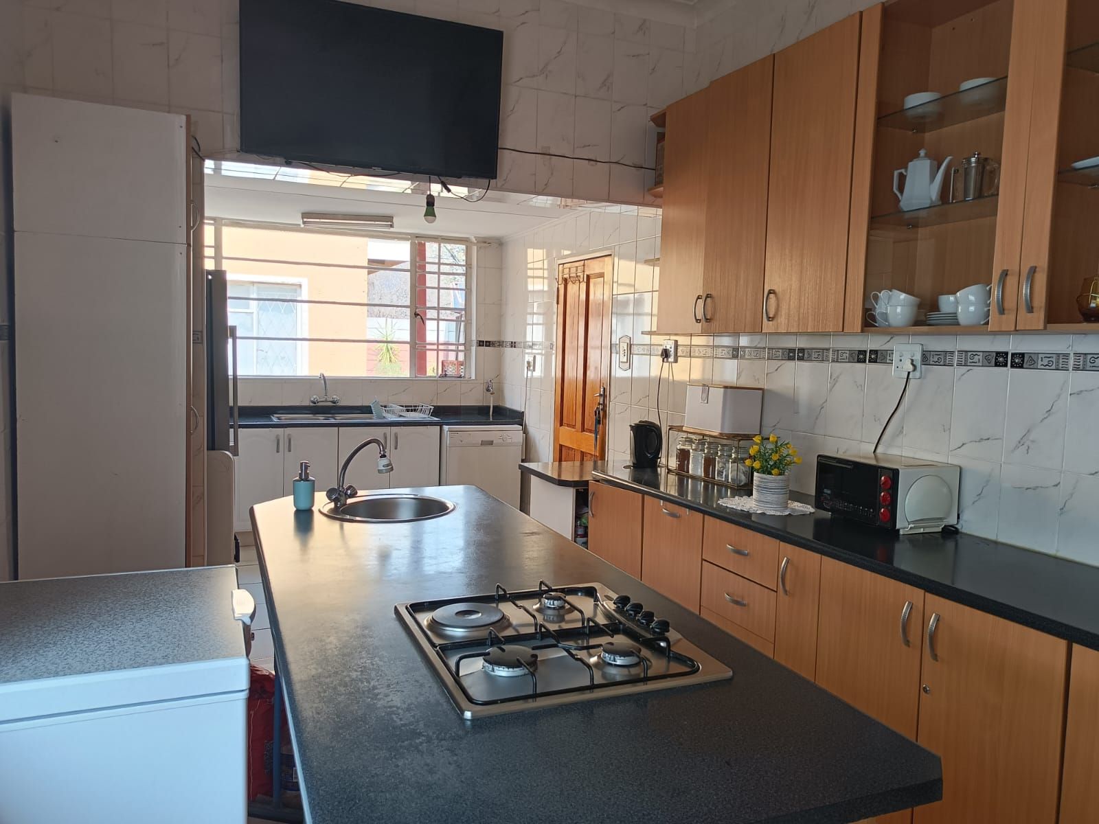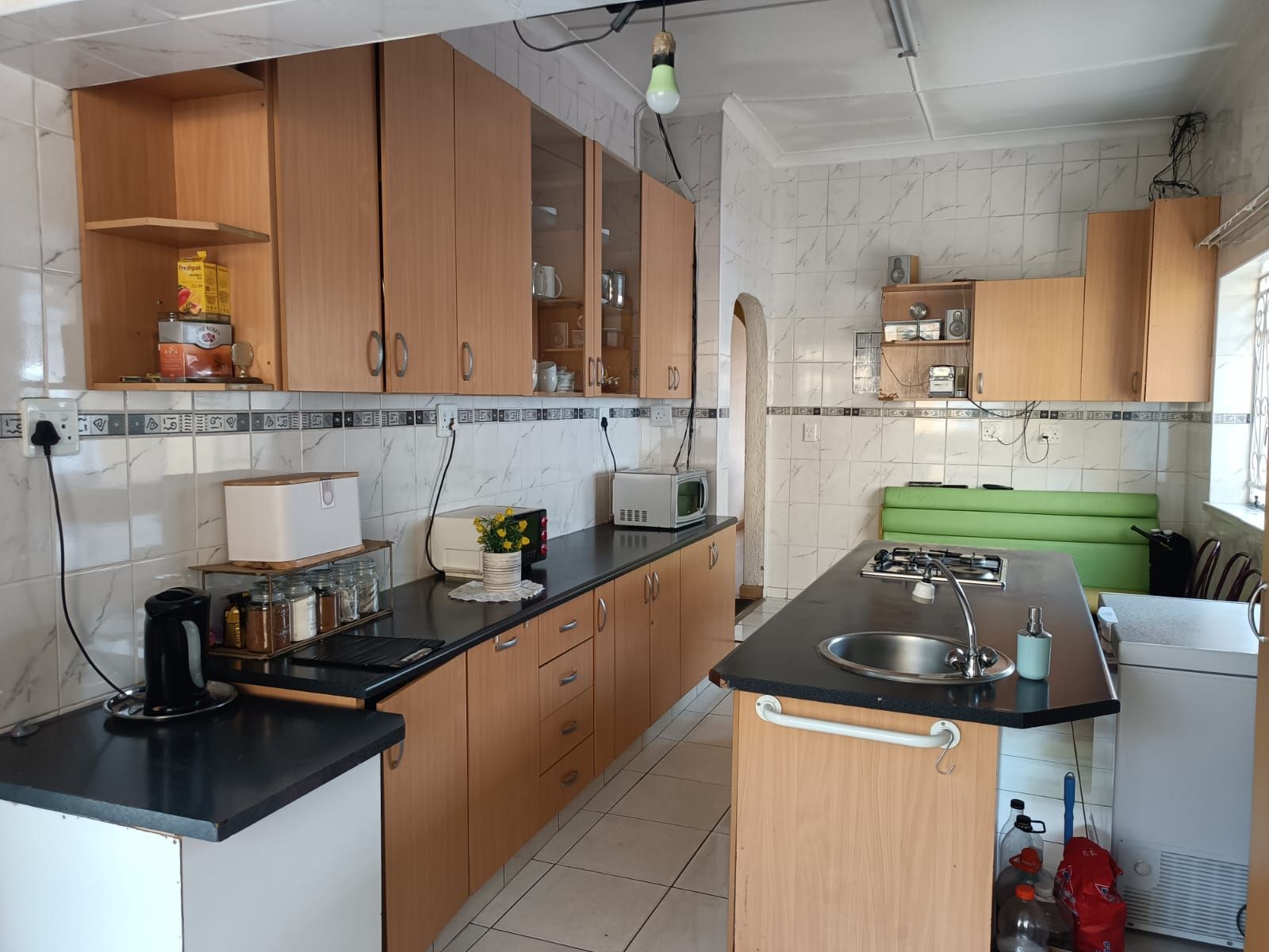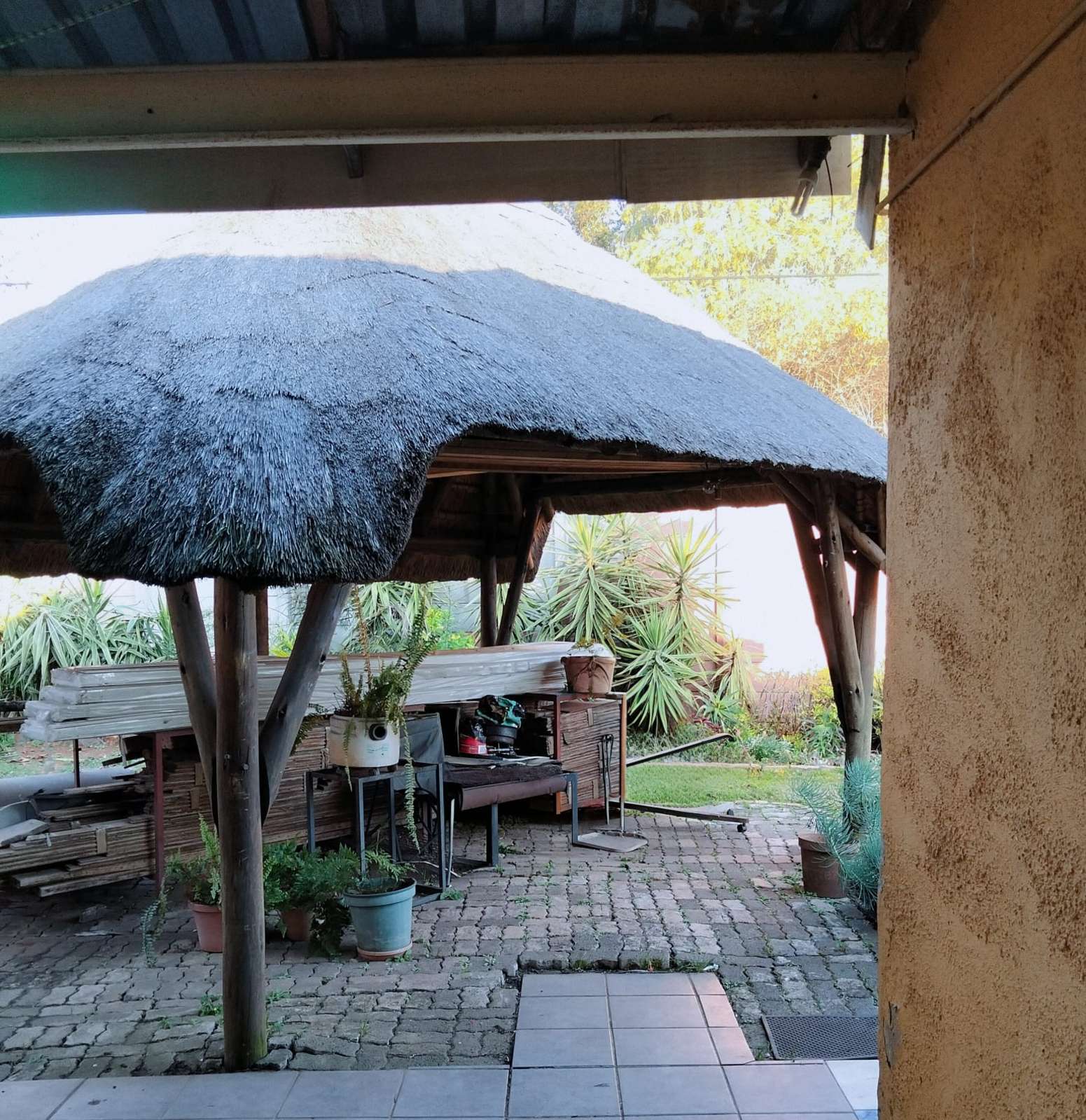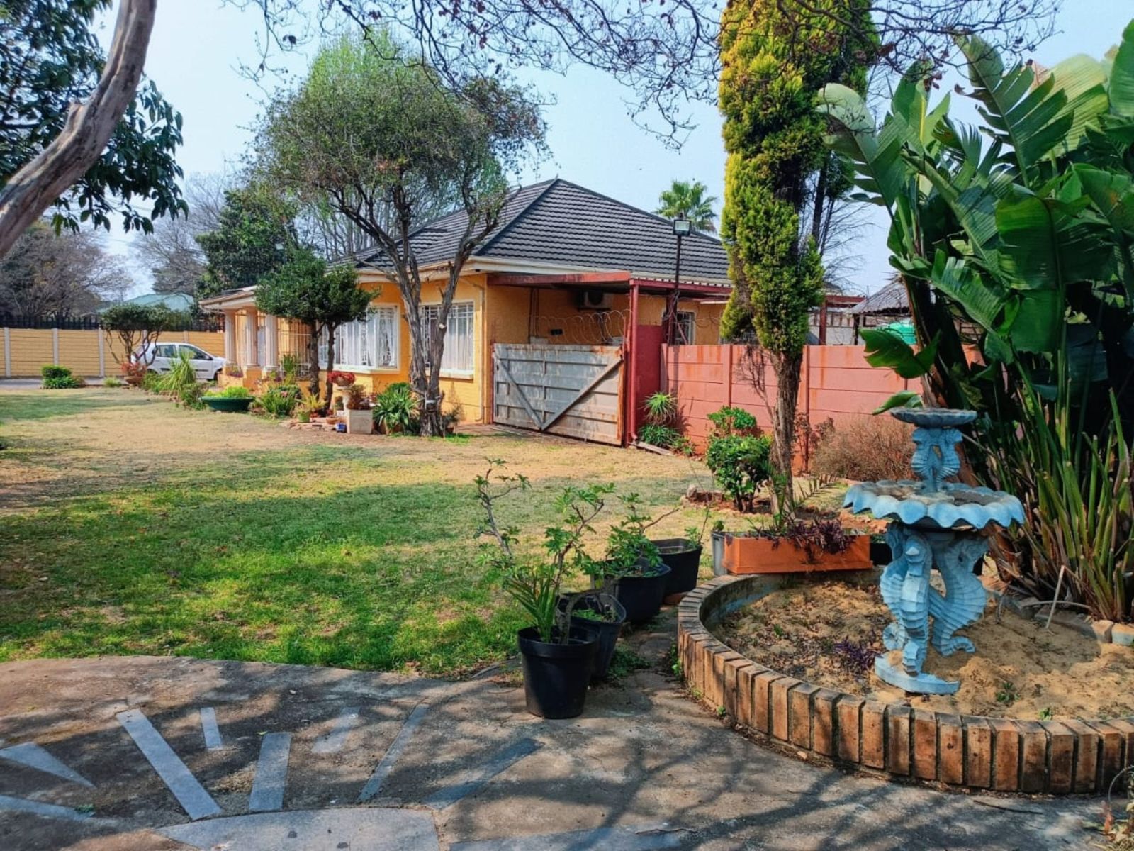 The Main House has three bedrooms, 1.5 bathroom, lounge, kitchen and dining room, all spacious rooms. The First Cottage has a lounge, three bedrooms two bathrooms, kitchen and outside covered patio. The Second Cottage has a kitchen, lounge/dining room, bedroom and bathroom with shower. So if an extended family buys it, they can accommodate all the family – or one can get a great rental income from the cottages. Cottage 1 can bring in R10 000 per month and Cottage 2 can add another R5500 per month.
