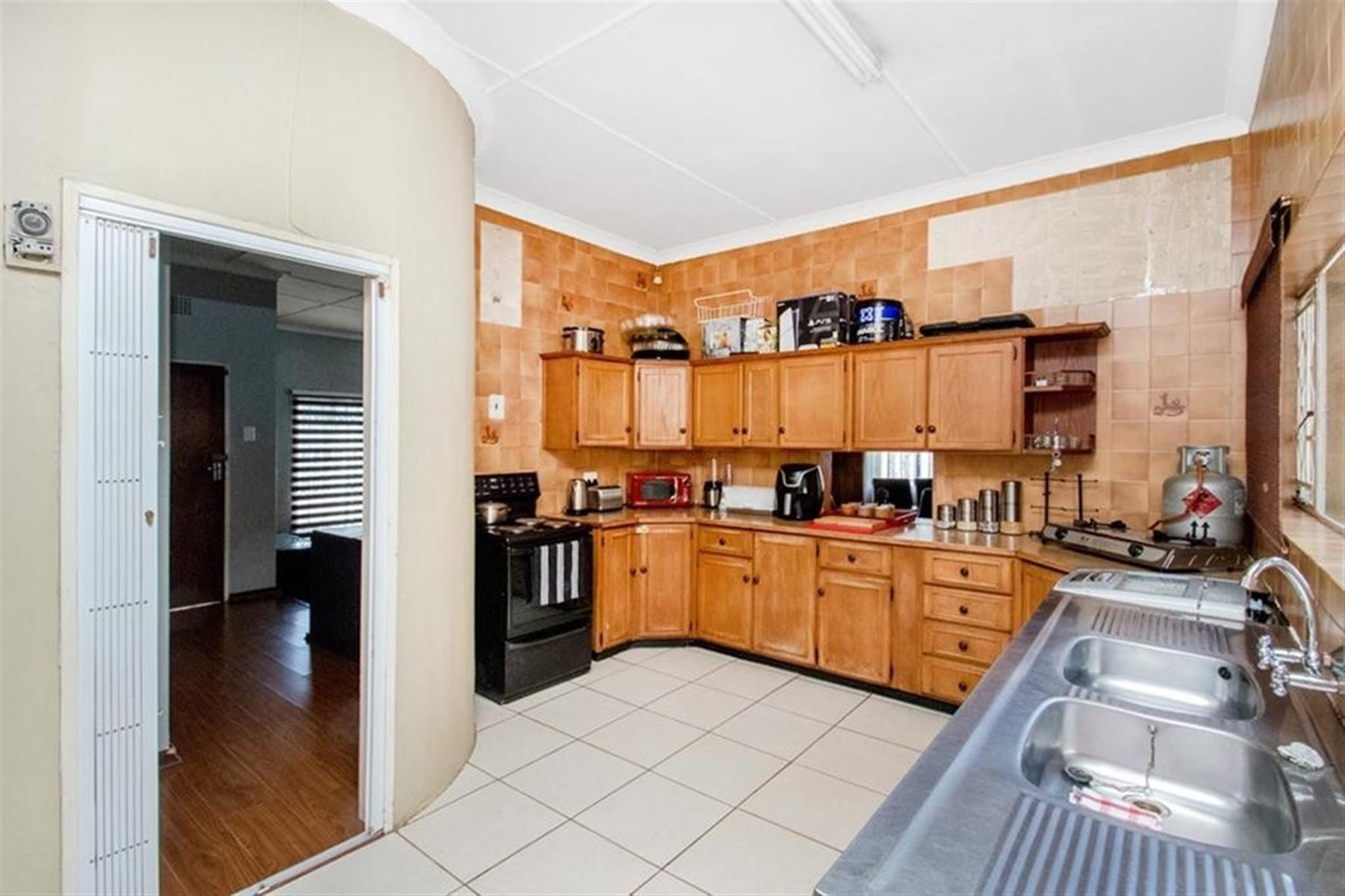 The main house features 389m2 of living space that includes three well-sized bedrooms with parquet tiles and built-in cupboards and two tiled bathrooms. The spacious north facing lounge offers a cozy anthracite fireplace and access to the front patio and the dining room with wood cladding. The kitchen has ample work and storage space, space for a fridge and wet appliance and a stand-alone stove and scullery area. From the kitchen there is a hatch to the dining room and also access to the back courtyard with an undercover patio, garden and double staff accommodation with a laundry area. The property also offers a single garage and additional parking for family and friends. Security at the home includes an alarm system (not activated), beams inside the house, burglar bars on all windows and safety gates on all exterior doors as well as an automated gate. The property is fibre ready.