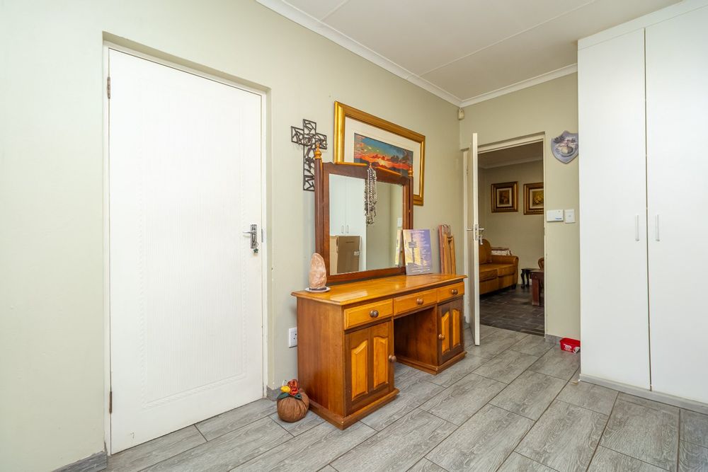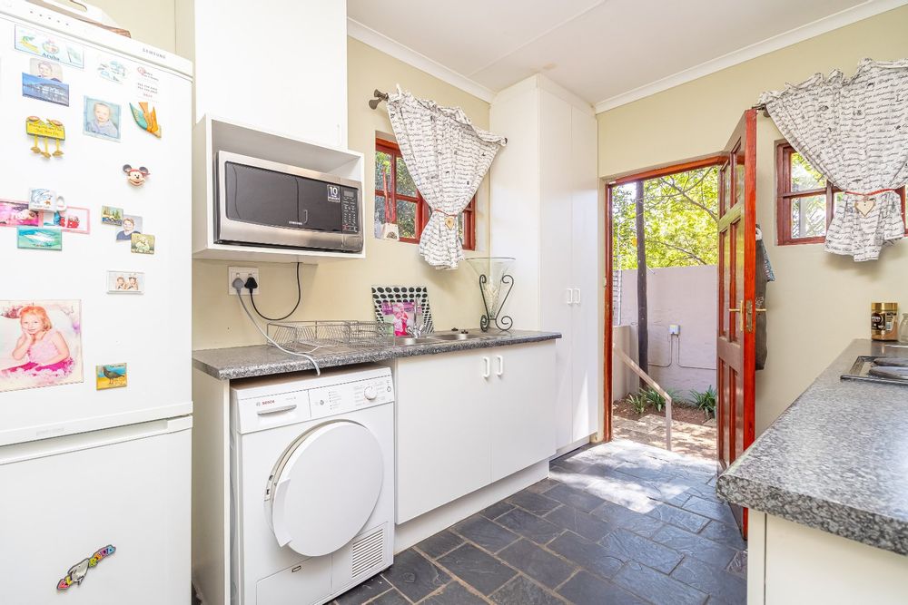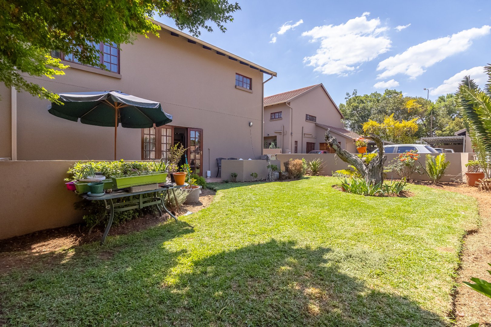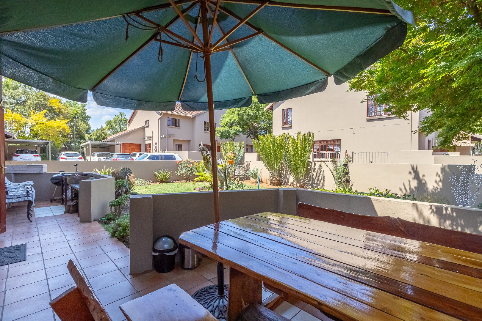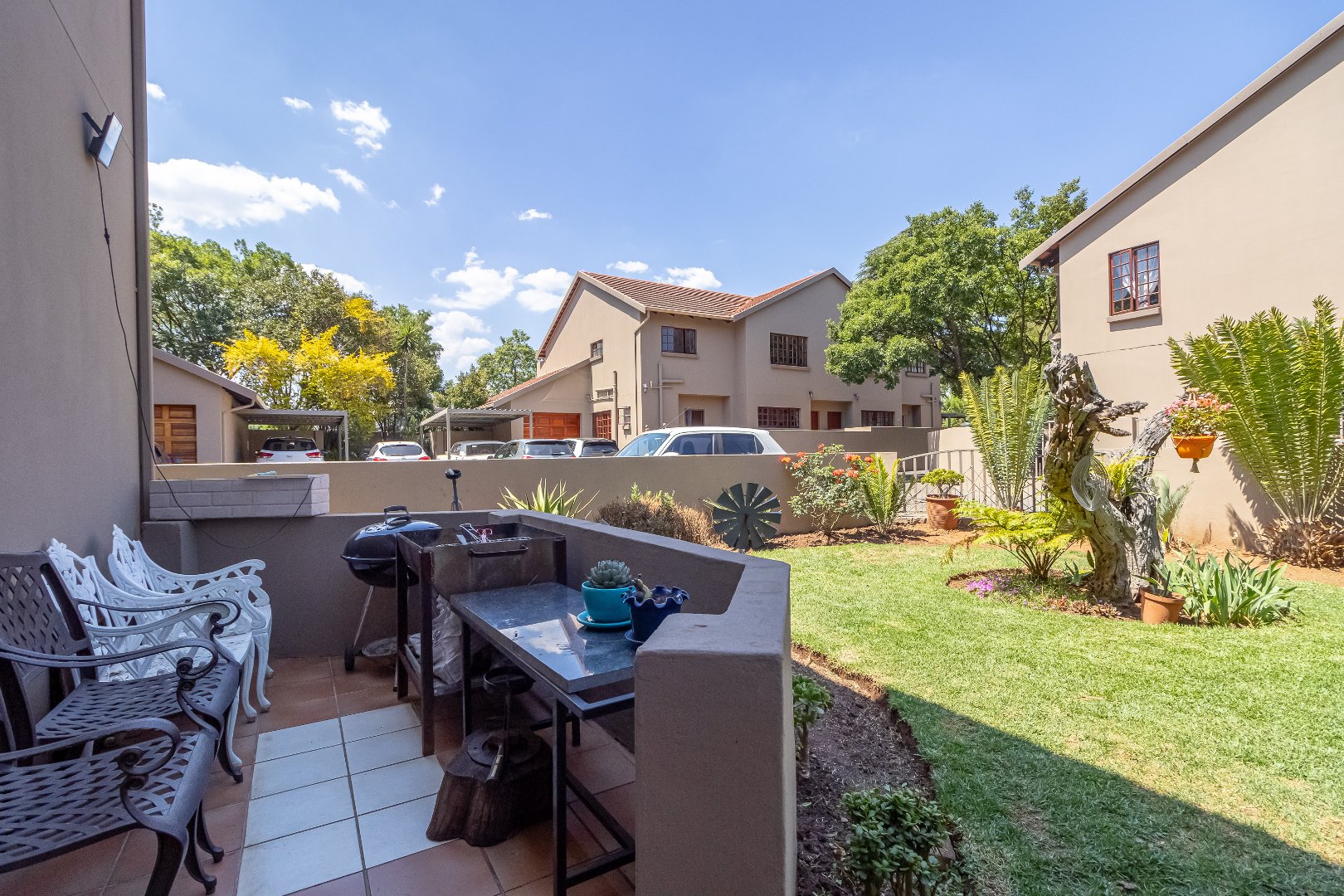 The simplex unit's floor plan consists of an entrance, two bedrooms, complete with built-in cupboards and 2 bathrooms. A separate kitchen and reception with its own private garden with washing lines and a carport.