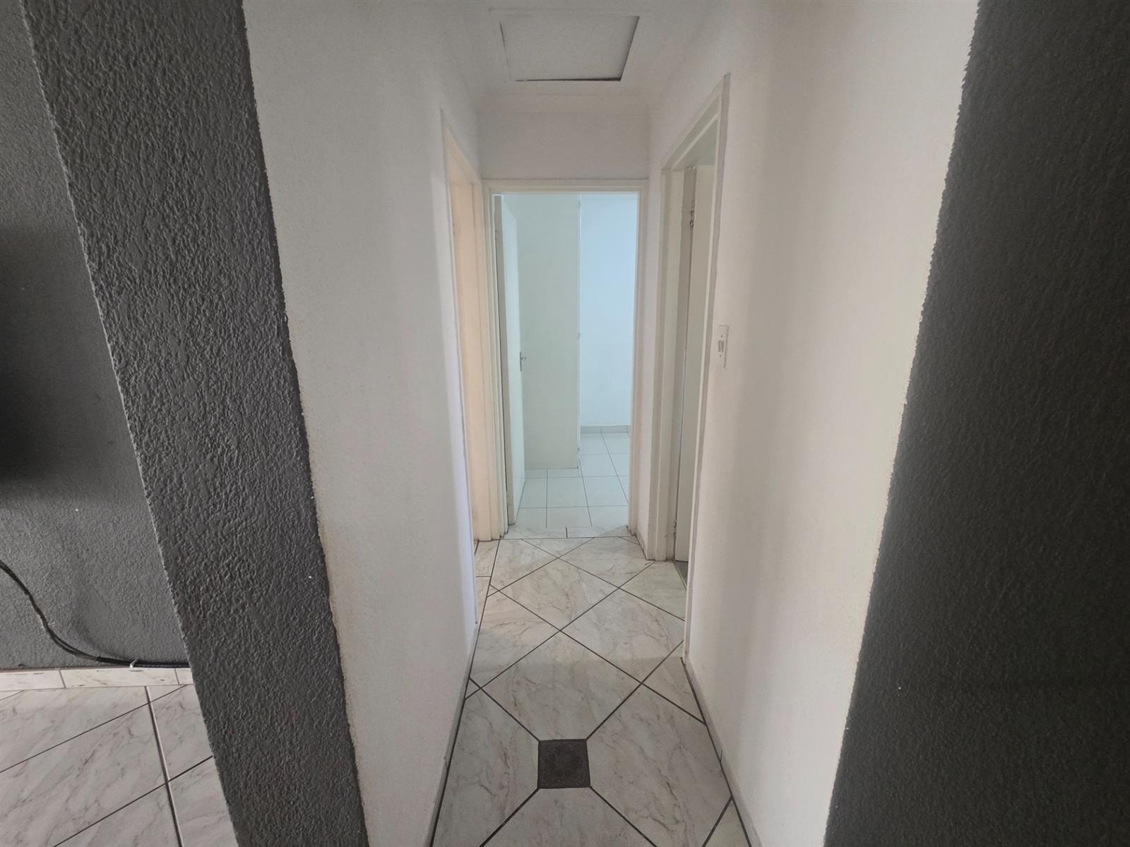 The passage leads to two well-sized bedrooms, including a sunny main bedroom with built-in cupboards. The modern bathroom is fully tiled and conveniently accommodates a top-loader washing machine.