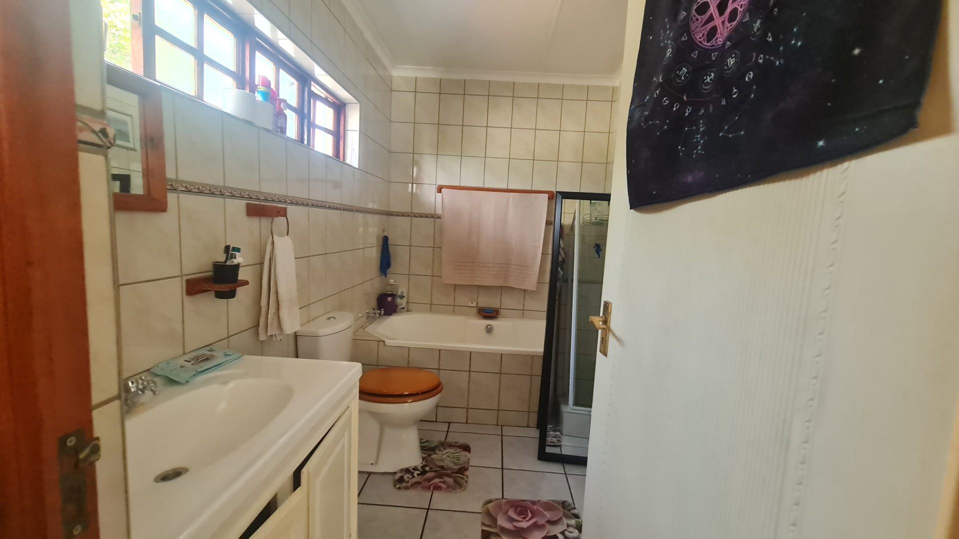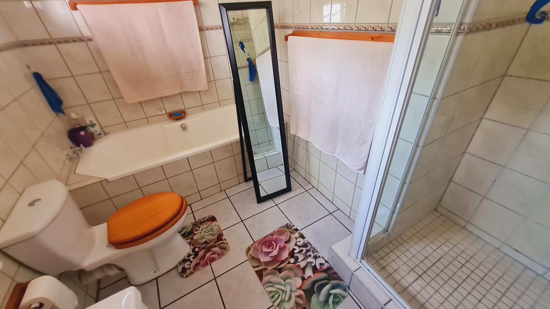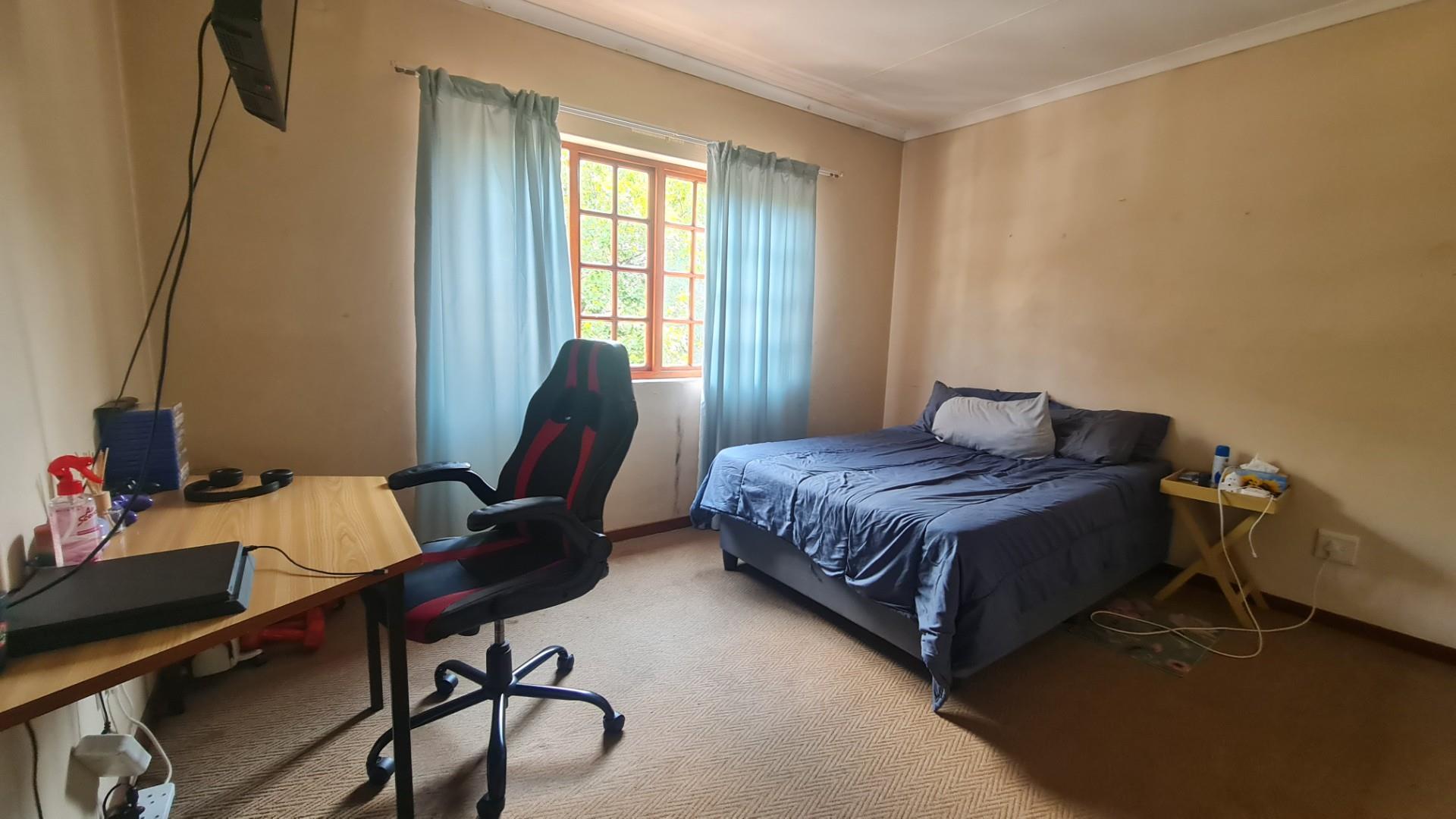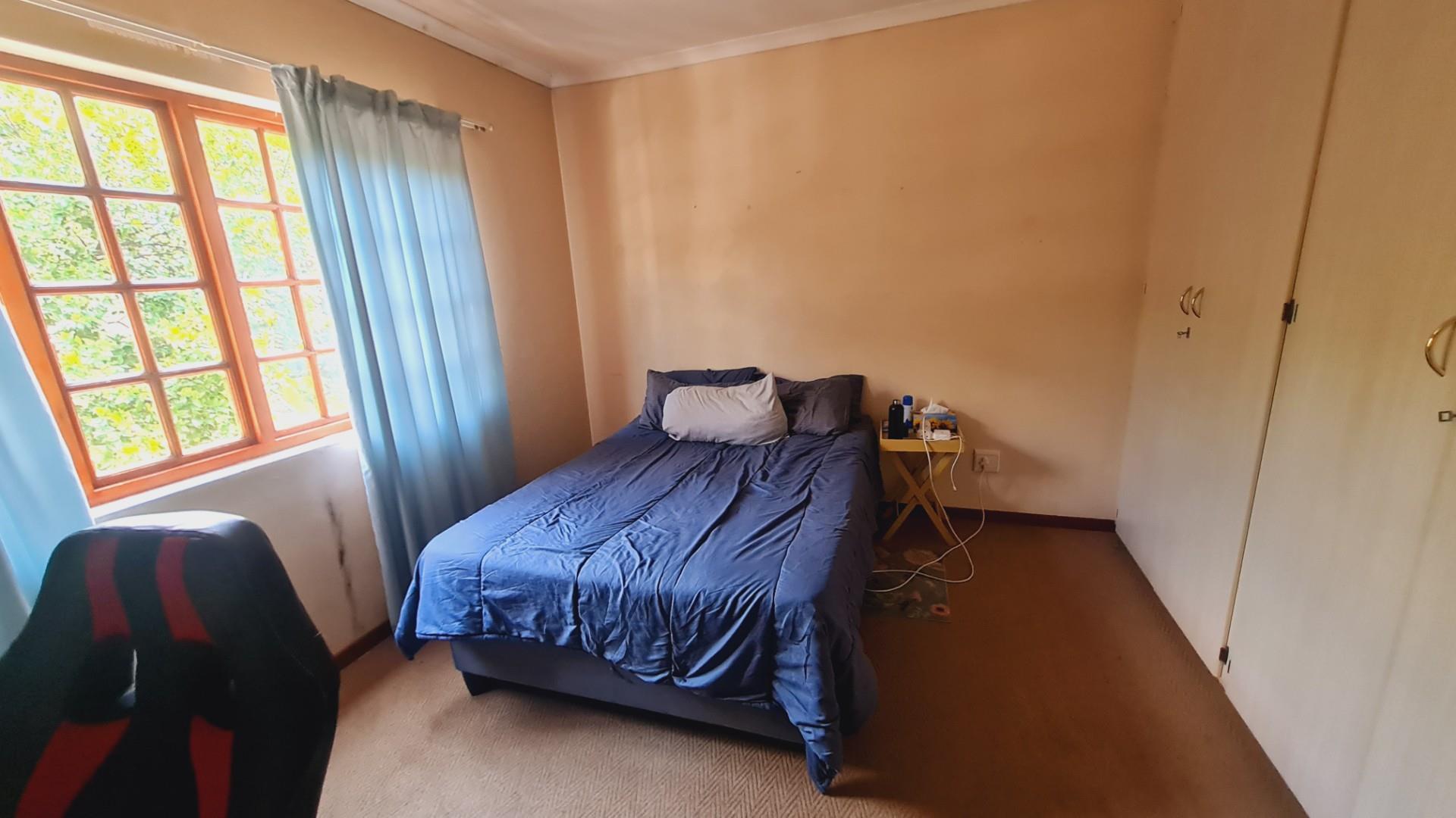 The downstairs area offers an open plan dining, TV Room/study area with fireplace, the perfect office space for a work from home professional and a spacious lounge. This area flows seamlessly onto an enclosed patio, with louvered roof that can open and close to allow for adjustable shading and protection from rain, perfect for entertaining family and friends. The spacious and well-kept garden provides a safe space for kids and pets to run and play. The modern kitchen offers ample work and storage space, hob and undercounter oven, double basin, connections for a dishwasher and washing machine, space for a fridge and a pantry. From the kitchen there is access to a small courtyard with washing lines.