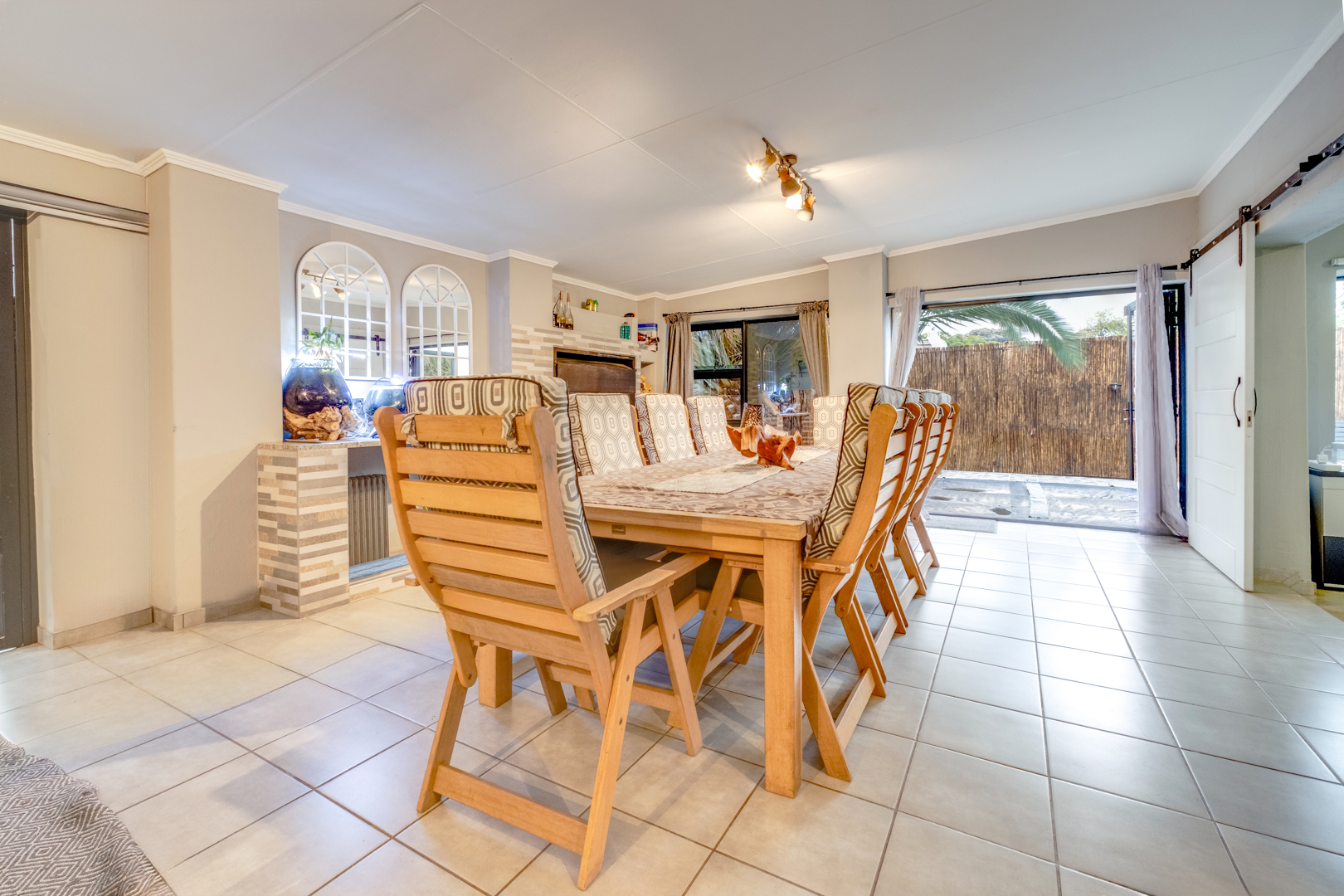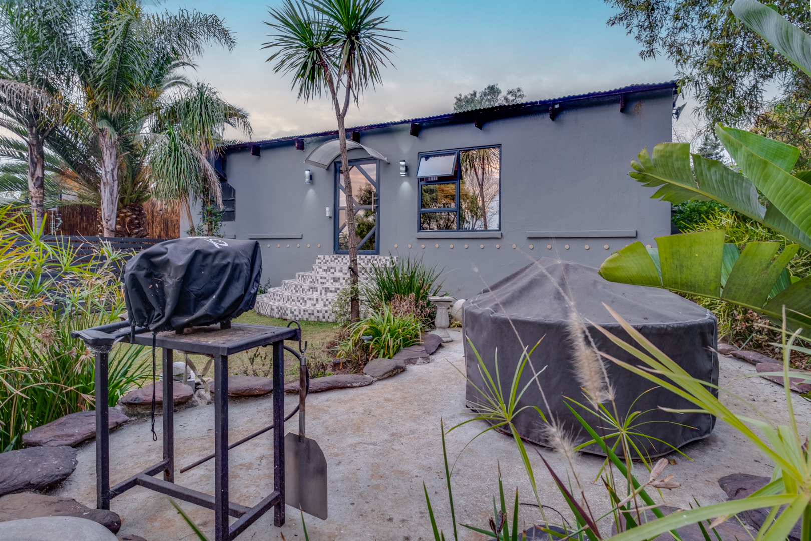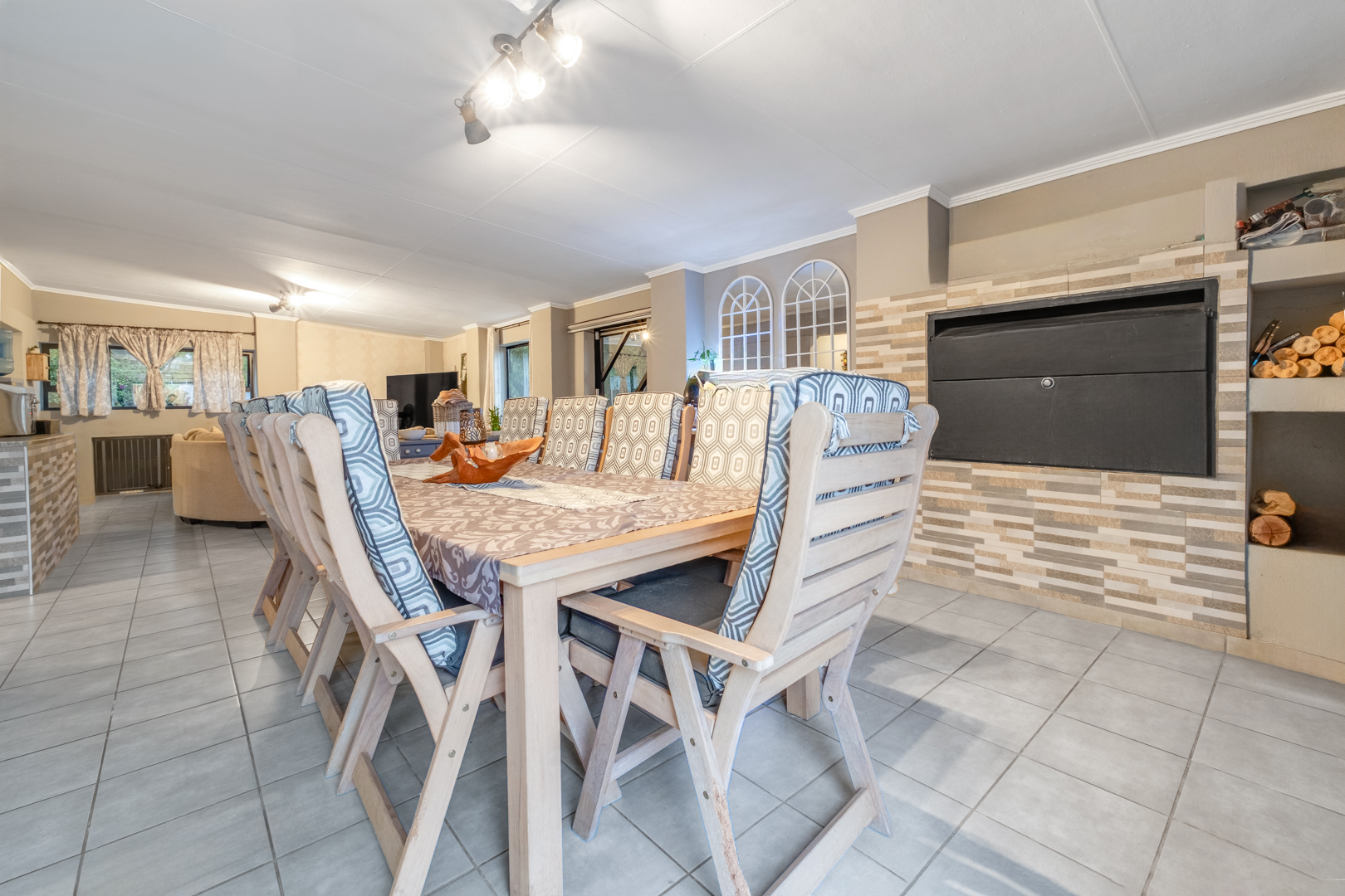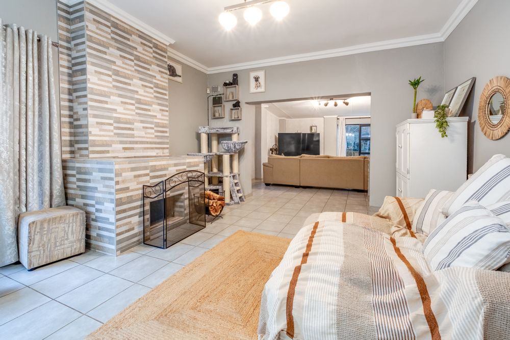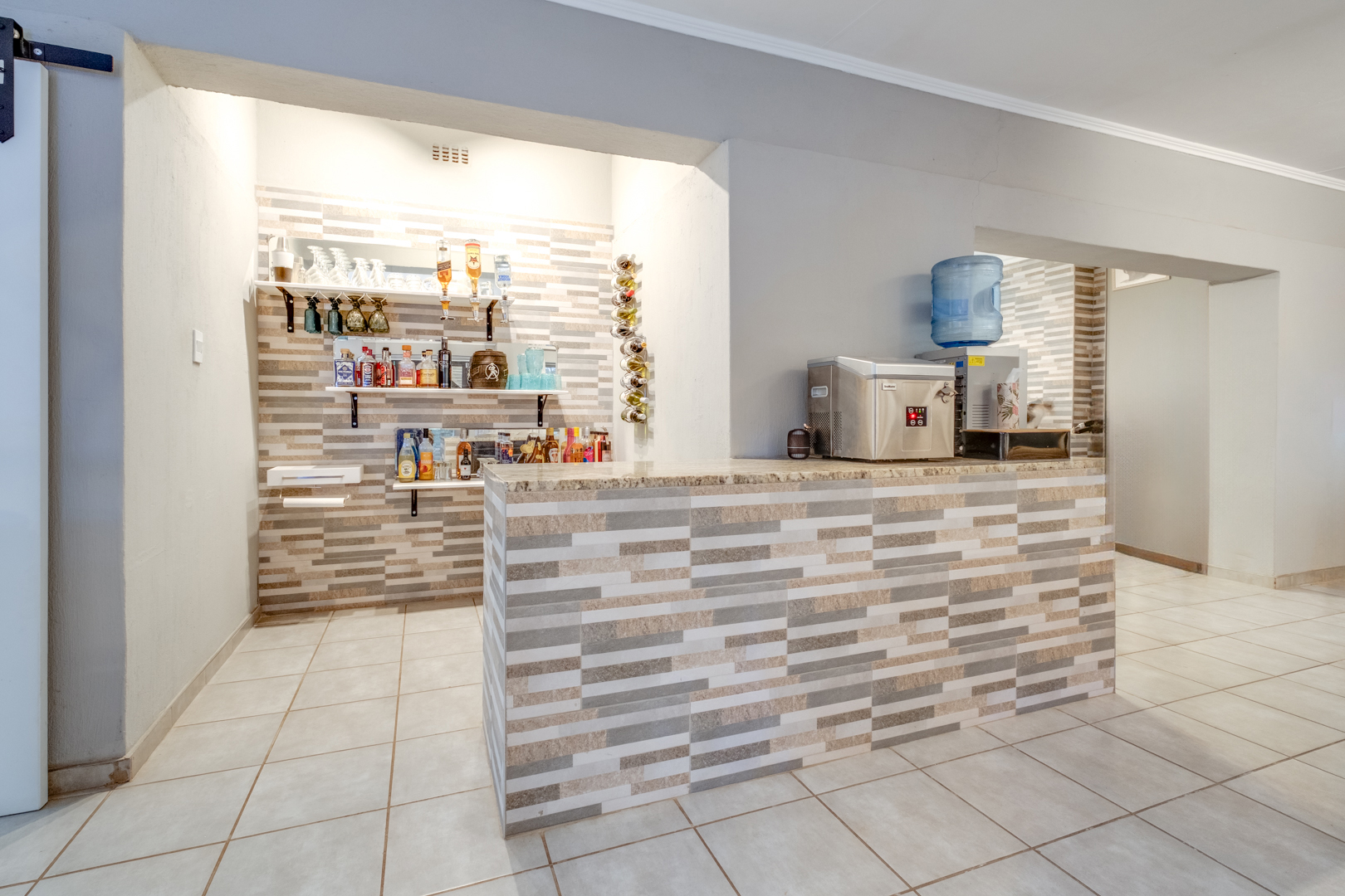 Additional living area is open plan with the TV room, featuring tiled flooring, a large north-facing door leading to the pool, granite counter space, a built-in braai, and access to the second bedroom