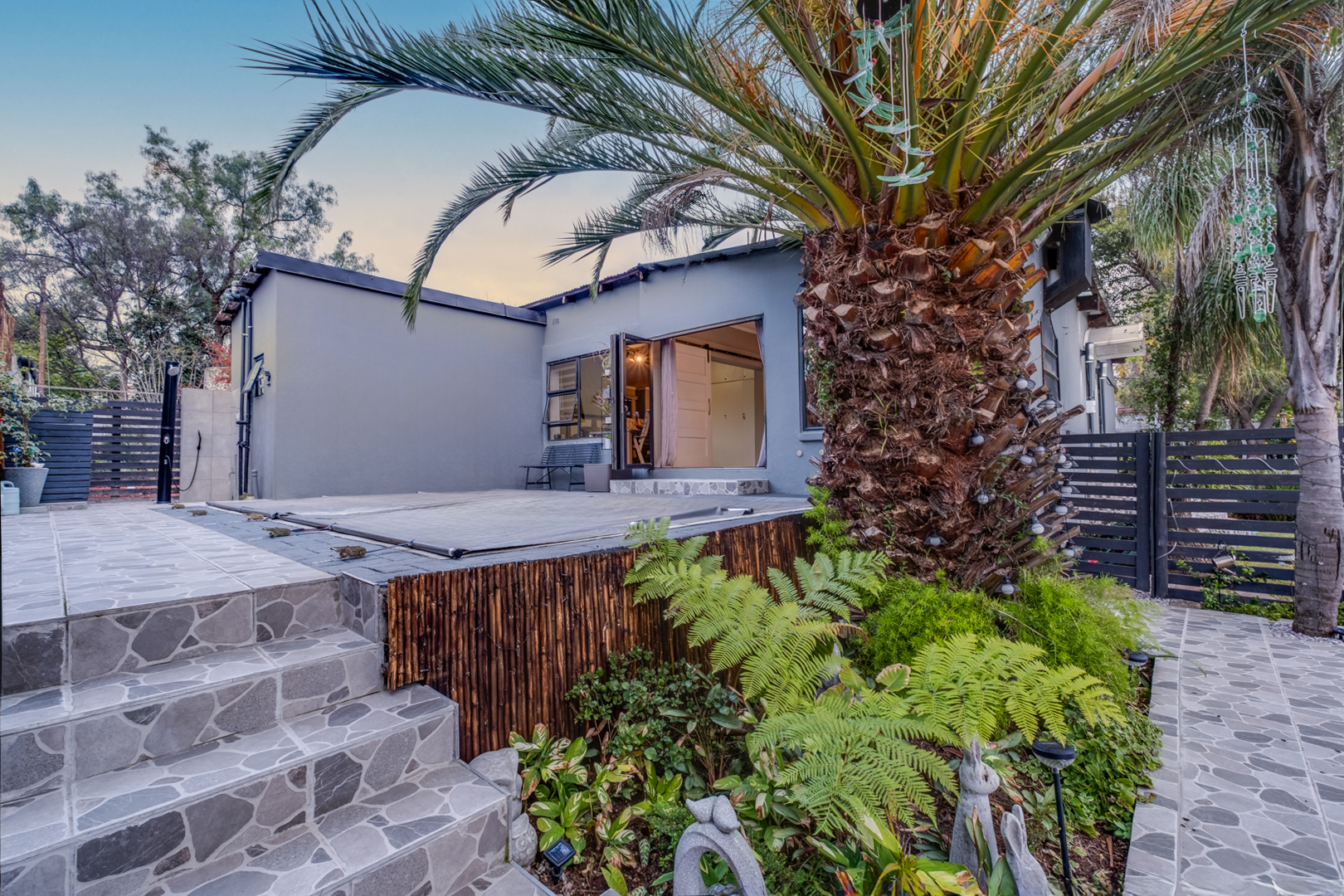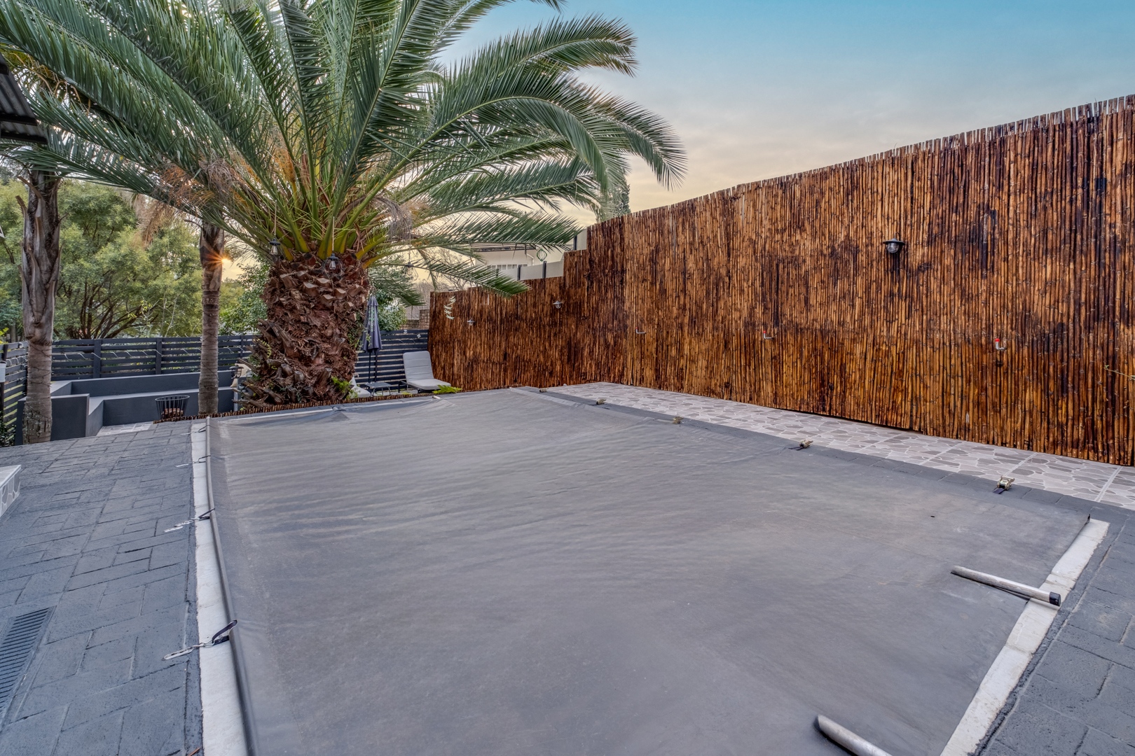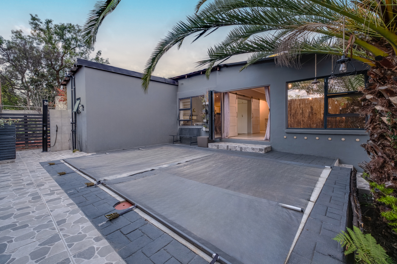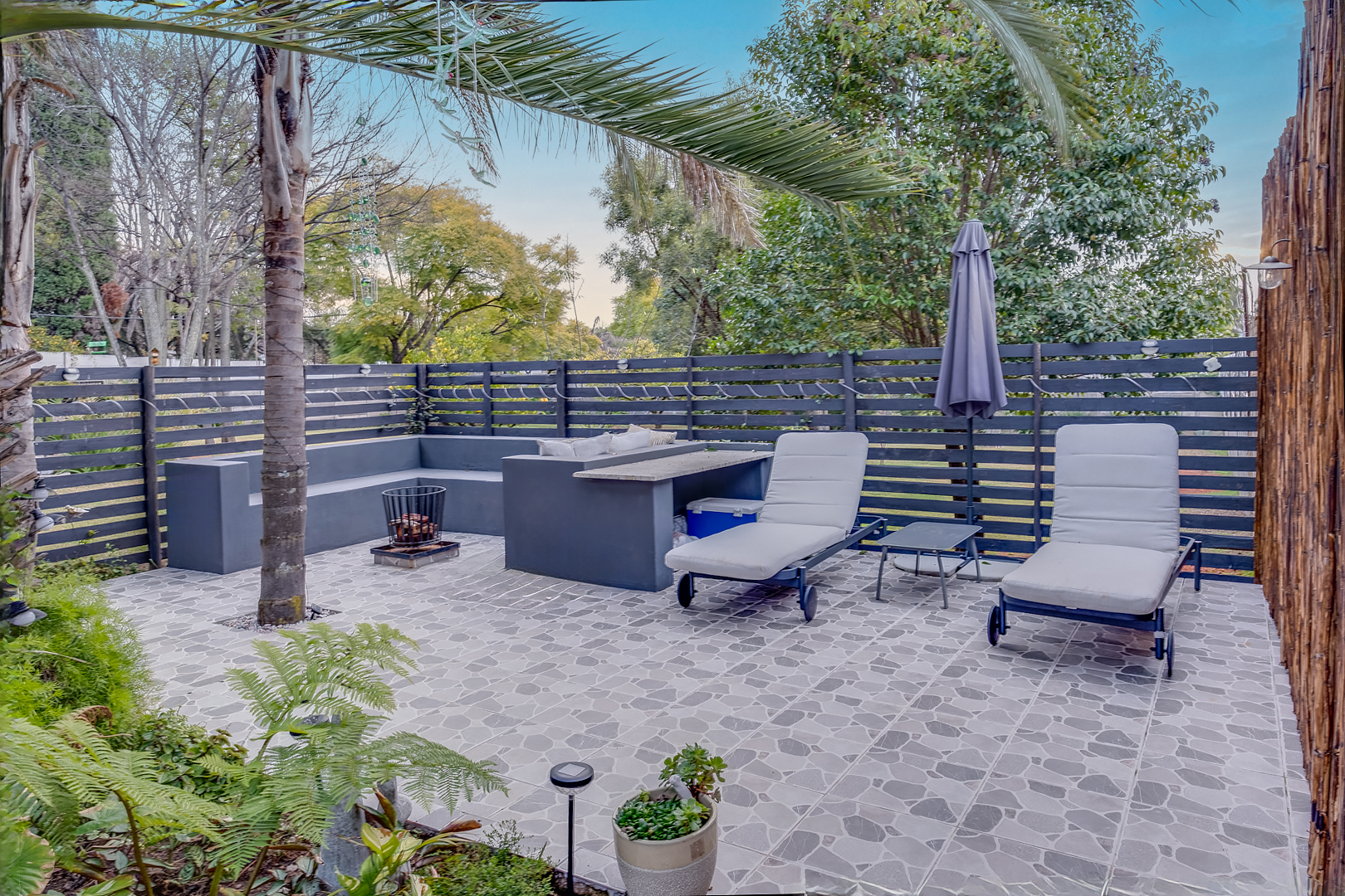 Additional living area is open plan with the TV room, featuring tiled flooring, a large north-facing door leading to the pool, granite counter space, a built-in braai, and access to the second bedroom