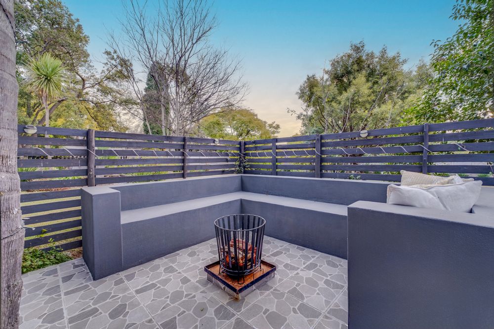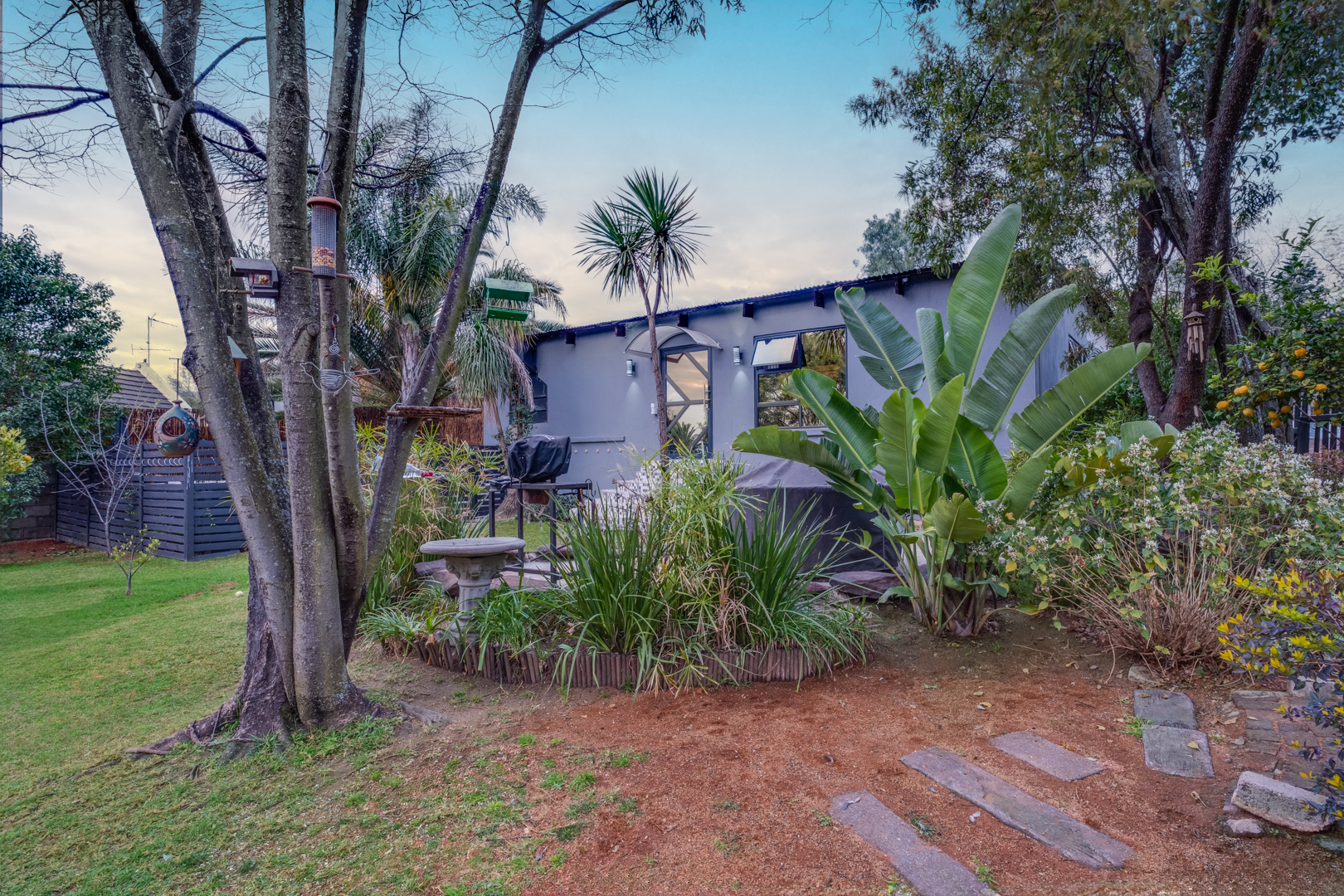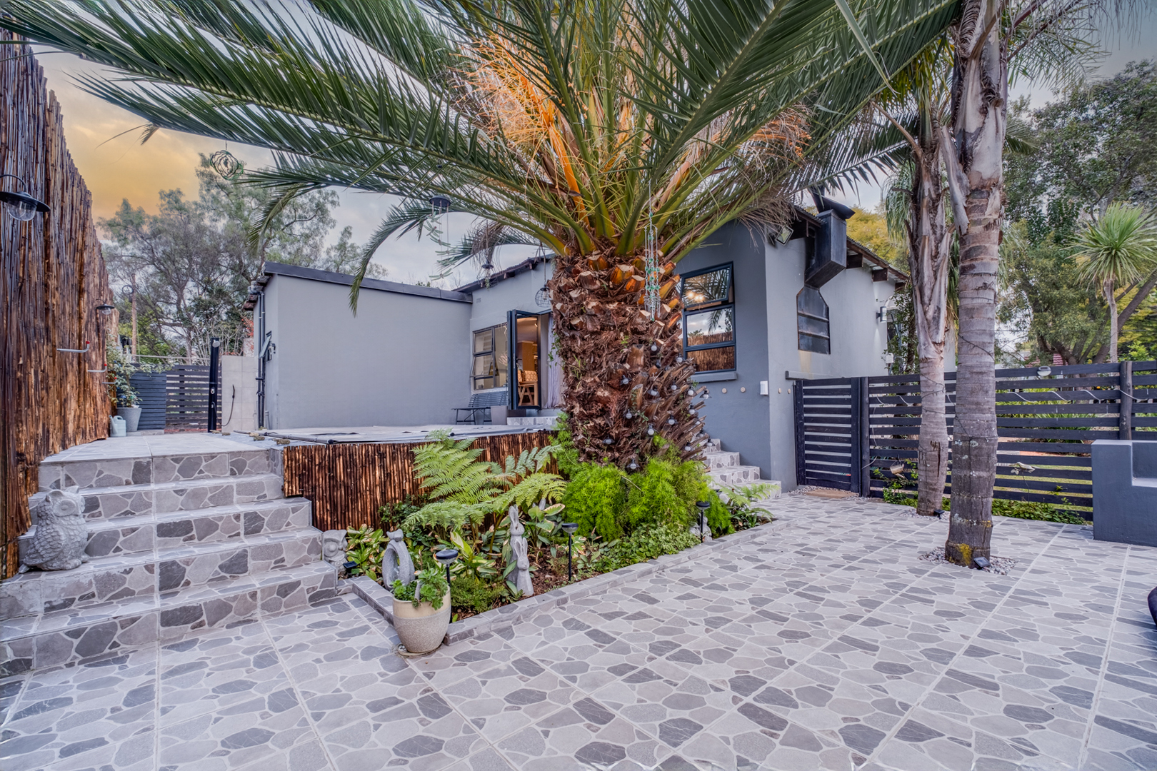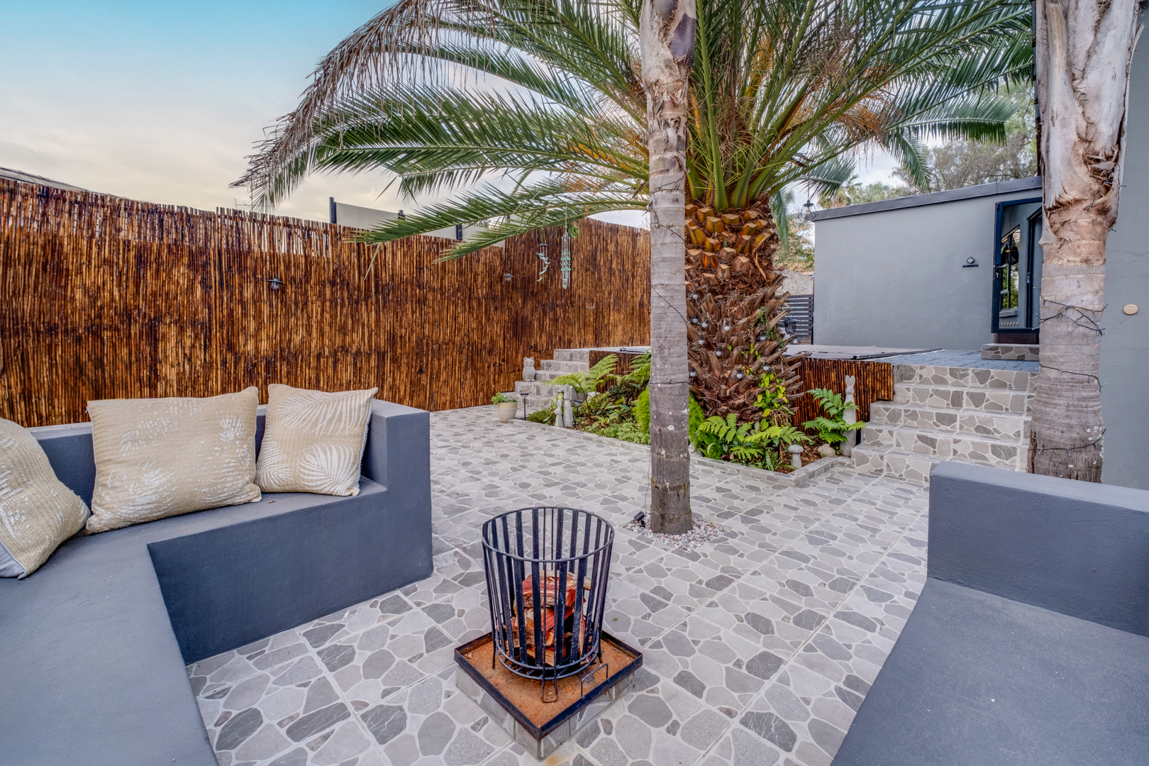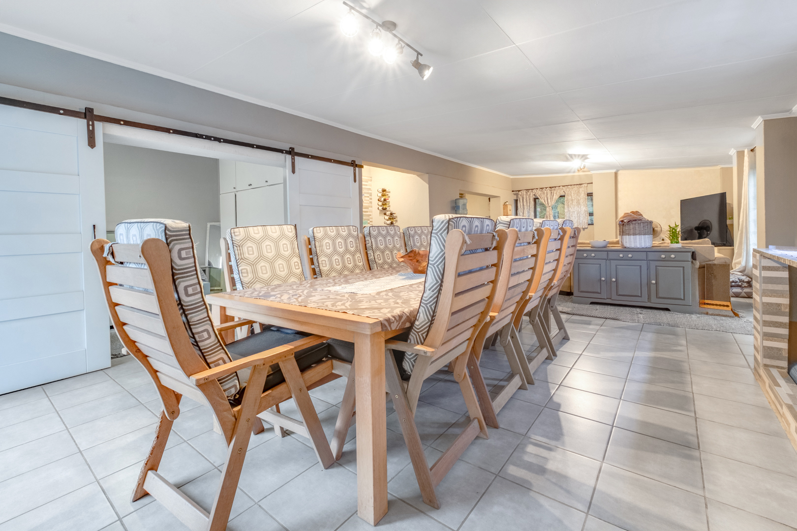 Additional living area is open plan with the TV room, featuring tiled flooring, a large north-facing door leading to the pool, granite counter space, a built-in braai, and access to the second bedroom