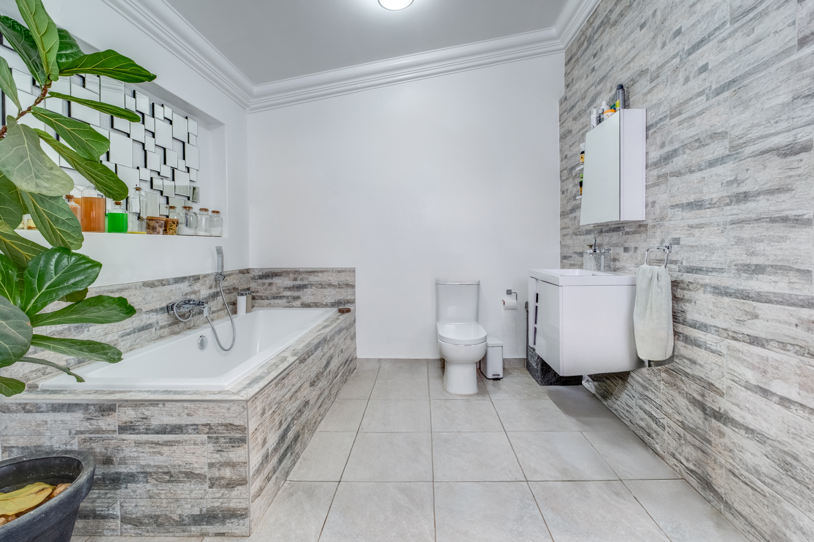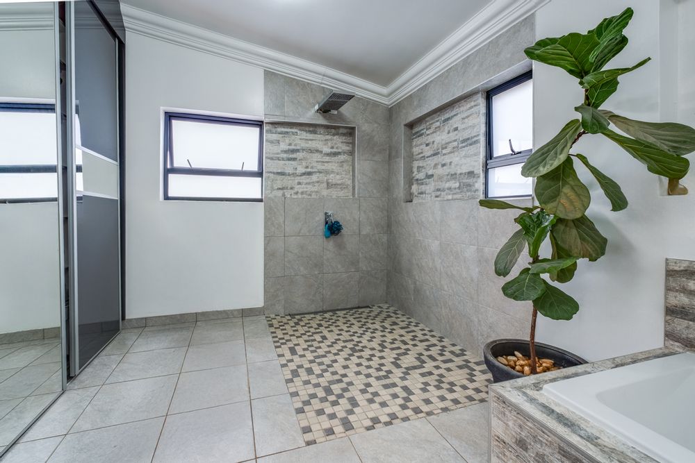 Main en-suite bathroom with tiled flooring, a no-lip shower, large north- and east-facing windows, basin, and a WC