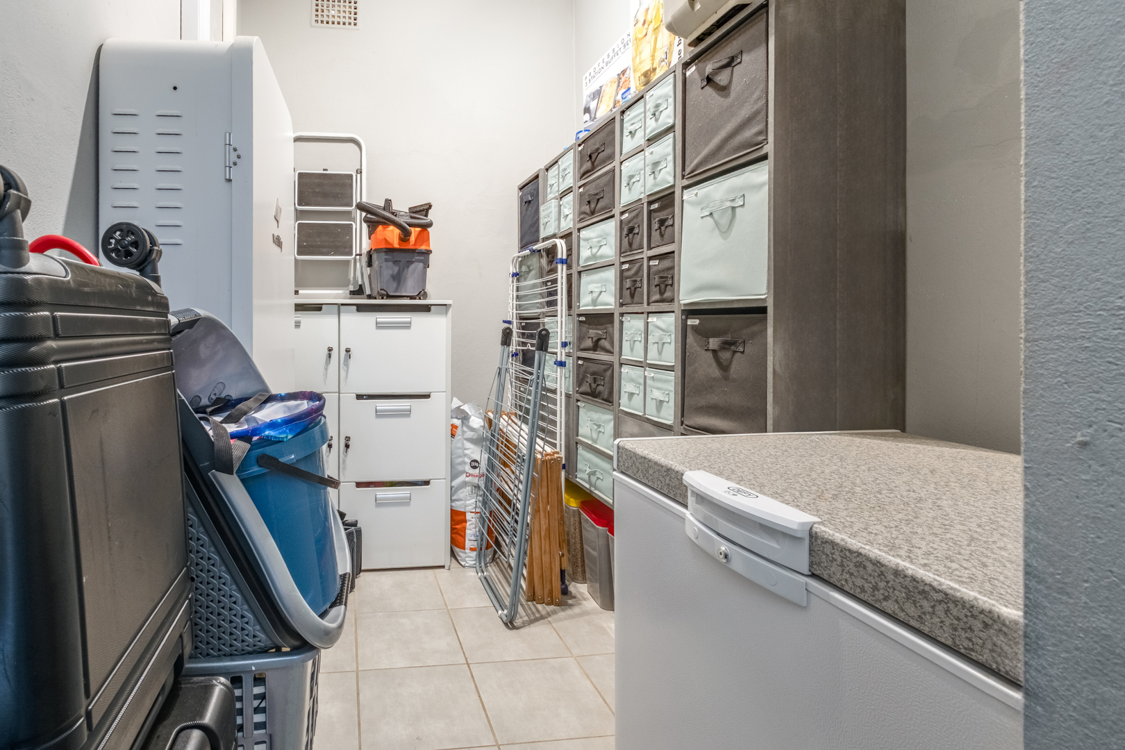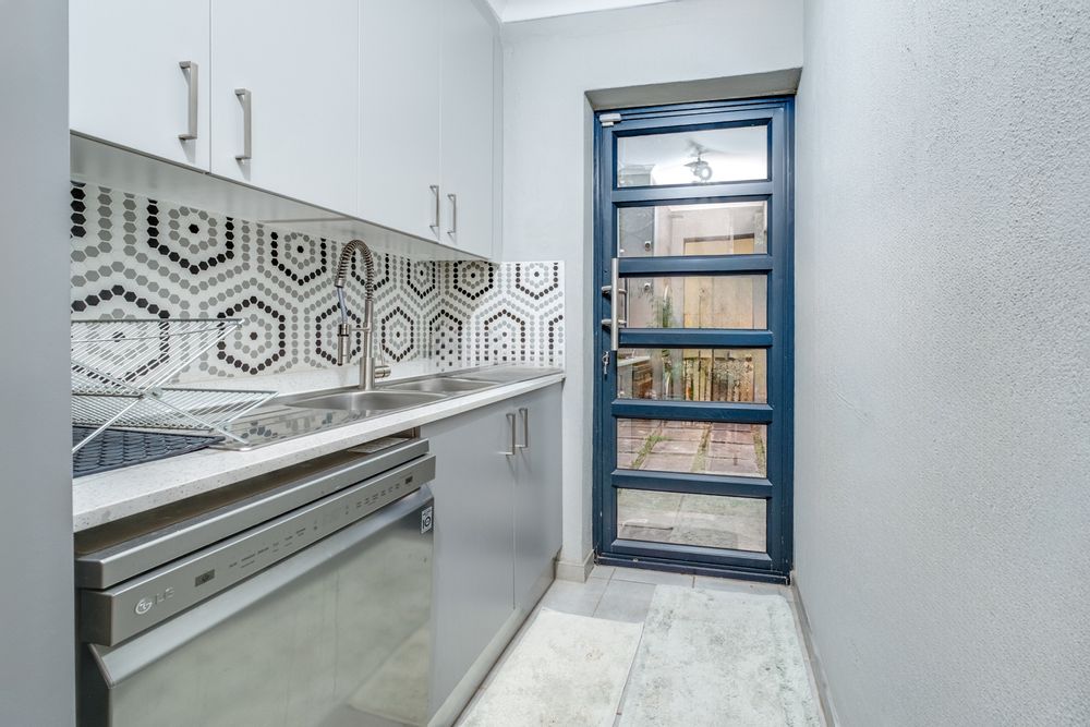 Scullery with tiled flooring, space for three appliances, built-in cupboards, double sink, and a door to the garages