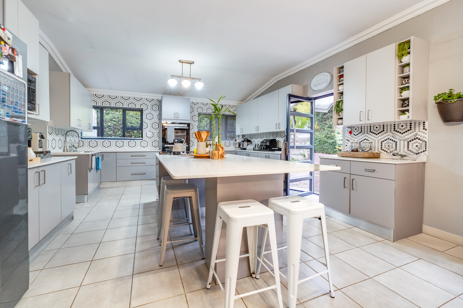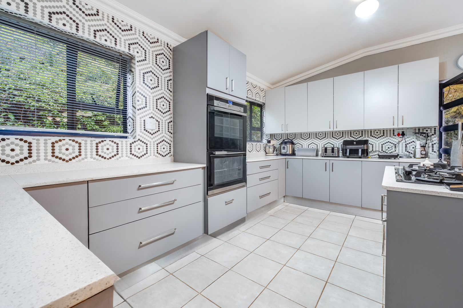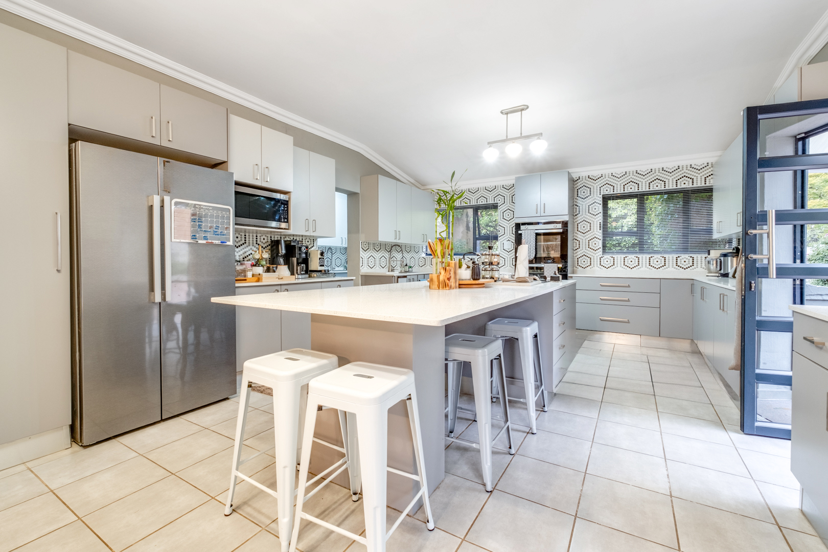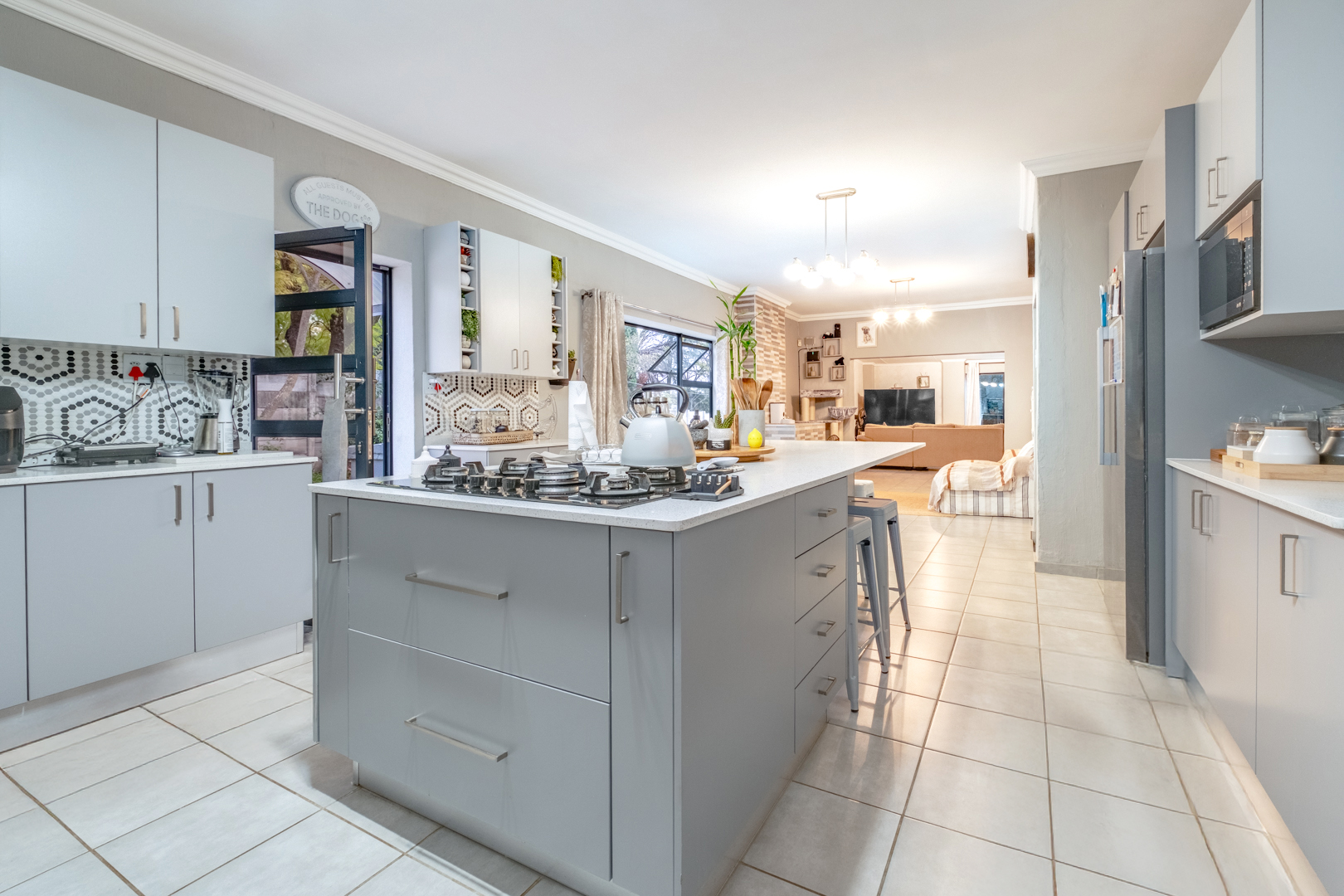Kitchen with modern finishes, tiled flooring, Caesarstone countertops, ample built-in cupboard space, a central island with additional cupboards, a 5-plate gas hob, double eye-level oven, space for a double fridge and microwave, and a prep bowl