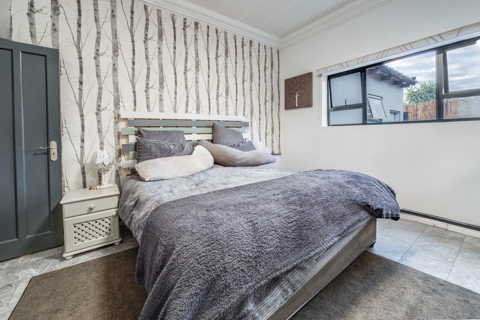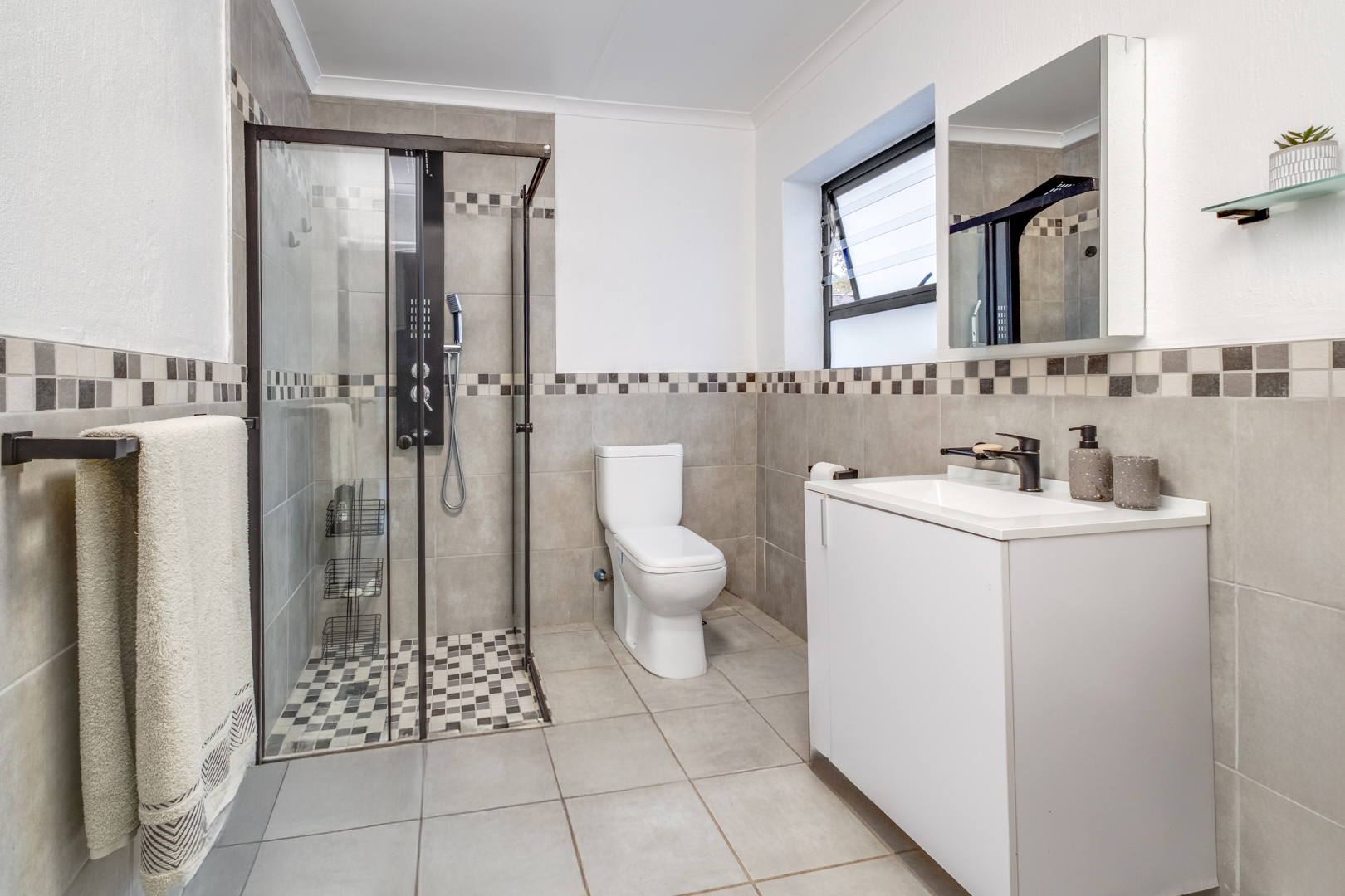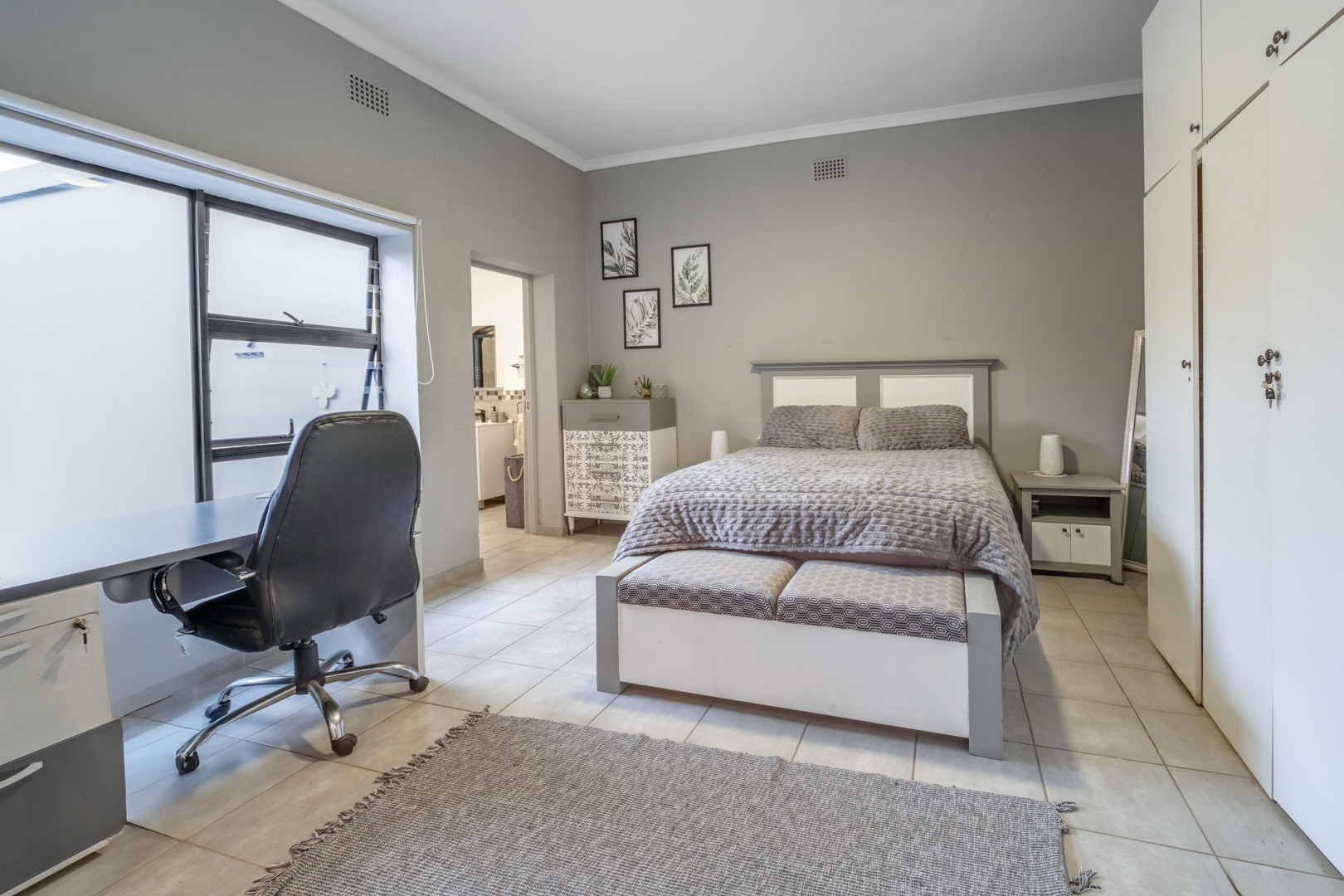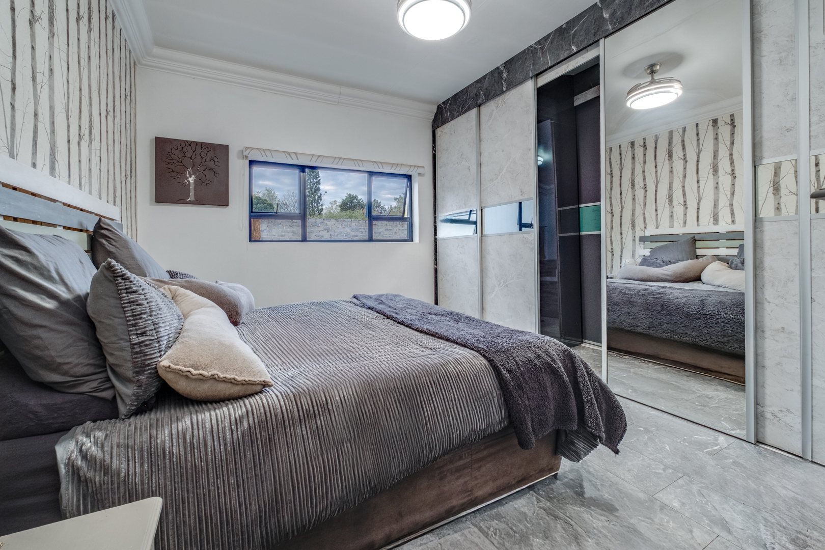 Second bedroom with tiled flooring, generous built-in cupboard space, a large north-facing window with clear security bars, and an en-suite bathroom featuring half-height tiling, a basin with storage, a window with clear security bars, a WC, and a modern shower
