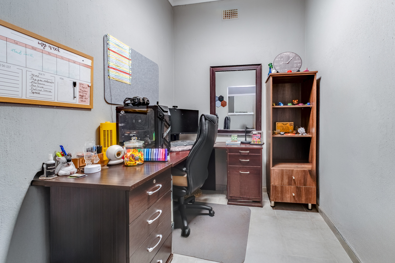 Office located in the hallway to the main bedroom, with tiled floors and natural lighting