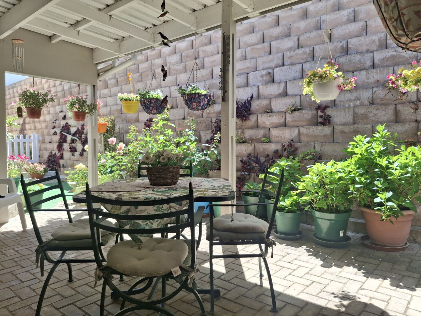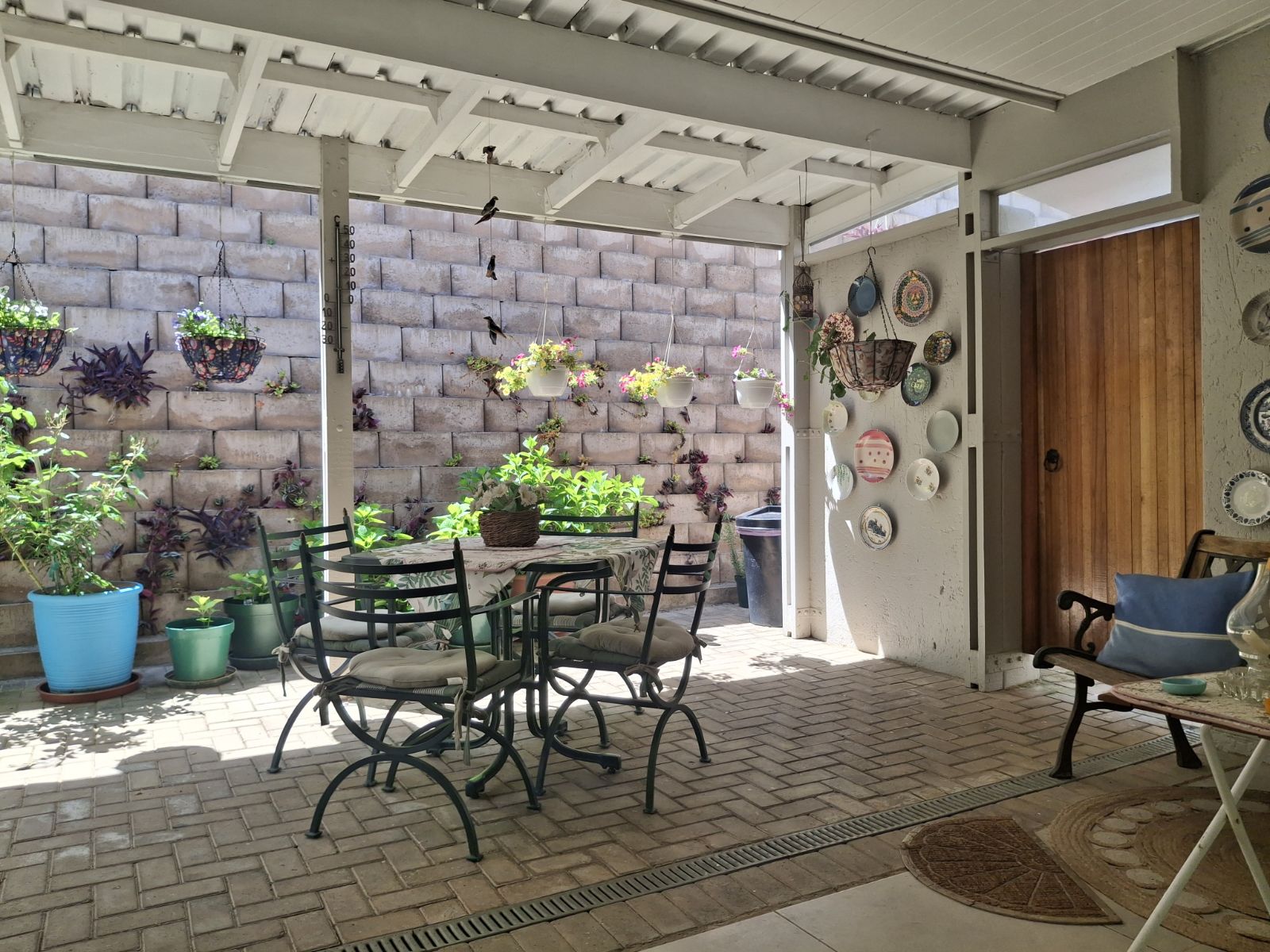 Covered braai area in fenced back garden with shelving and built-in braai storage