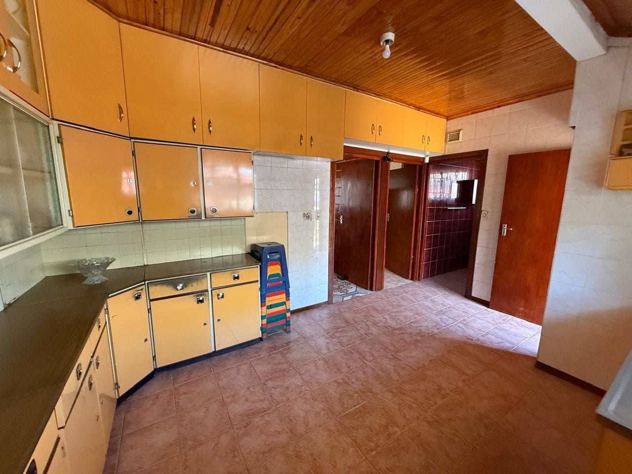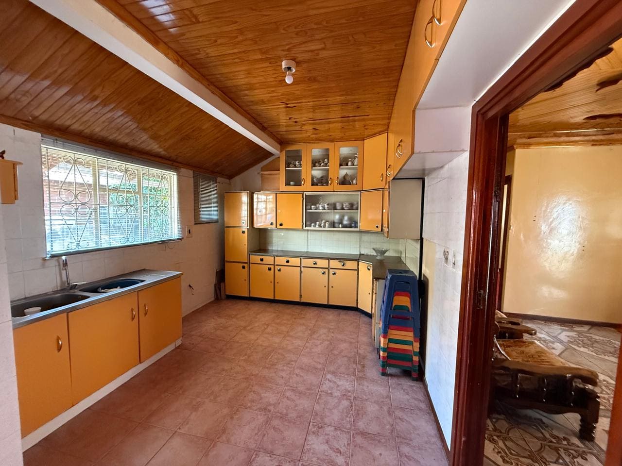 The kitchen is fitted with steel cupboards and a double sink. Knotty pine ceilings and tiled floors make this a functional and easy-to-maintain space. A braai area provides an additional outdoor living option for everyday use.
