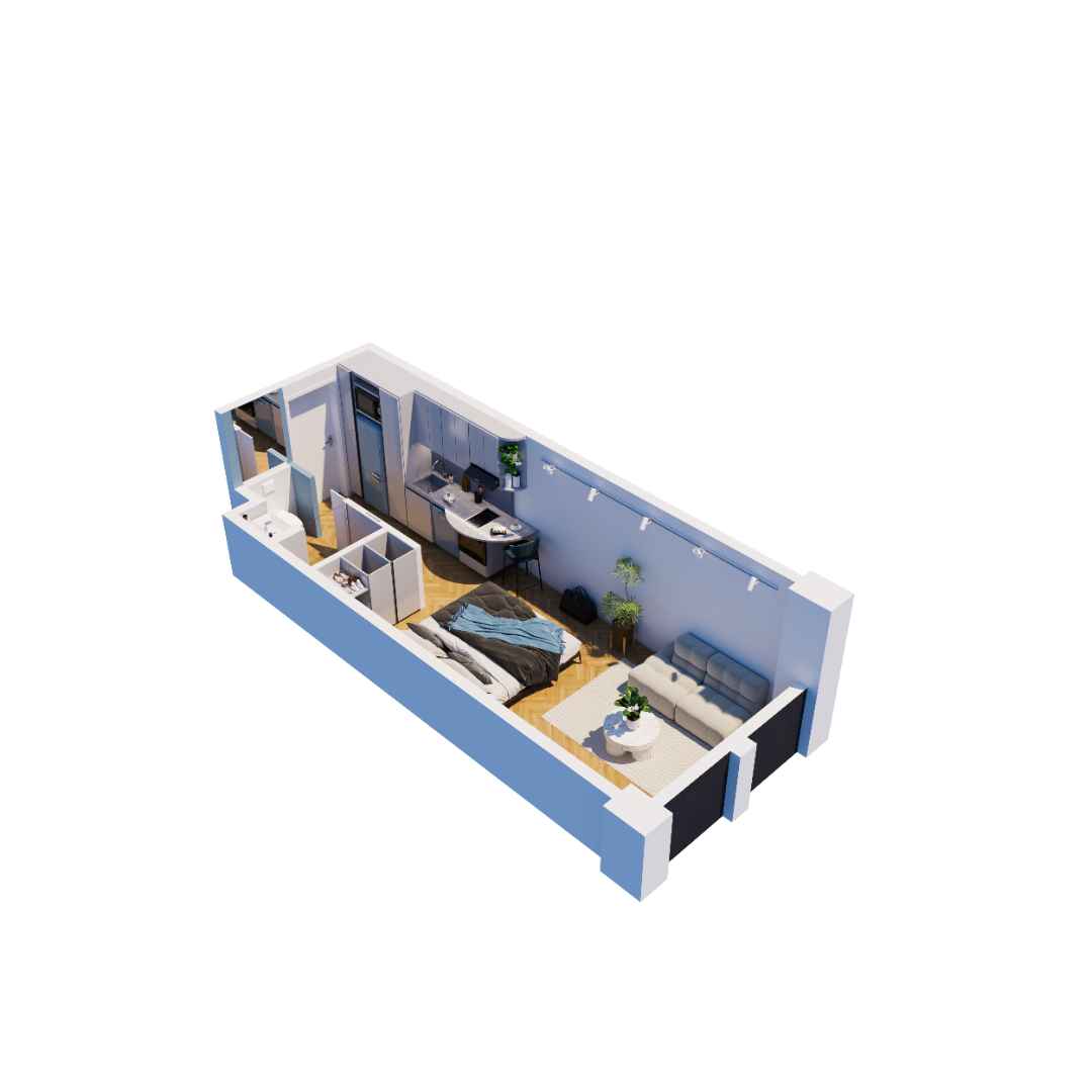 This well-designed studio apartment boasts a compact and efficient layout, making it an ideal choice for city living or a short-term rental investment. The open-plan features a built-in kitchen, a comfortable living and sleeping area and a modern bathroom with contemporary finishes and a walk-in shower.