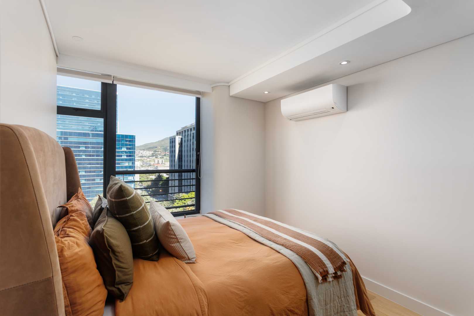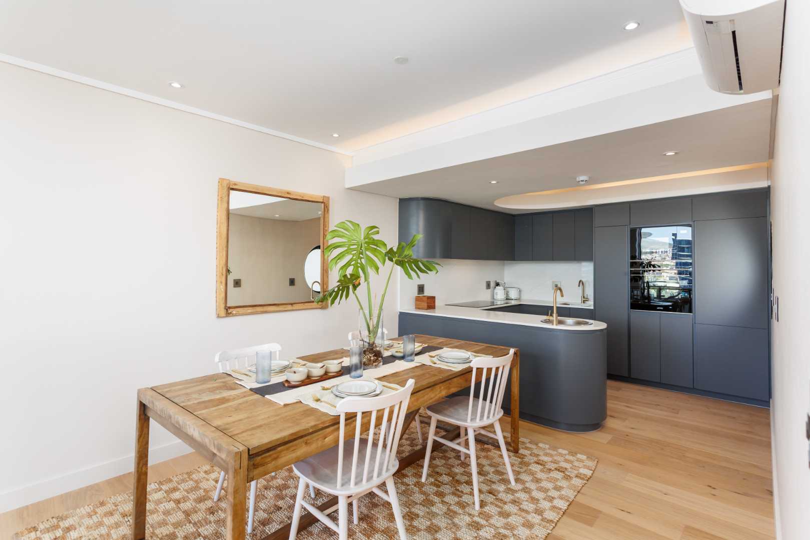 The open-plan layout creates a natural flow between the kitchen, dining and living areas. Floor-to-ceiling stacking doors open onto a spacious terrace where uninterrupted views of Cape Town’s most famous landmark become part of everyday living. From early morning light on the mountain to golden sunsets over the harbour, the terrace offers the perfect setting for relaxed entertaining, al fresco dining or sundowners with friends.