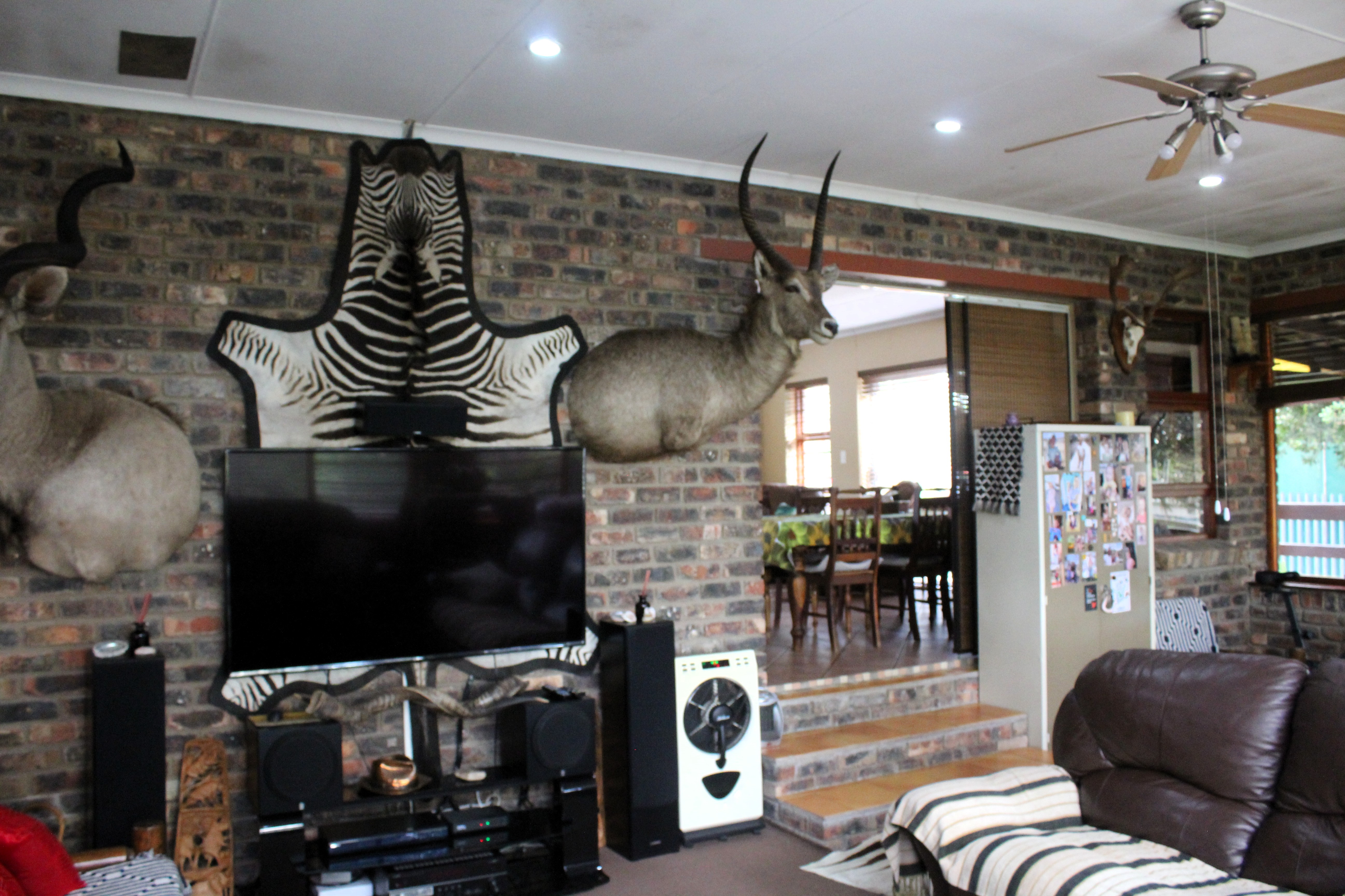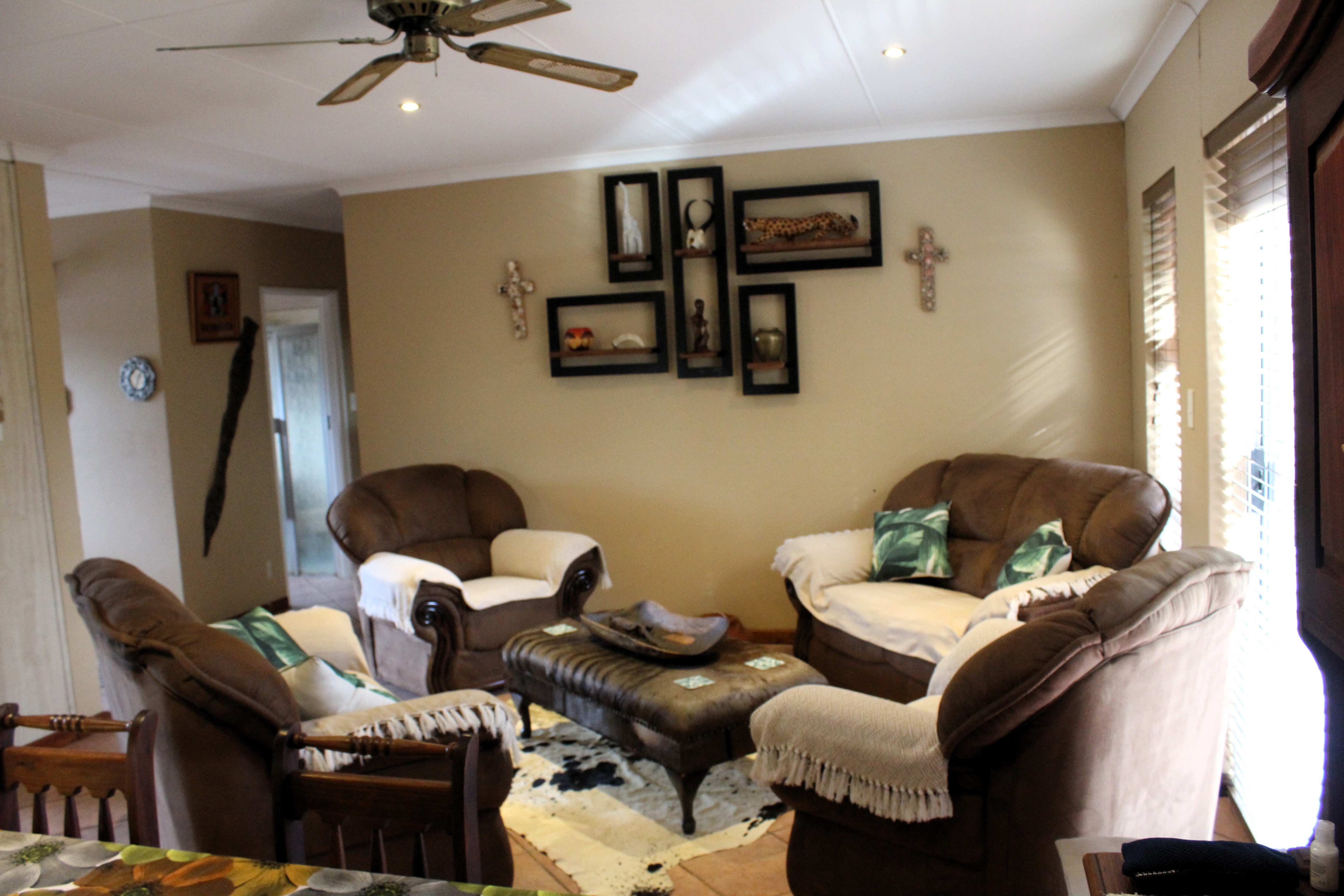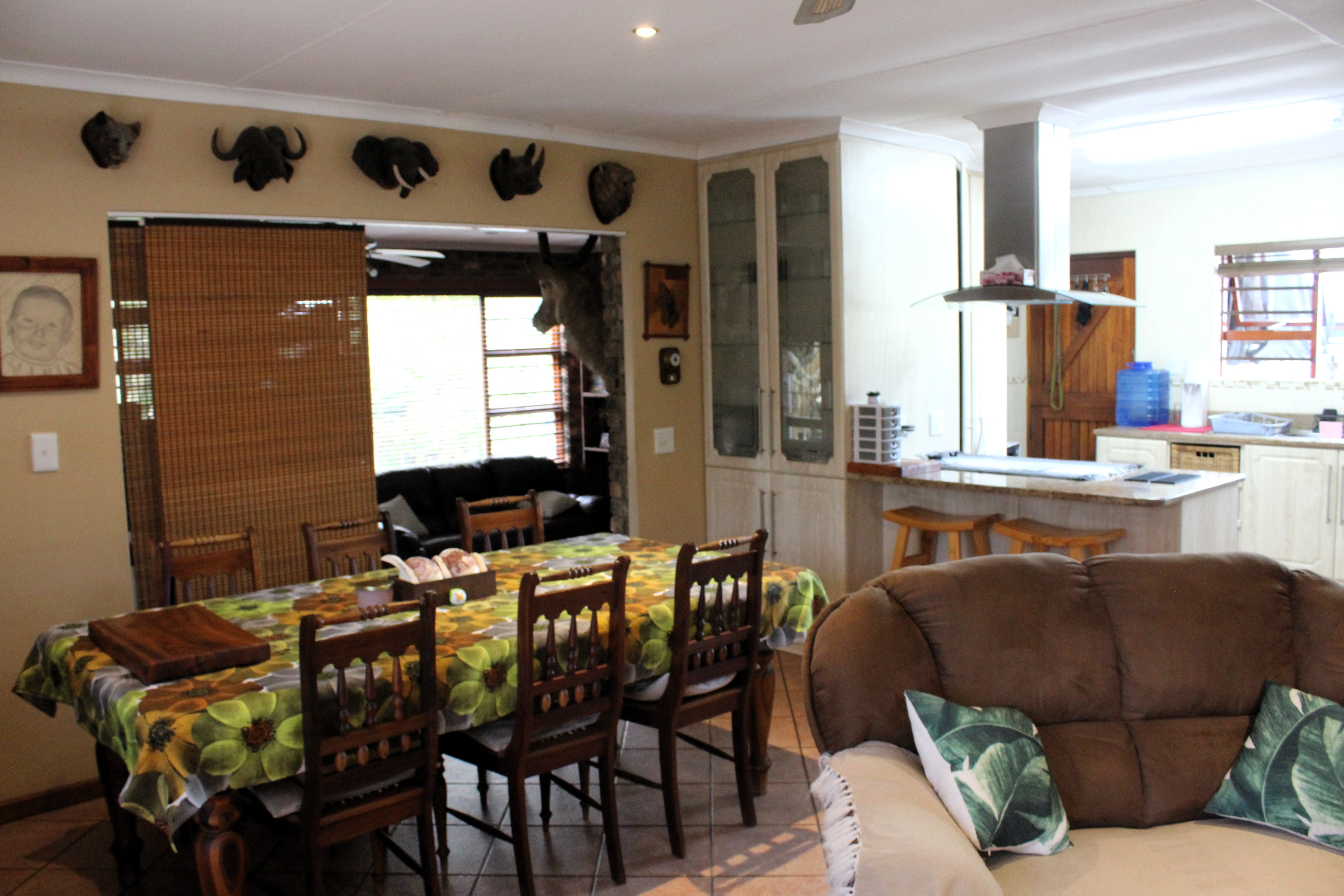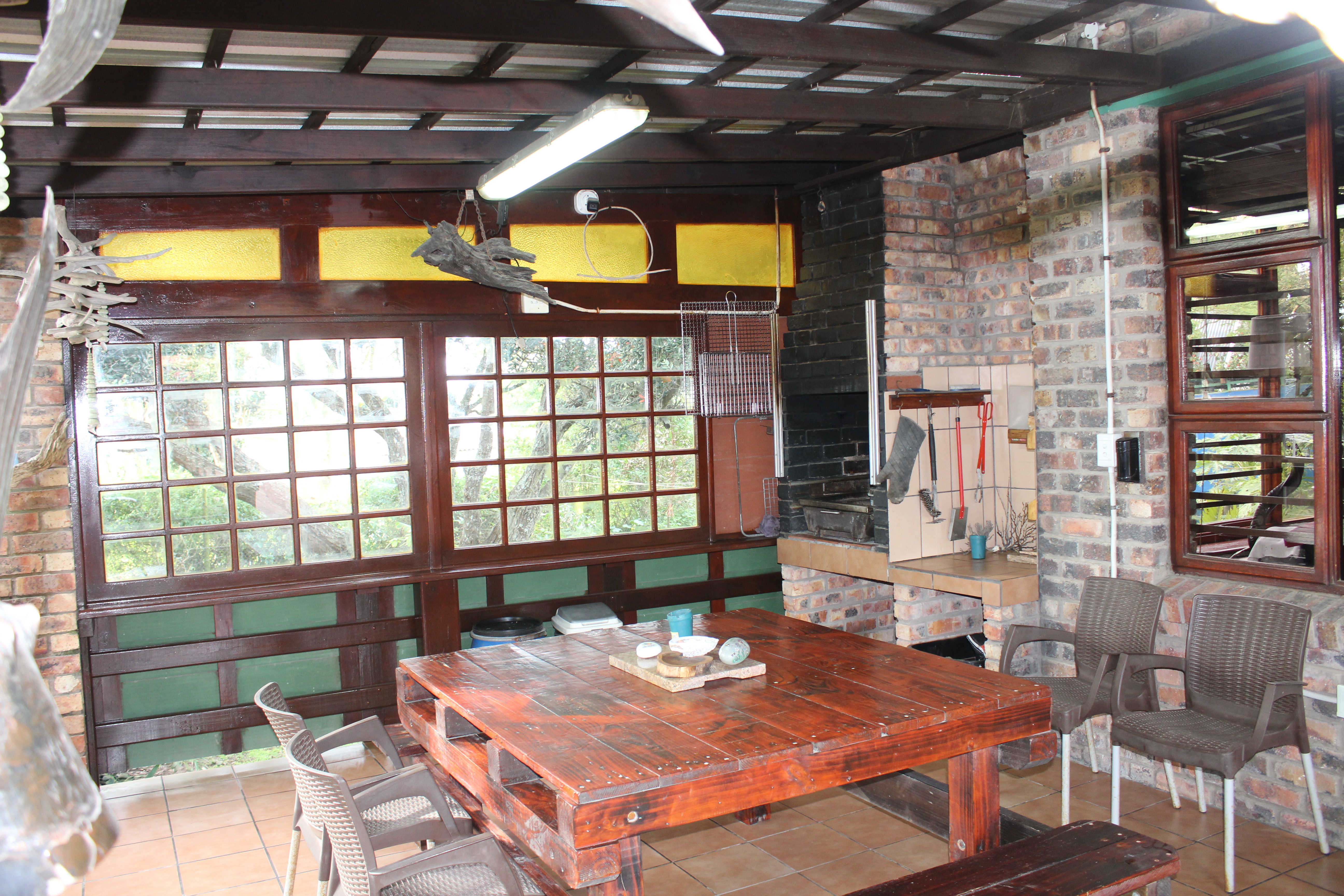 The main house is thoughtfully designed for effortless entertaining and comfortable living. The open-plan kitchen seamlessly connects to the dining and lounge areas, creating a spacious and welcoming environment. Step down into the cozy TV lounge, which opens onto a covered patio complete with a built-in braai — the perfect setting for hosting friends and family year-round.