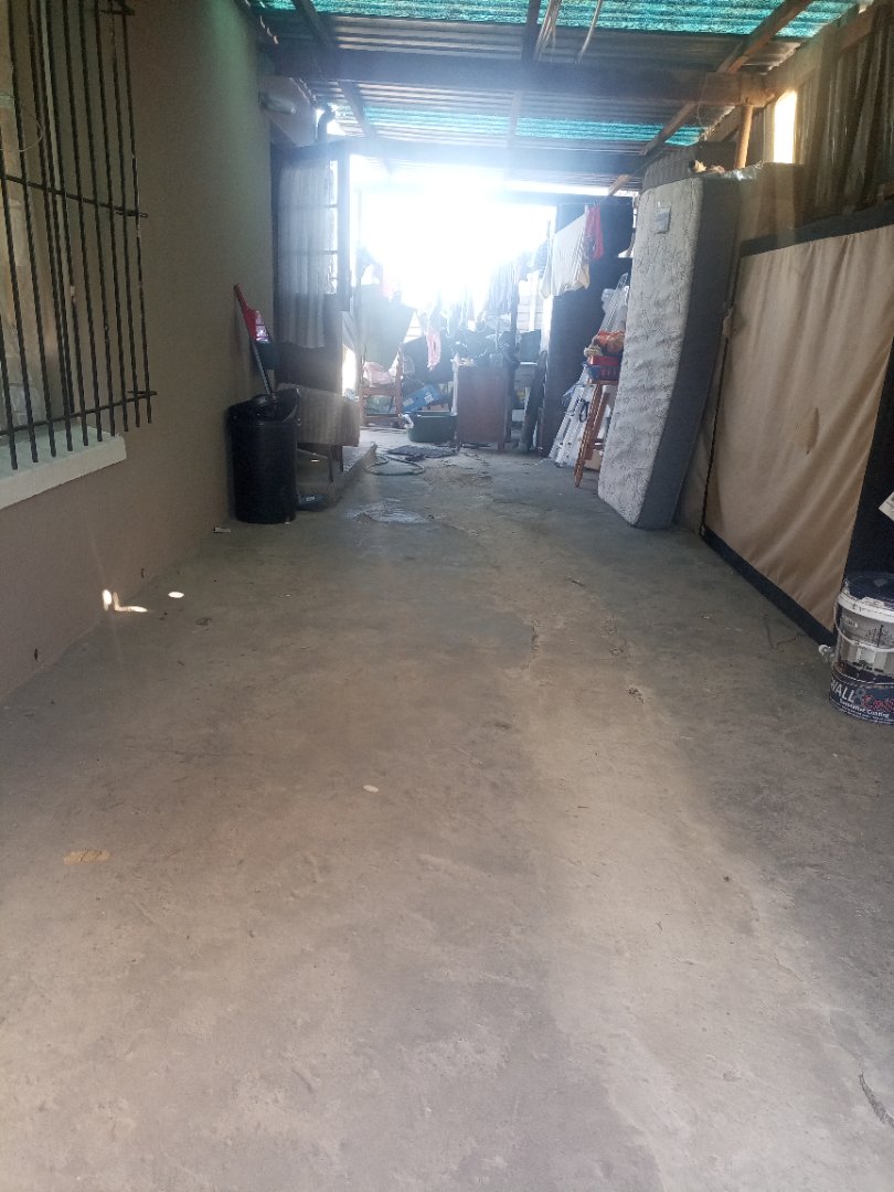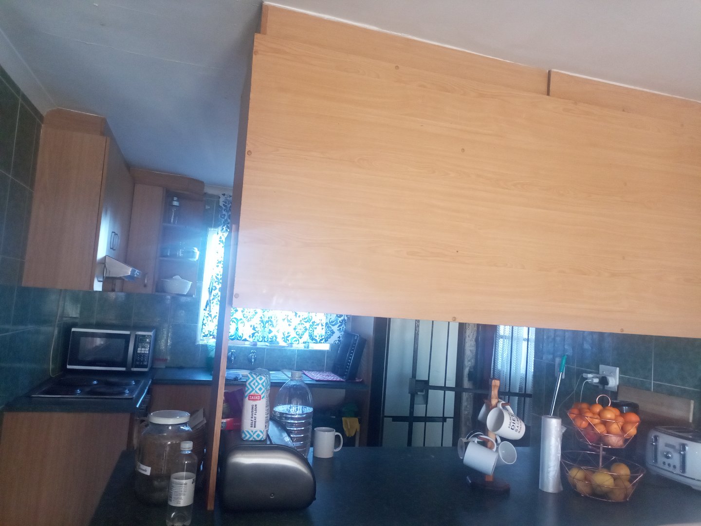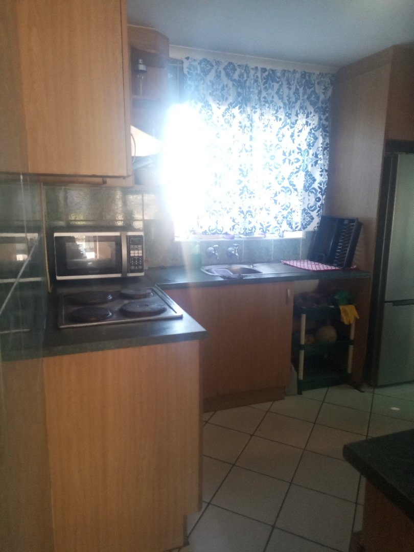 The home features a fully fitted kitchen that flows into a spacious lounge area, perfect for everyday living and entertaining. The main bedroom includes built-in cupboards, while the garage can accommodate two small vehicles securely.