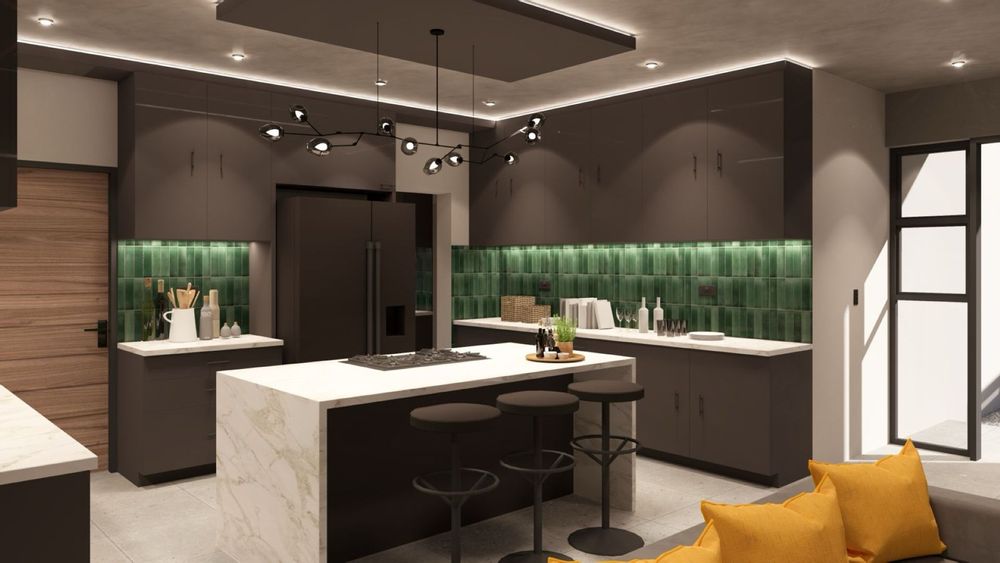Entering through a covered entrance, you’re welcomed into a spacious open-plan layout where the kitchen overlooks the lounge and dining area — perfect for modern family living and entertaining. The kitchen features a central island with a built-in stove that doubles as a breakfast nook, complemented by a sleek prep bowl counter. A walk-in pantry provides ample storage, while the adjoining scullery offers direct access to the double garage and leads out to the kitchen yard.