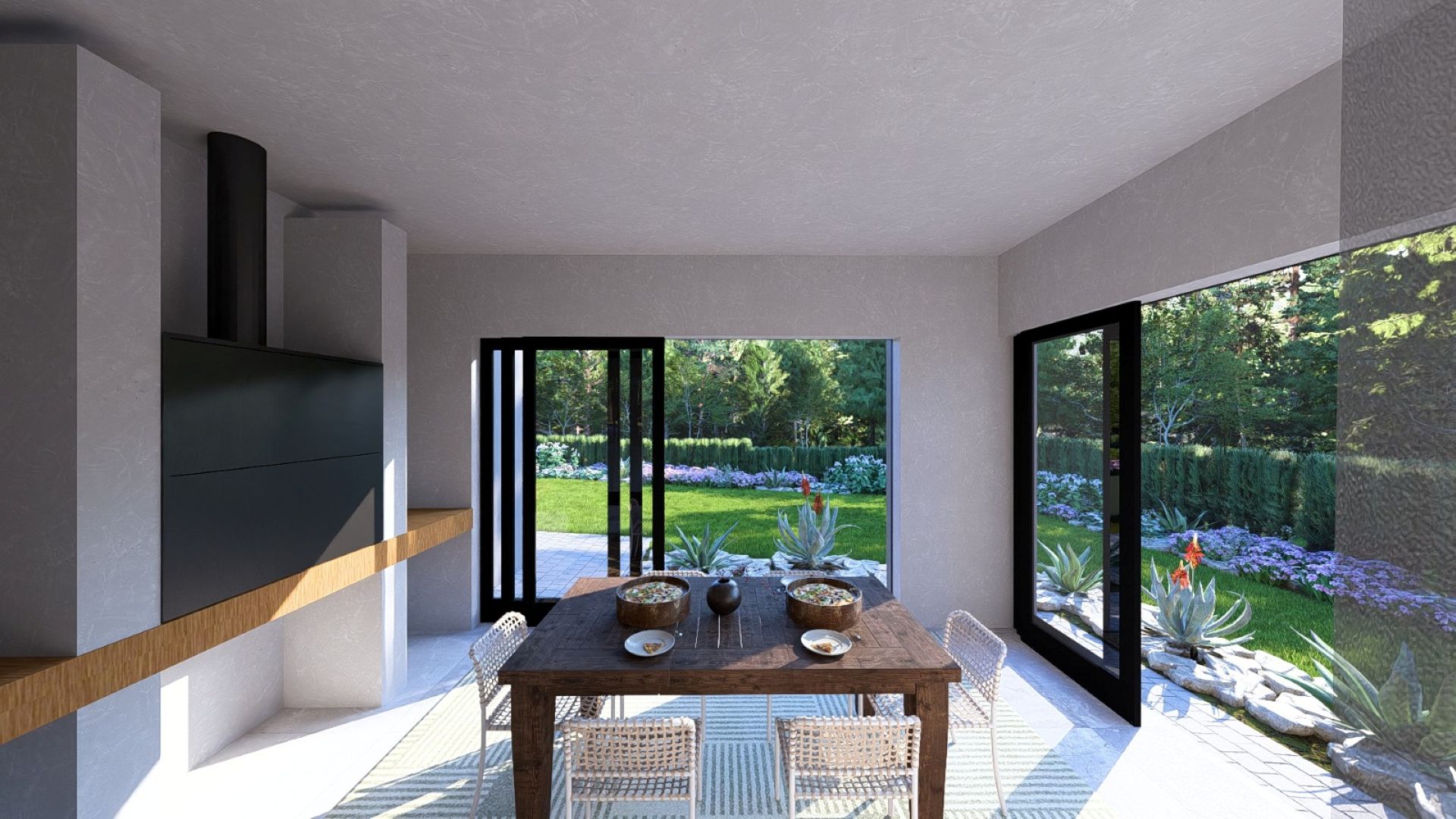 The dining area flows effortlessly into the lounge, creating a seamless space for family living and entertaining. Adjacent to the dining room, sliding doors open to a covered patio featuring a built-in braai and views of the private garden—ideal for relaxed outdoor gatherings.