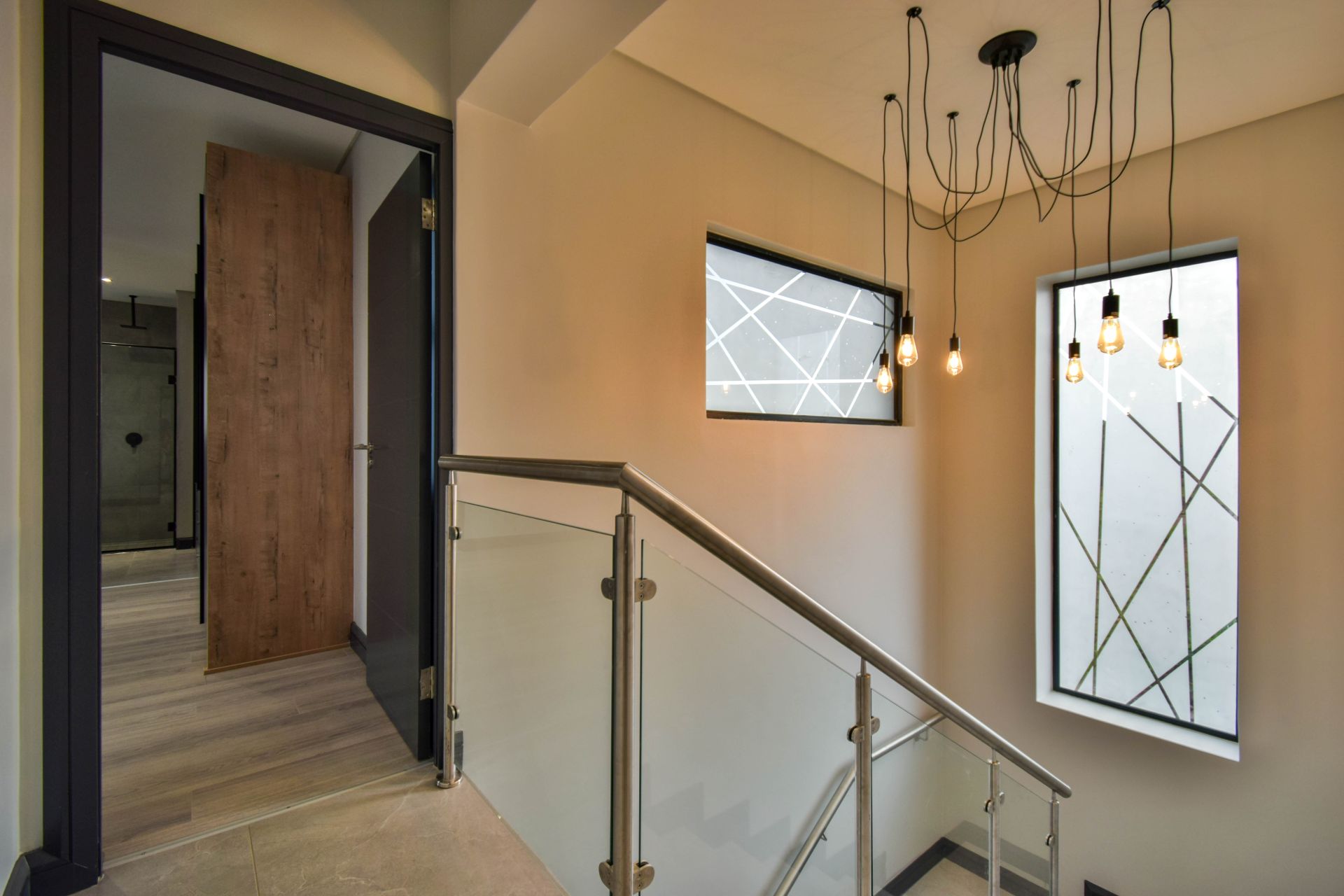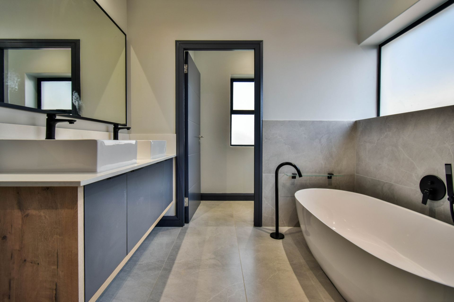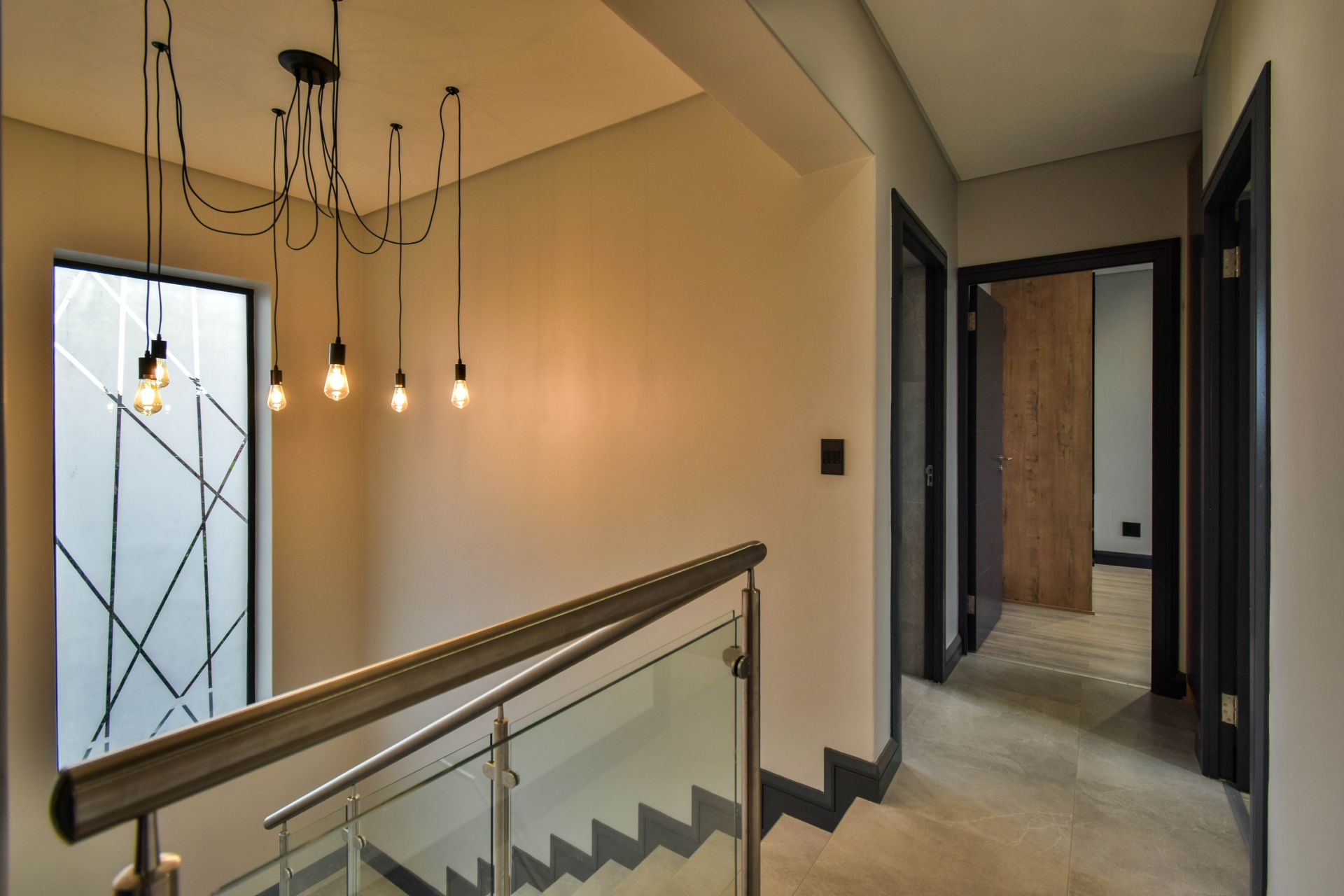 Upstairs, the landing divides the sleeping quarters. To the right, the generous main bedroom features a dressing area, full en-suite bathroom with a bathtub, shower, and his-and-hers basins, as well as a private balcony. To the left, two additional bedrooms share a stylish full bathroom with both a bathtub and a shower.