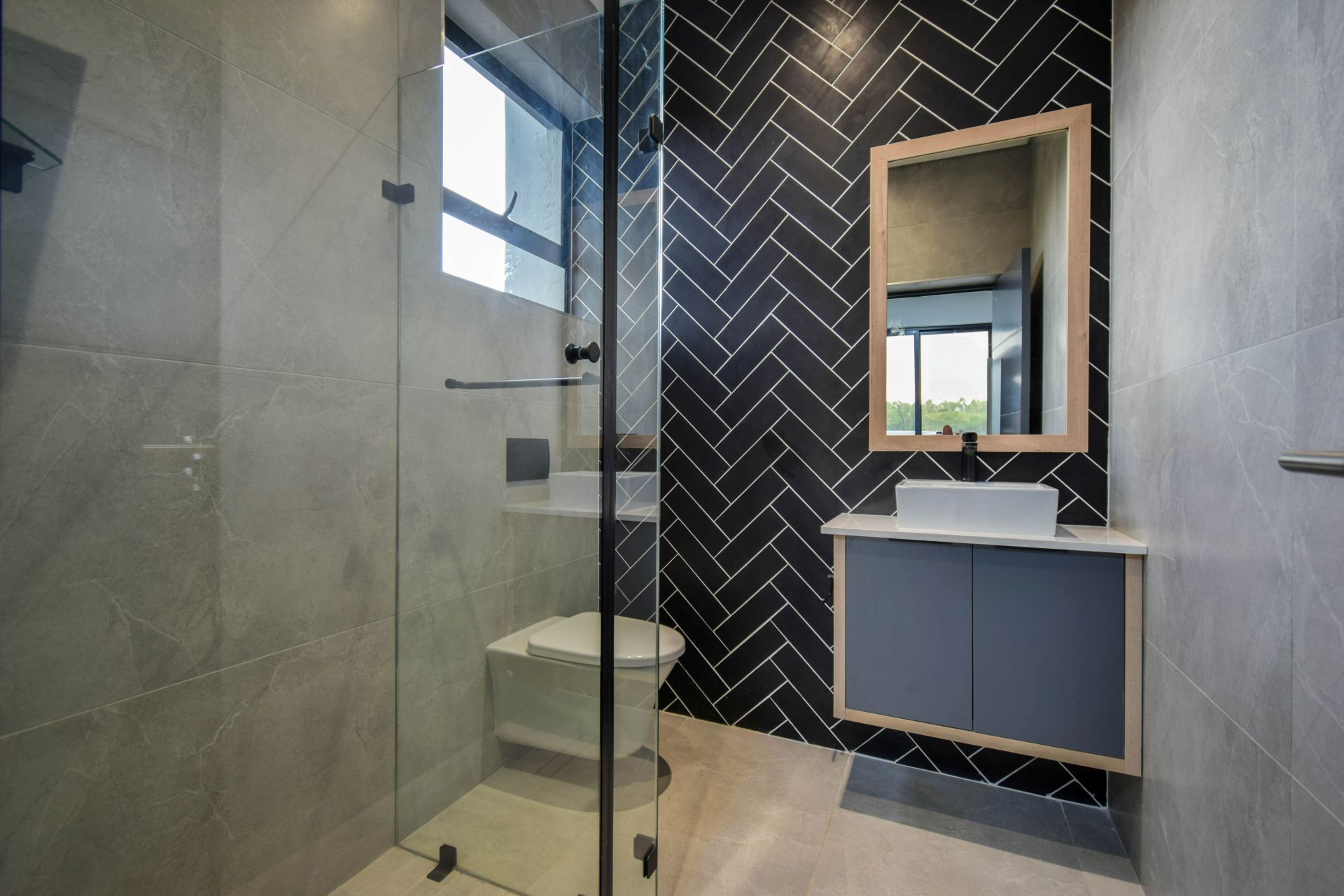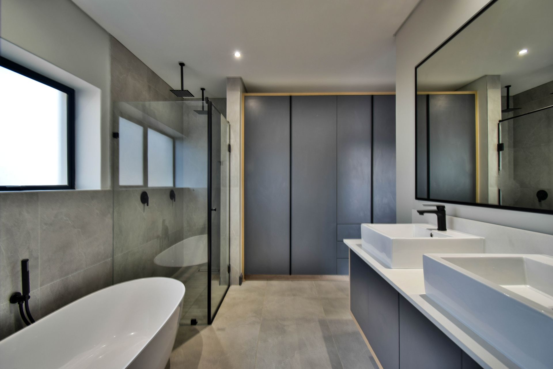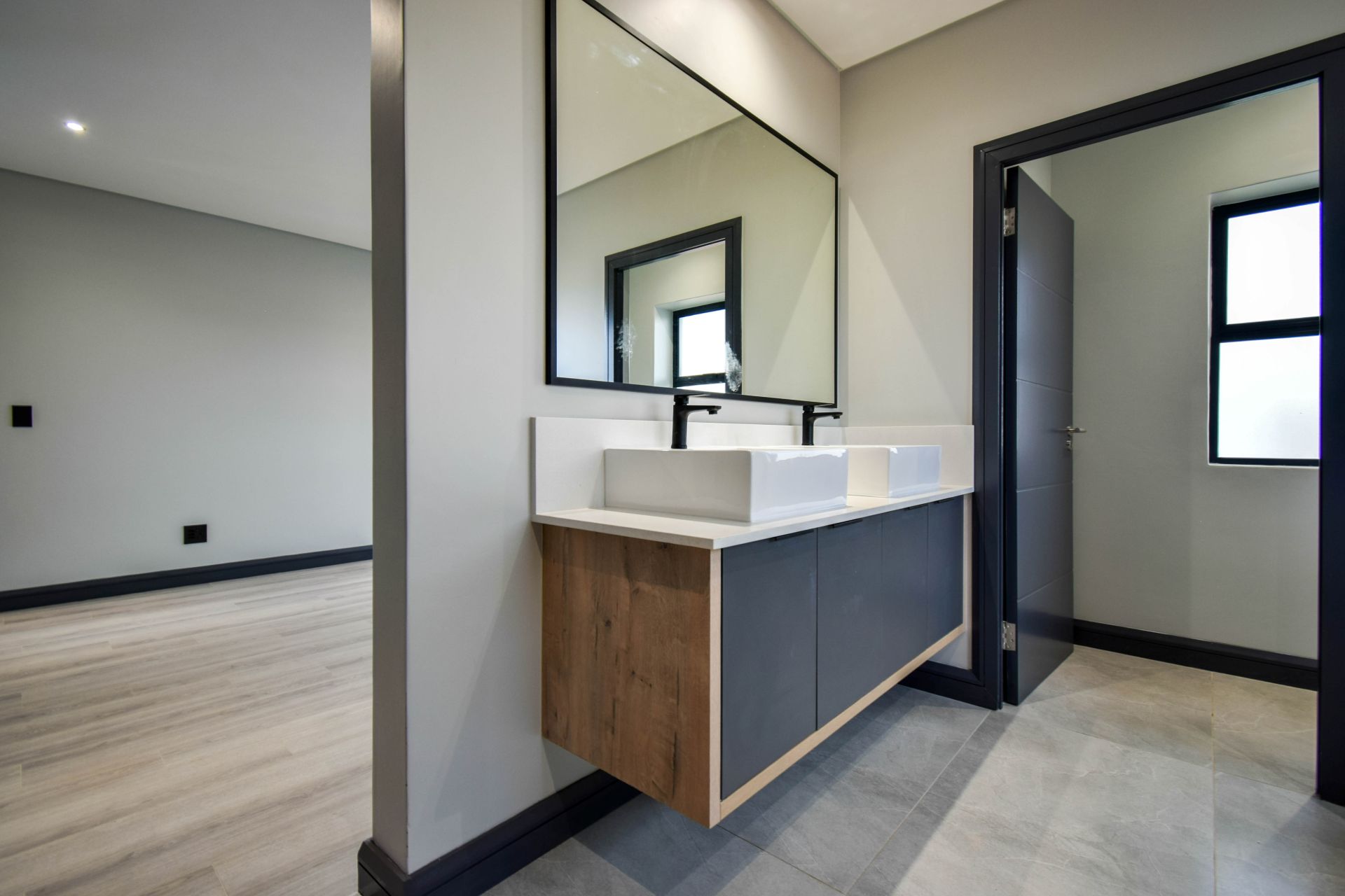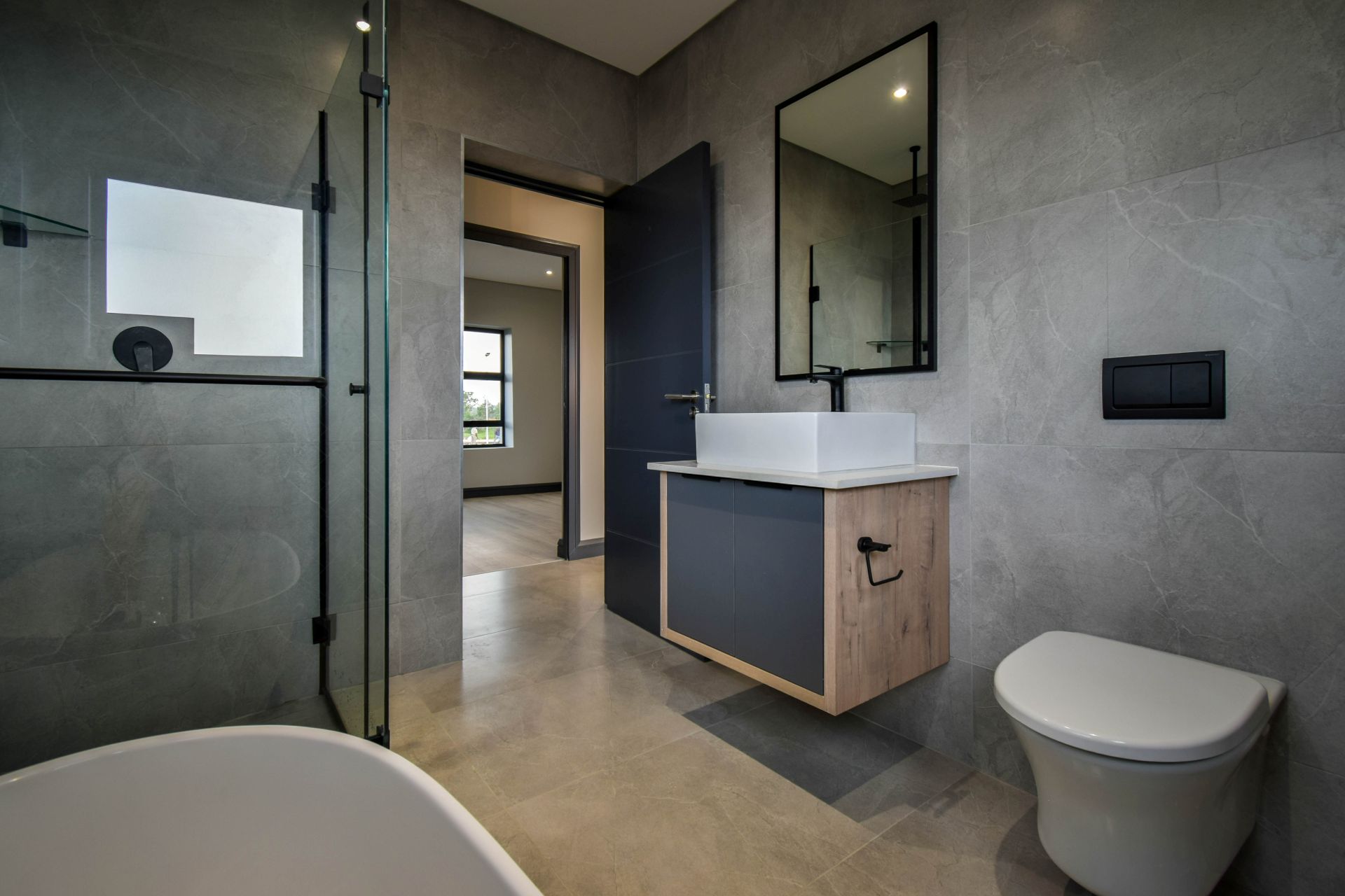 Upstairs, the landing divides the sleeping quarters. To the right, the generous main bedroom features a dressing area, full en-suite bathroom with a bathtub, shower, and his-and-hers basins, as well as a private balcony. To the left, two additional bedrooms share a stylish full bathroom with both a bathtub and a shower.