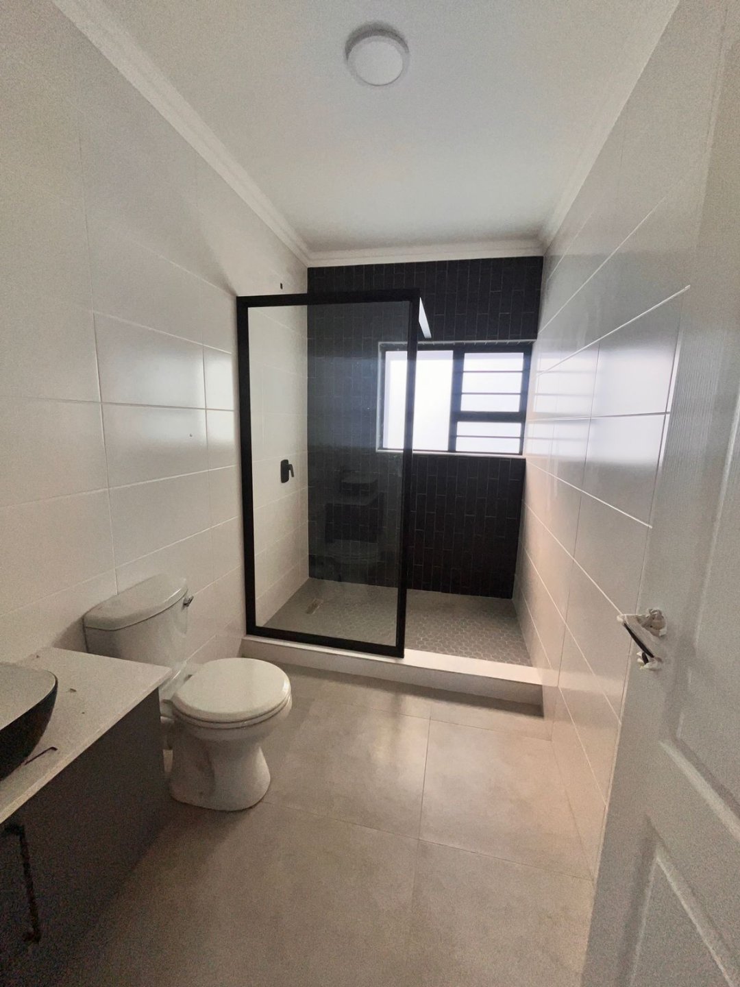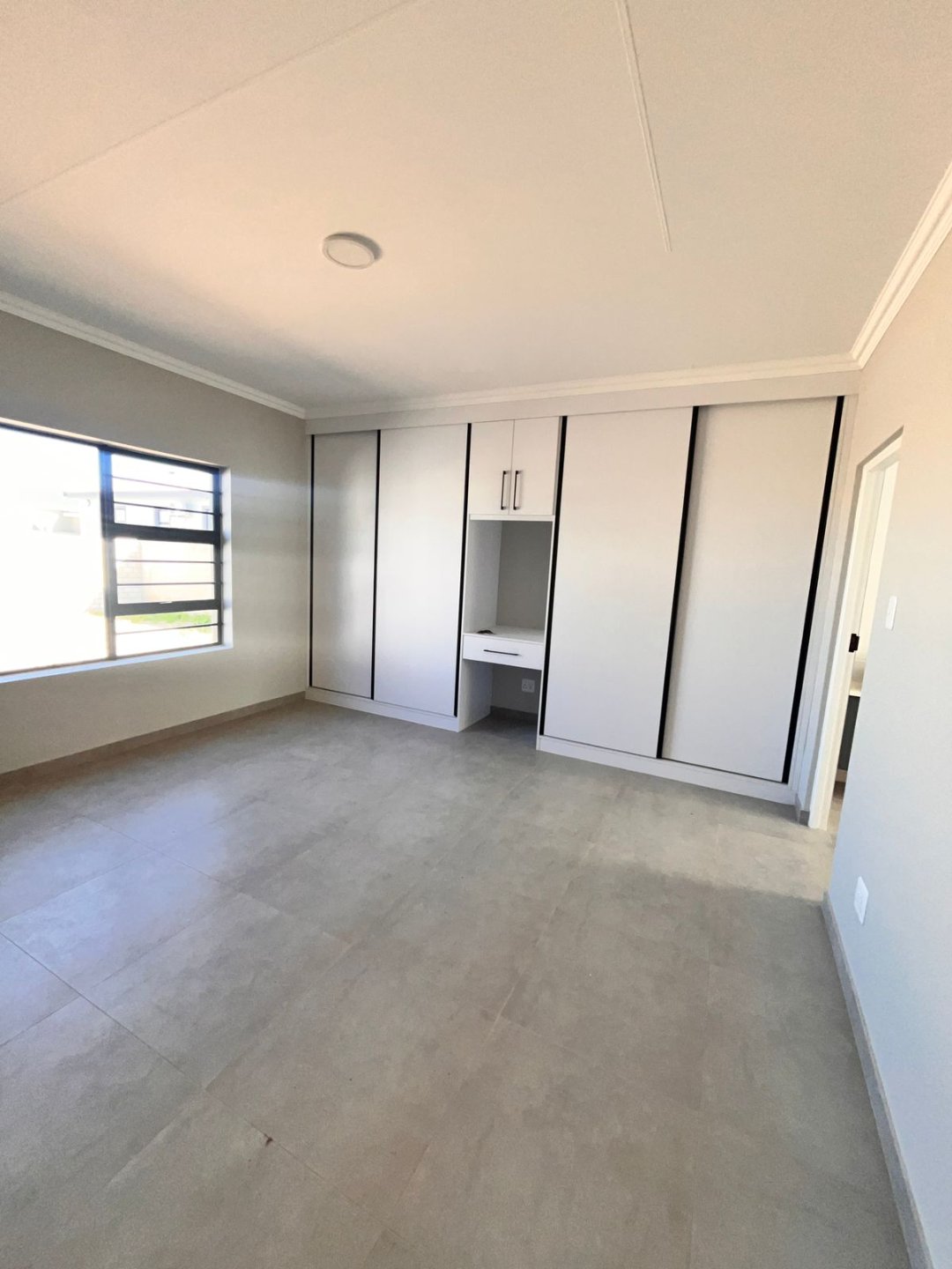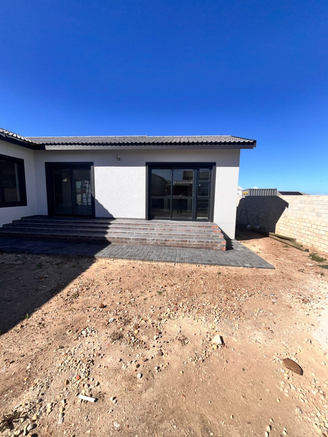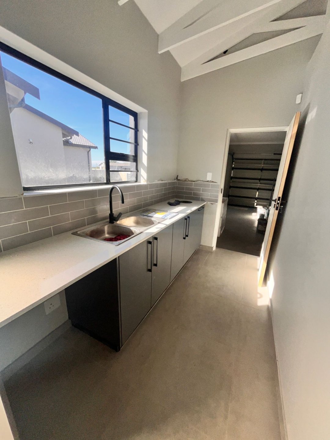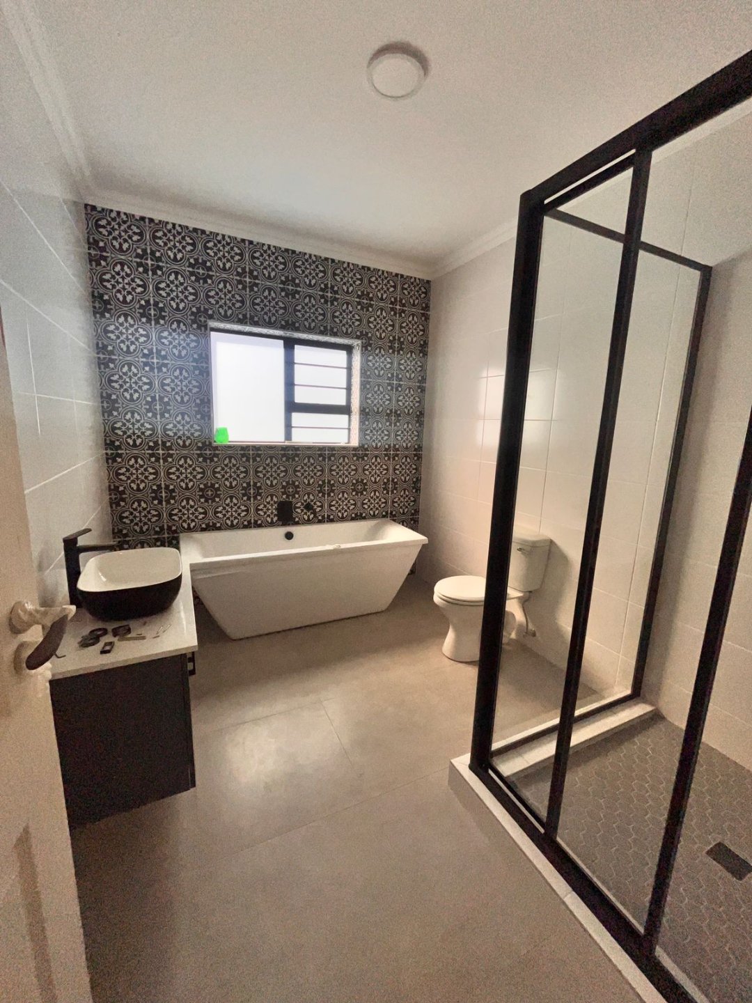The property includes a gas geyser and gas stove. The open-plan lounge, dining room, and braai room have glass sliding doors that open onto a fully enclosed garden.