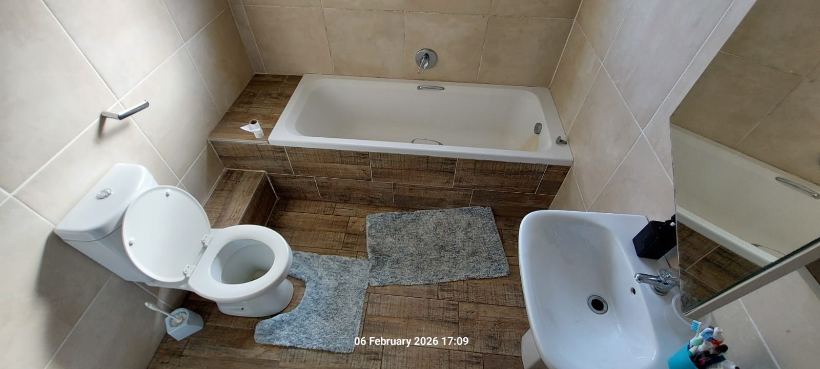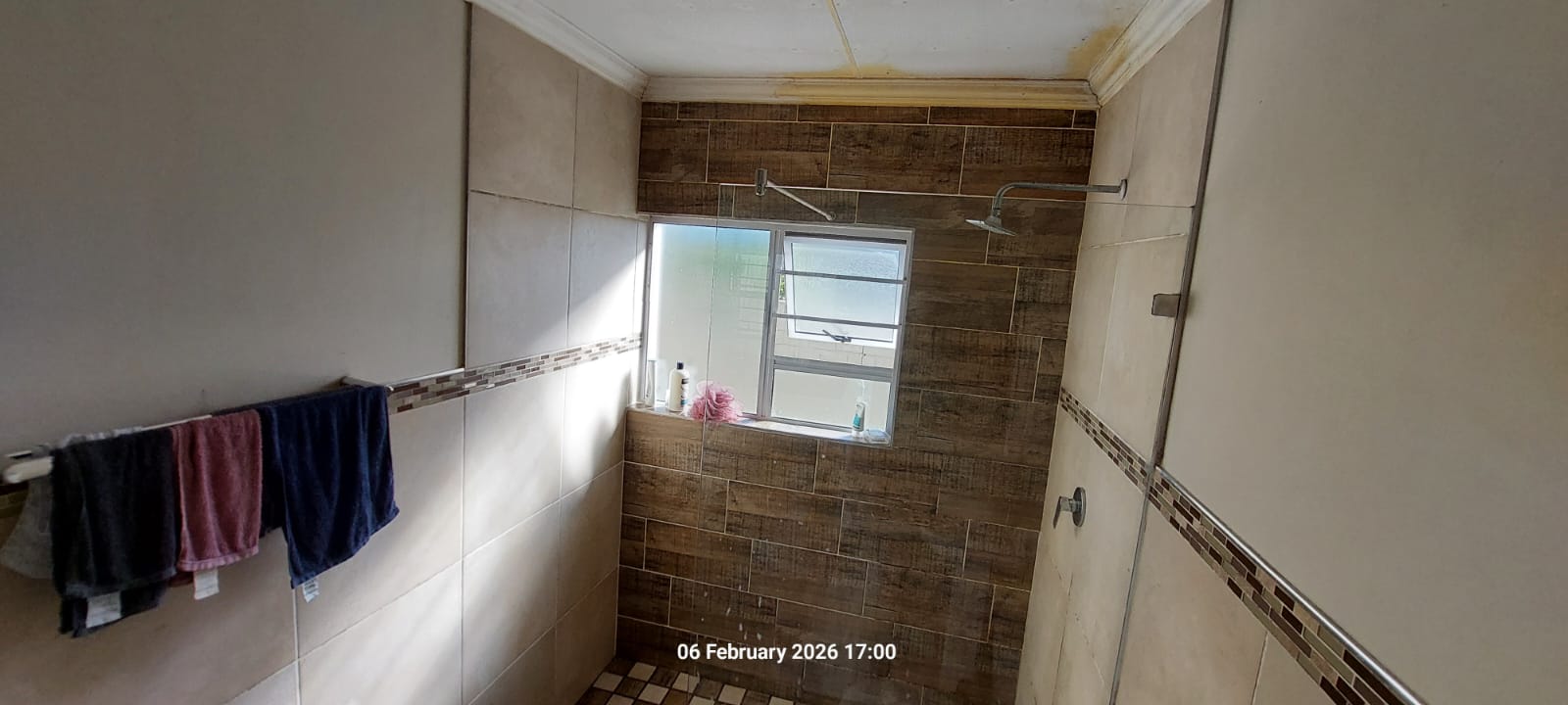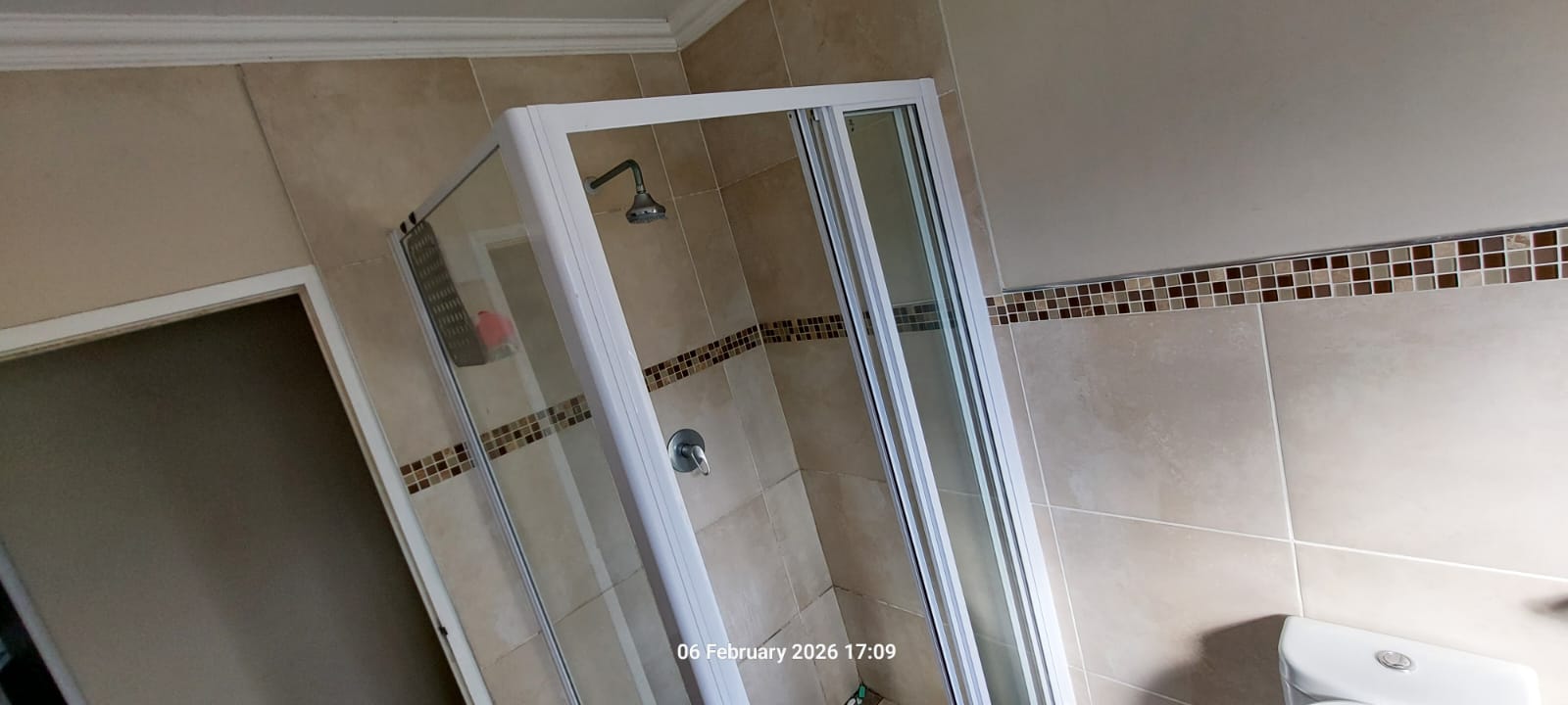 Accommodation includes three well-sized bedrooms, all tiled and fitted with built-in cupboards. The main bedroom features a private en-suite bathroom with a shower, toilet, and basin. A full family bathroom offers a bath, shower, toilet, and basin, ideal for everyday family living.