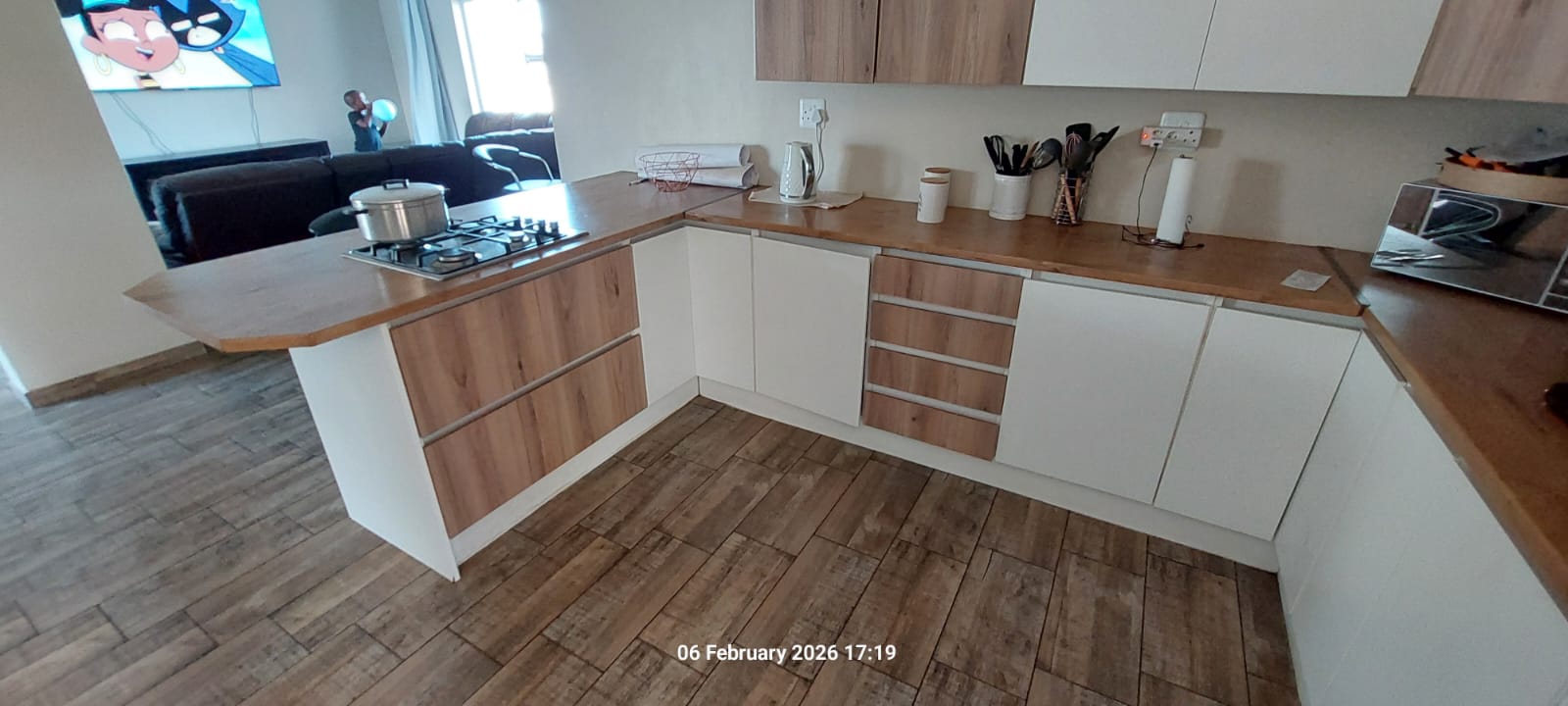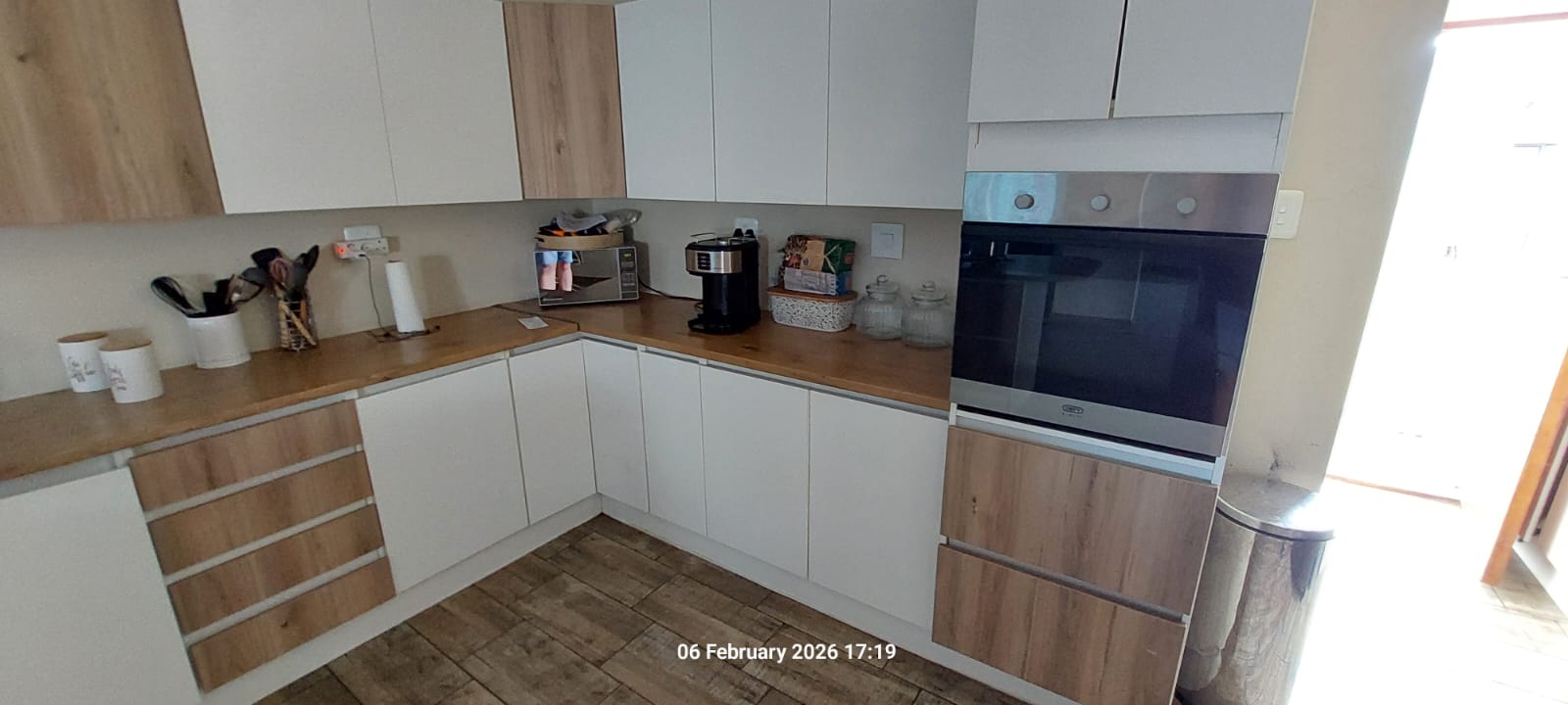 The kitchen and dining area is functional and well laid out, fitted with built-in cupboards, melamine countertops, an eye-level oven, and a gas hob, with a separate scullery providing additional storage and workspace.