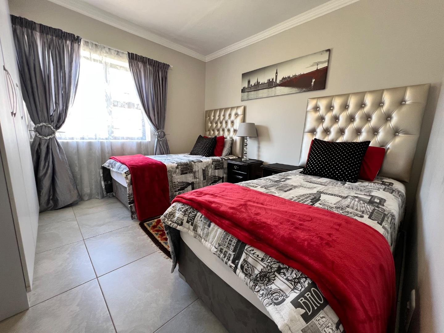 The property is on one level and wheelchair friendly. The open floor plan offers a lounge, dining area and modern kitchen with plumbing for dishwasher and top loader washing machine. Fitted with a gas hob and under counter electric oven, huge pantry and a custom built bar island on wheels.
