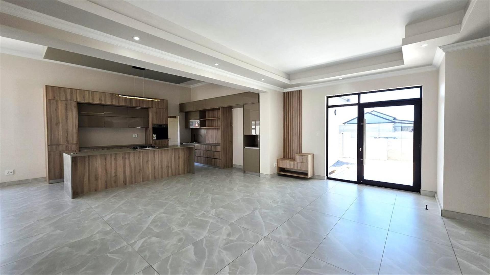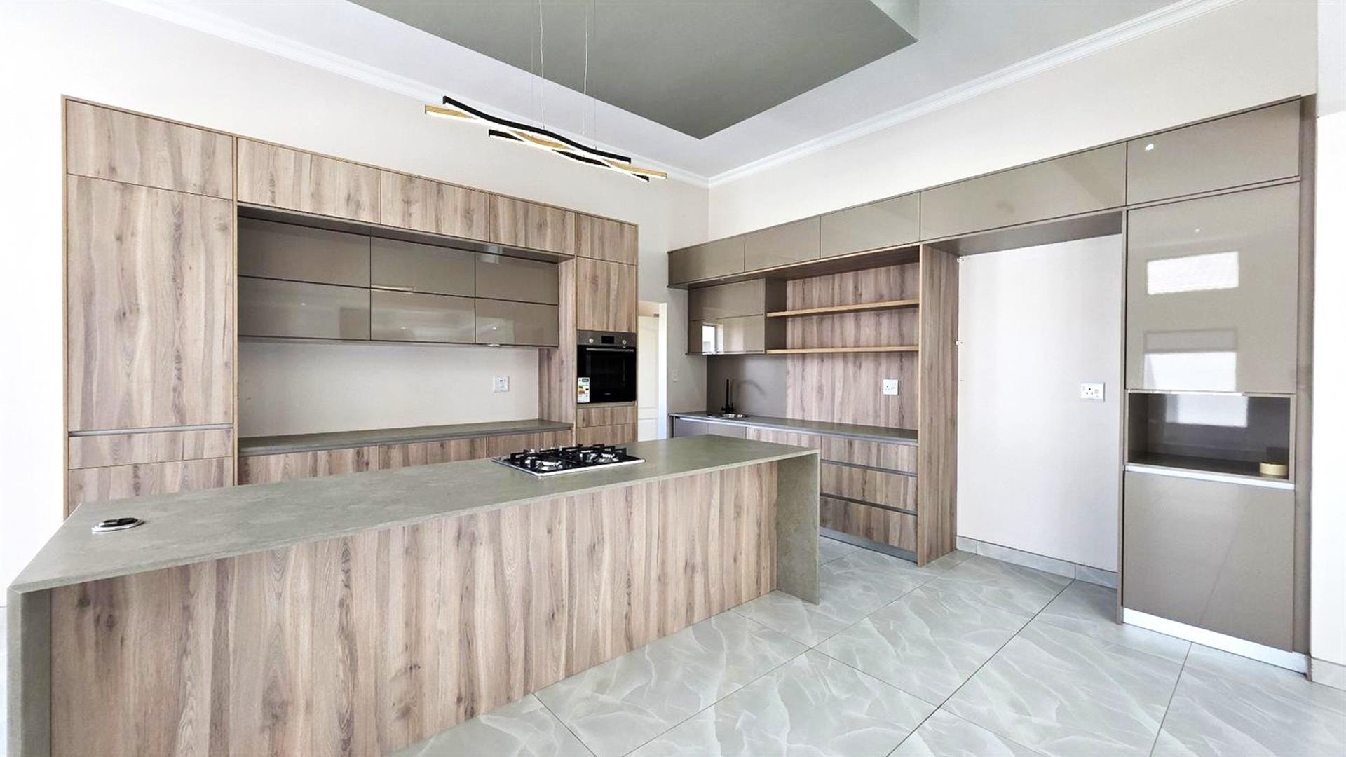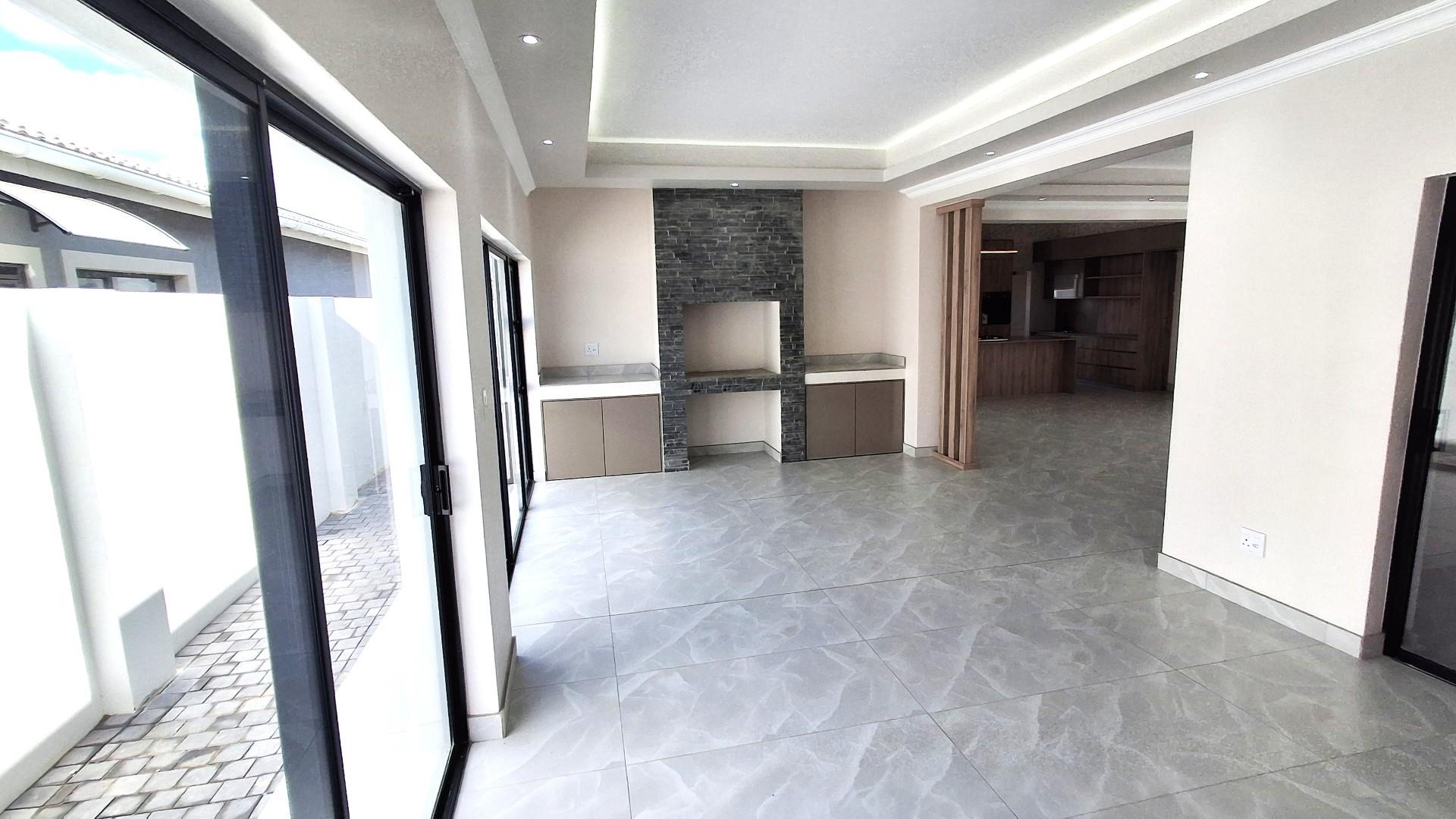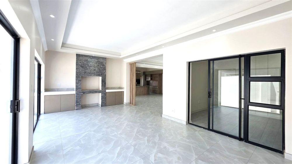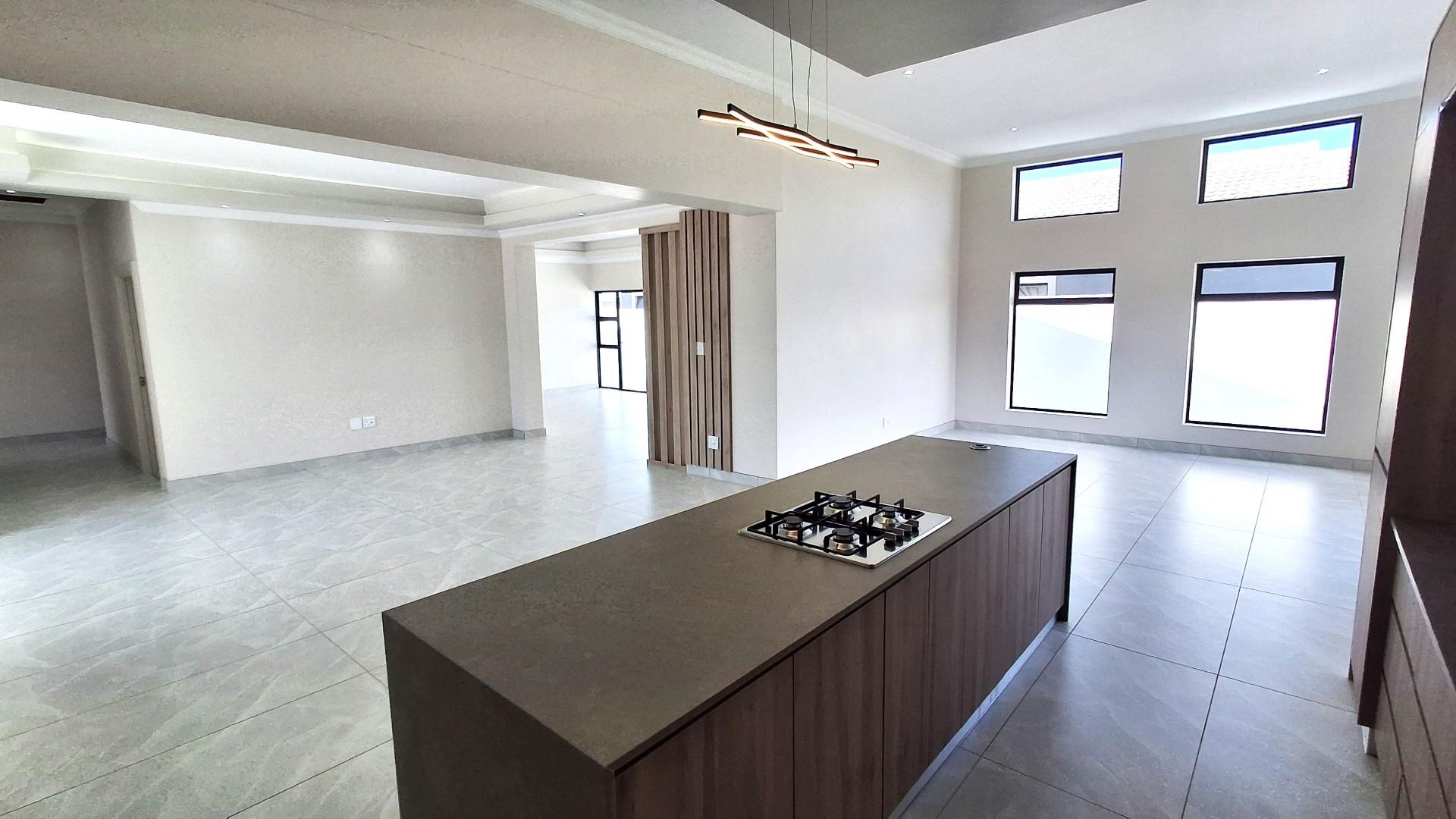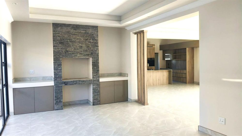 The open-plan living area flows between the lounge, dining space, and dedicated indoor braai/entertainment room, creating an inviting environment for everyday living and entertaining. The designer kitchen features soft-touch cupboards, modern finishes, a gas stove, and a separate scullery.